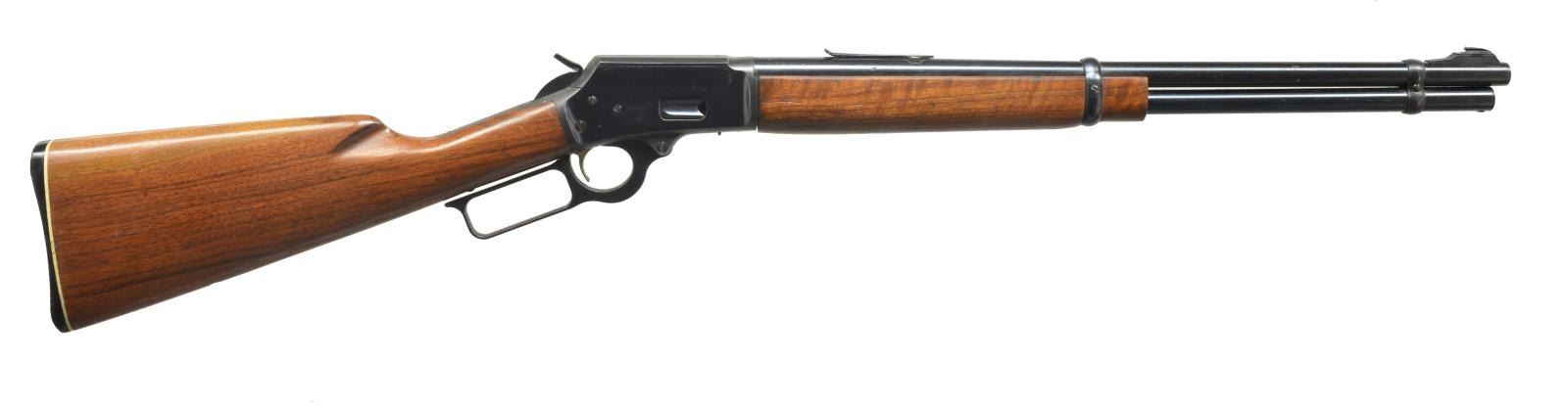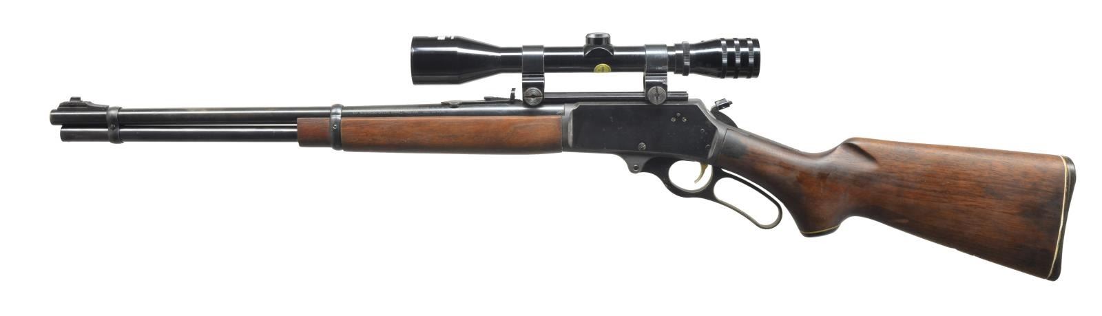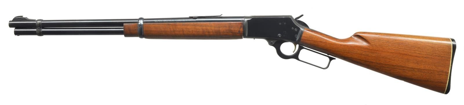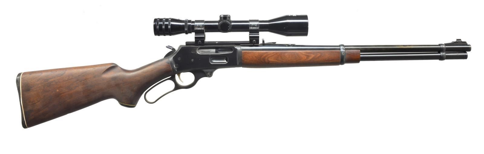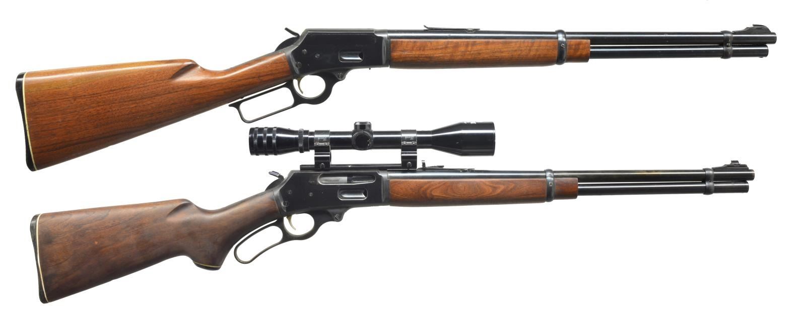 1) MODEL 1894. Cal. 44 Rem. Mag. S# 72074149. Bbl. 20" w/ Micro-groove rifling. Ramp mounted bead front sight & broken sporting rear sight. Full length mag. Blue finish w/ gold finished trigger. Action is drilled for scope attachment. Walnut forearm & straight grip stock w/ plastic buttplate & white line spacer. CONDITION: 98% blue showing sm. handling marks. Original wood finish shows scattered scratches & marks. Bright bore has near excellent rifling. (20-3447/DS). 2) MODEL 336. Cal. 35 Rem. S# 25139394. Bbl. 20" w/ Micro-groove rifling & sporting sights. Full length mag. Armsport 4x40 Waterproof gloss finished scope w/ duplex reticle on Weaver see through mts. Gold finished trigger. Walnut forearm & straight grip stock w/ plastic grip cap & buttplate having white line spacers. Toeline of stock has open holes for sling base & Marlin trademark. CONDITION: over 70% blue showing light wear w/ scattered spots of pitting & corrosion. Wood has dark worn appearance showing a few marks. Bright bore w/ strong rifling. (20-3459/DS). ALL MODERN. $650-1,000.