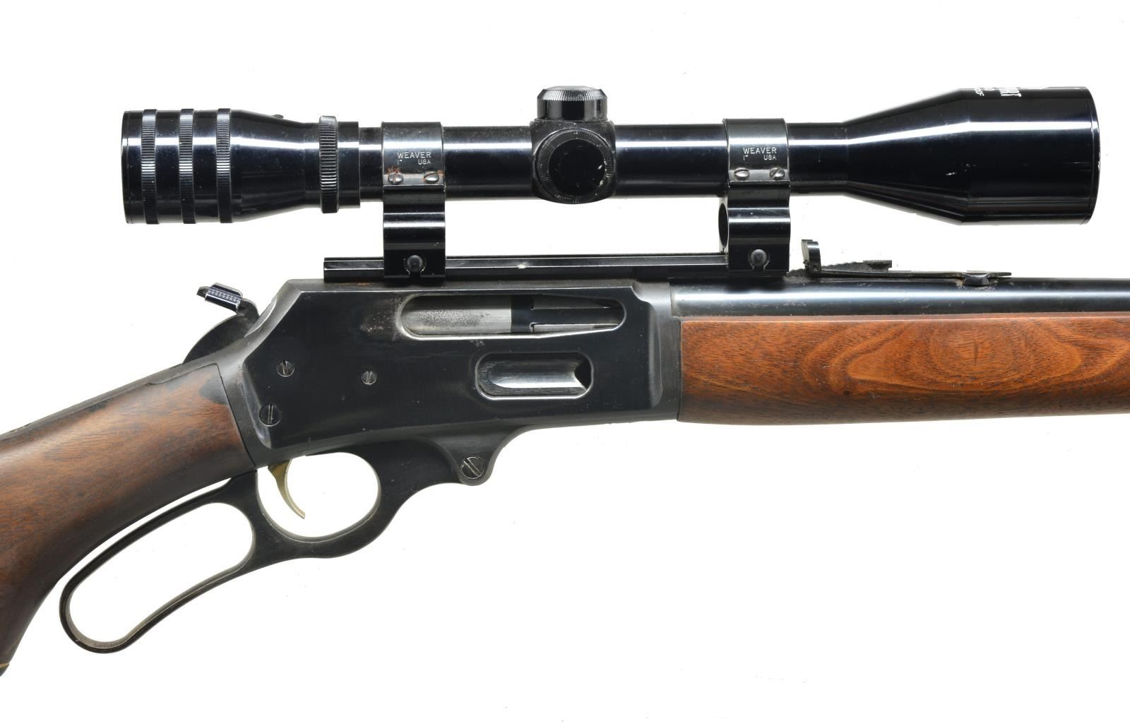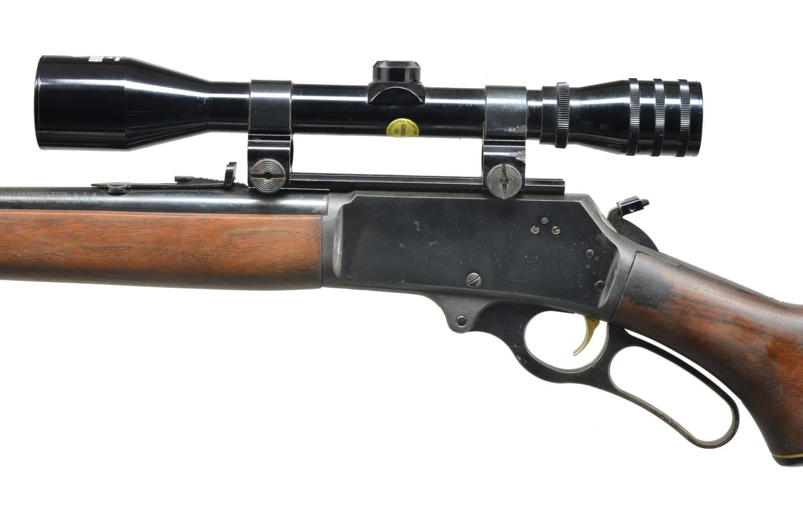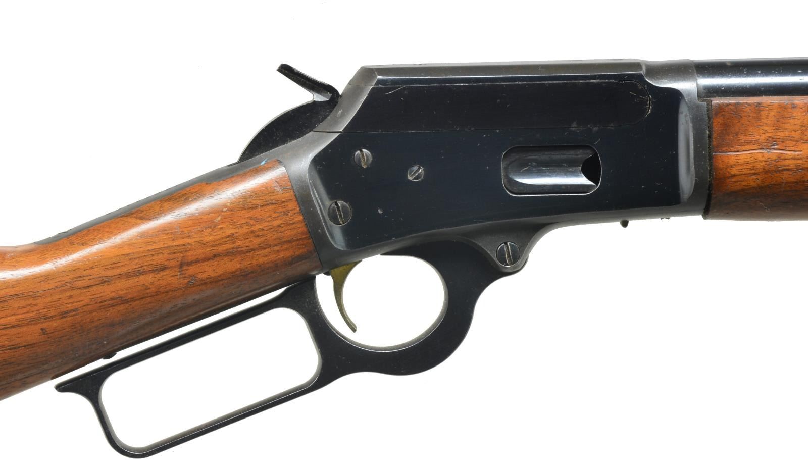1) MODEL 1894. Cal. 44 Rem. Mag. S# 72074149. Bbl. 20" w/ Micro-groove rifling. Ramp mounted bead front sight & broken sporting rear sight. Full length mag. Blue finish w/ gold finished trigger. Action is drilled for scope attachment. Walnut forearm & straight grip stock w/ plastic buttplate & white line spacer. CONDITION: 98% blue showing sm. handling marks. Original wood finish shows scattered scratches & marks. Bright bore has near excellent rifling. (20-3447/DS). 2) MODEL 336. Cal. 35 Rem. S# 25139394. Bbl. 20" w/ Micro-groove rifling & sporting sights. Full length mag. Armsport 4x40 Waterproof gloss finished scope w/ duplex reticle on Weaver see through mts. Gold finished trigger. Walnut forearm & straight grip stock w/ plastic grip cap & buttplate having white line spacers. Toeline of stock has open holes for sling base & Marlin trademark. CONDITION: over 70% blue showing light wear w/ scattered spots of pitting & corrosion. Wood has dark worn appearance showing a few marks. Bright bore w/ strong rifling. (20-3459/DS). ALL MODERN. $650-1,000.