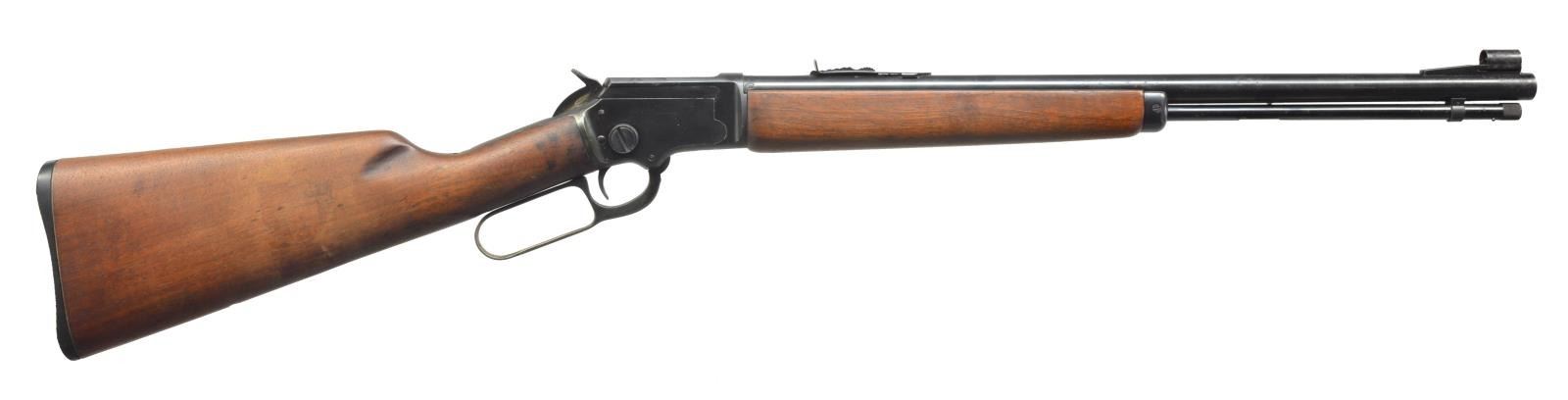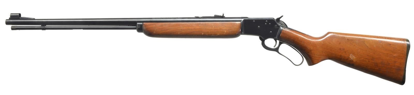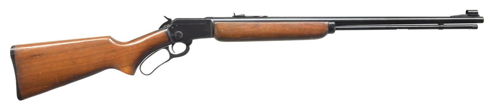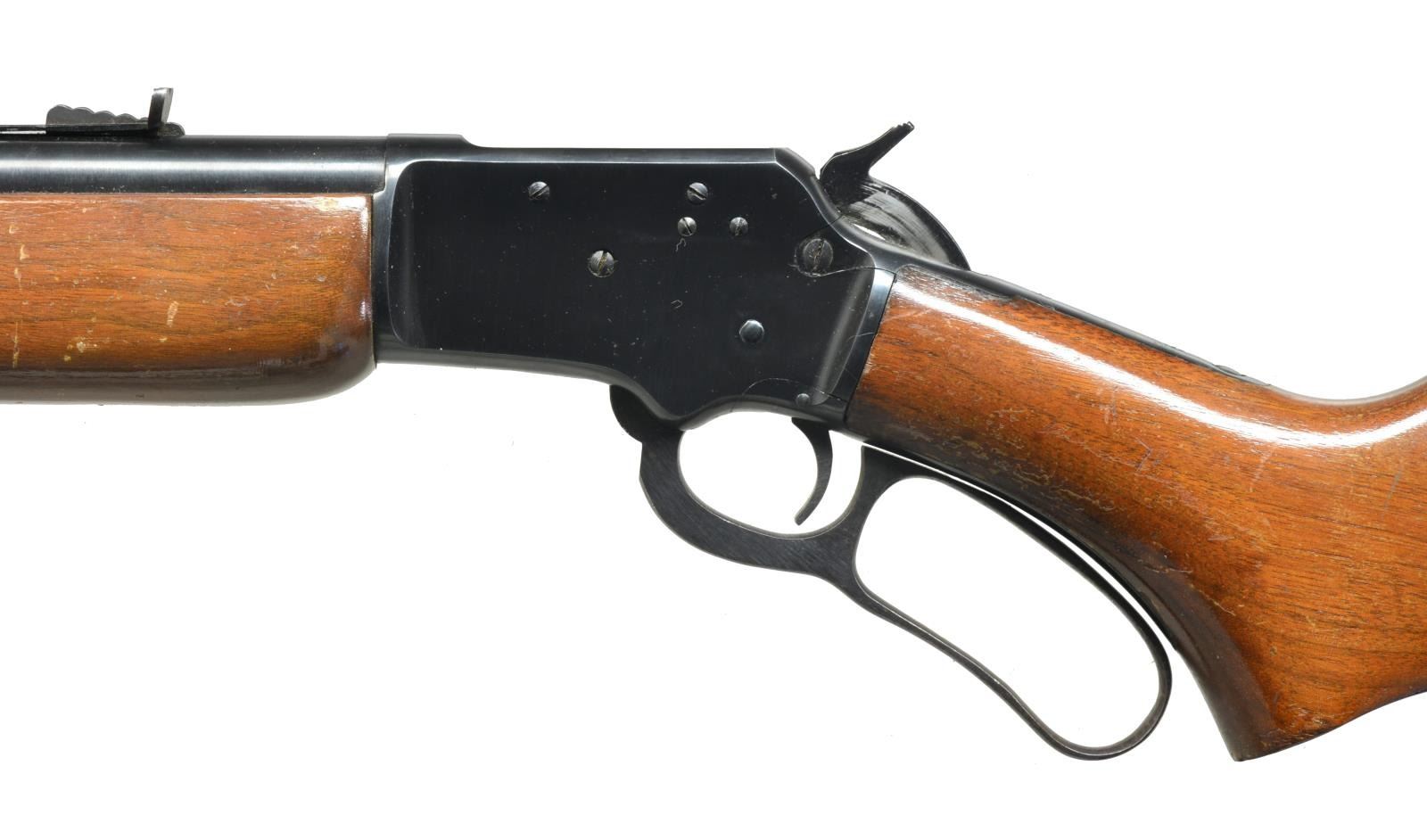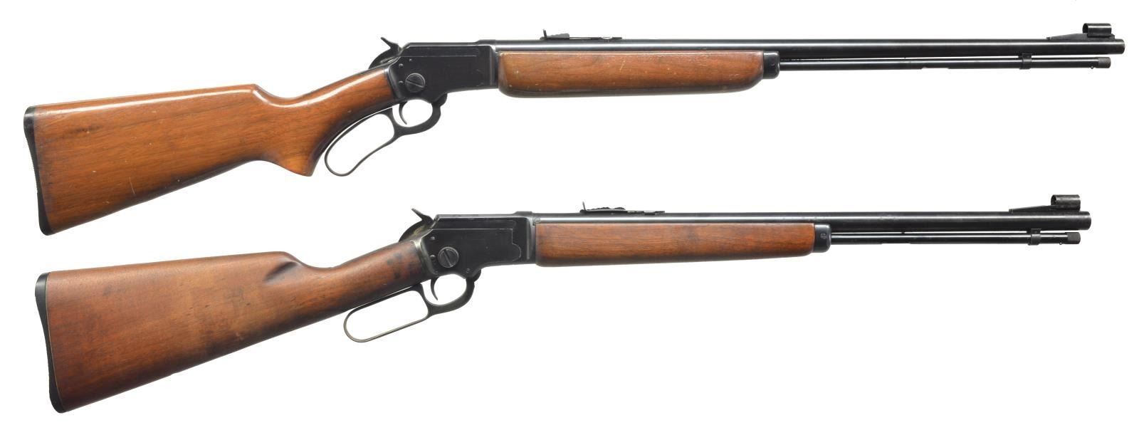 ALL: cal. 22 S, L, LR. 1) S# D10368. Bbl. 24" rnd. Screw on ramp front, dovetail gold bead sight & hood. Dovetail adjustable rear sight. Uncheckered beavertail forend. Uncheckered pistol grip stock w/ black hard rubber buttplate. Toe line has Marlin Bullseye. CONDITION: bbl. has original blue w/ minor muzzle wear & some spots of minor oxidation. Receiver has original blue w/ sharp edge wear. Forend has original finish w/ numerous nicks & sm. scratches. Buttstock has original finish w/ some minor handling marks. Bore is very good. (20-3595/BT). 2) S# L14737. Bbl. 20". Screw on ramp front w/ dovetail bead sight & hood. Dovetail adjustable rear. Uncheckered forearm. Uncheckered straight grip stock w/ Marlin hard rubber buttplate w/ white line spacer. Toe line has vacant hole that would have had Marlin Bullseye in it. CONDITION: bbl. & mag. tube have good original blue w/ some areas of fine surface oxidation. Receiver has good original blue w/ sharp edge wear. Forend has original finish w/ a few minor handling marks. Buttstock has a cleaned original finish w/ hand worn patina in grip area. Bore is very good. (20-3596/BT). BOTH CURIO. $700-1,000.