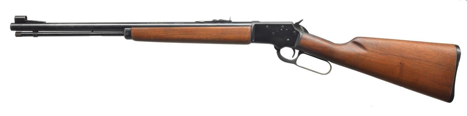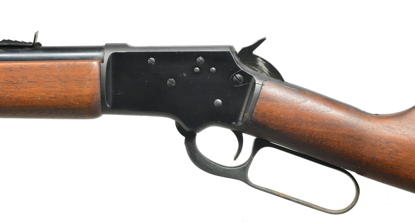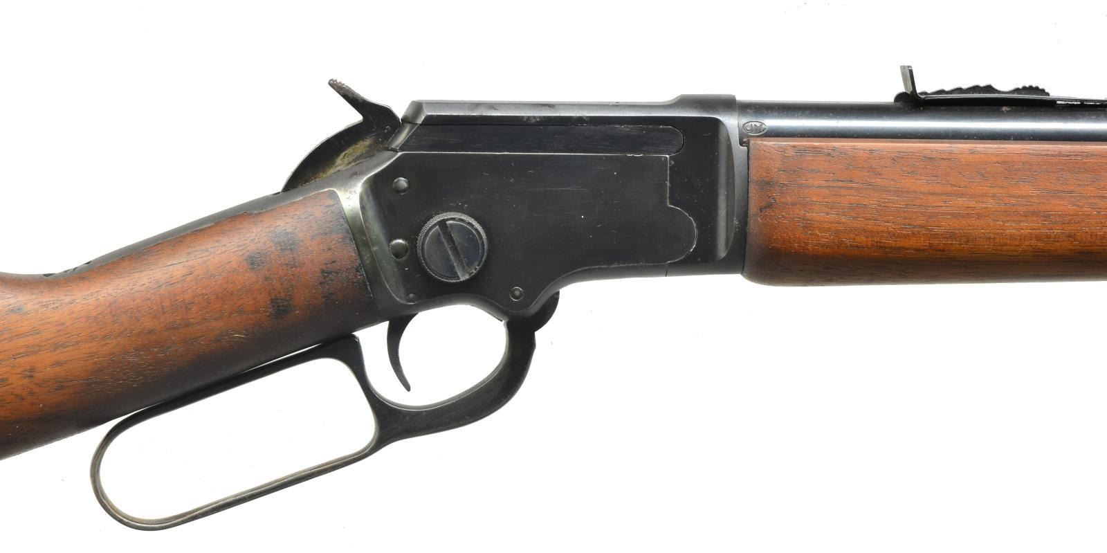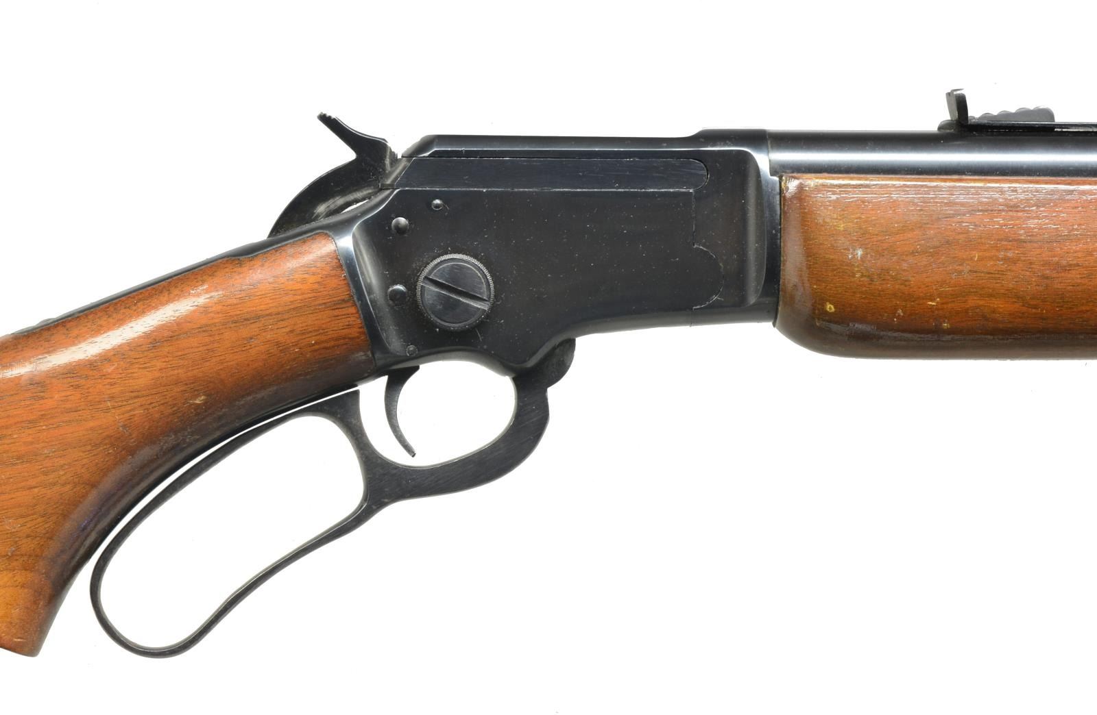 ALL: cal. 22 S, L, LR. 1) S# D10368. Bbl. 24" rnd. Screw on ramp front, dovetail gold bead sight & hood. Dovetail adjustable rear sight. Uncheckered beavertail forend. Uncheckered pistol grip stock w/ black hard rubber buttplate. Toe line has Marlin Bullseye. CONDITION: bbl. has original blue w/ minor muzzle wear & some spots of minor oxidation. Receiver has original blue w/ sharp edge wear. Forend has original finish w/ numerous nicks & sm. scratches. Buttstock has original finish w/ some minor handling marks. Bore is very good. (20-3595/BT). 2) S# L14737. Bbl. 20". Screw on ramp front w/ dovetail bead sight & hood. Dovetail adjustable rear. Uncheckered forearm. Uncheckered straight grip stock w/ Marlin hard rubber buttplate w/ white line spacer. Toe line has vacant hole that would have had Marlin Bullseye in it. CONDITION: bbl. & mag. tube have good original blue w/ some areas of fine surface oxidation. Receiver has good original blue w/ sharp edge wear. Forend has original finish w/ a few minor handling marks. Buttstock has a cleaned original finish w/ hand worn patina in grip area. Bore is very good. (20-3596/BT). BOTH CURIO. $700-1,000.