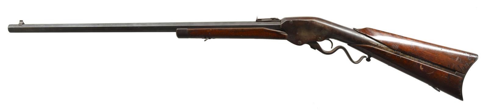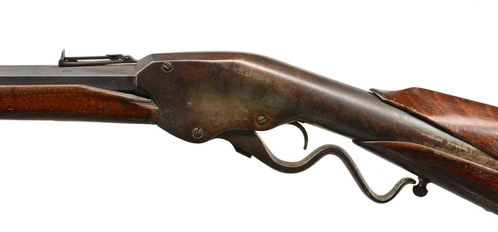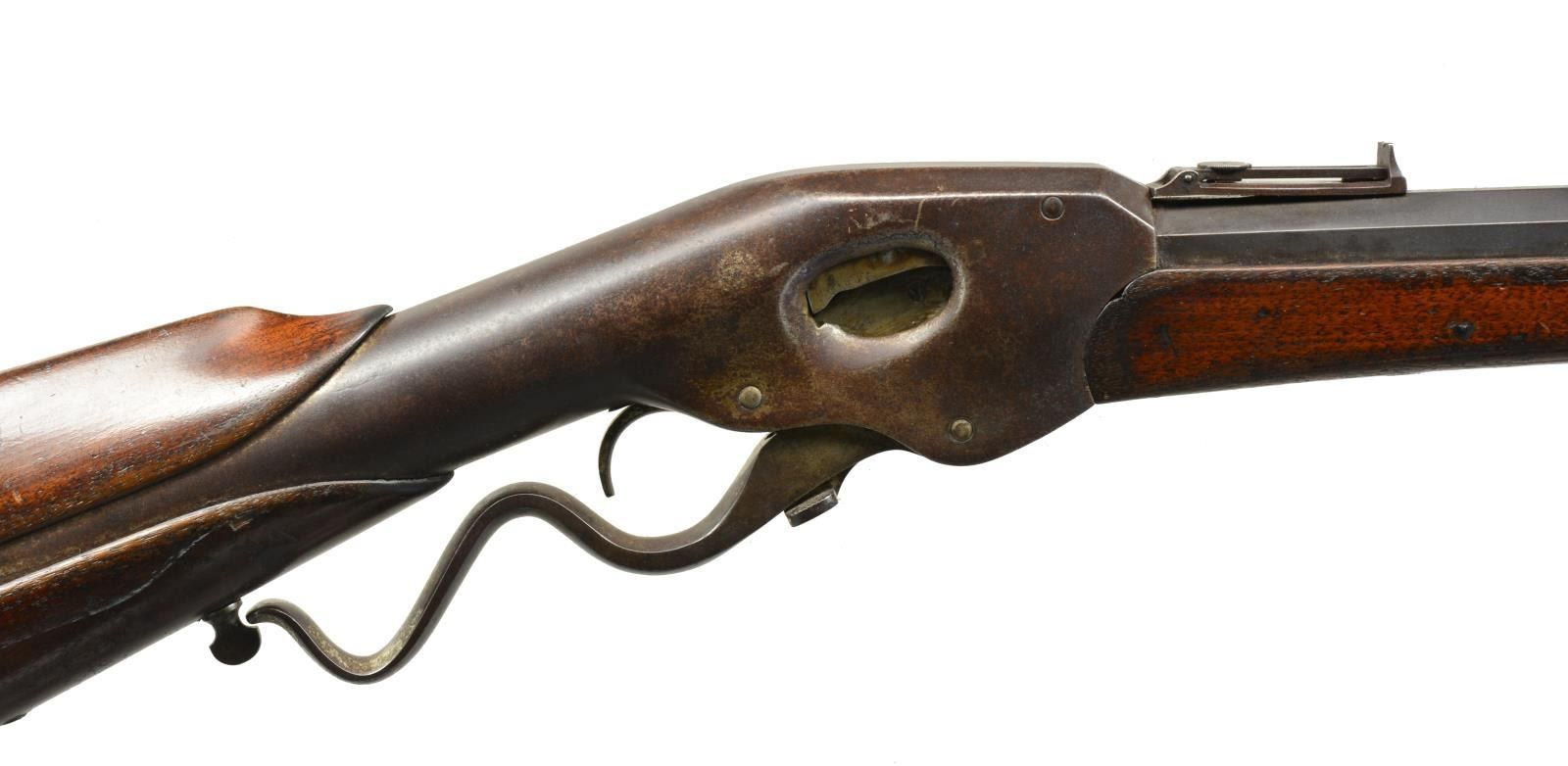 Cal. 44 Evans. S# 1768. Bbl. 28" oct. Blade front sight & folding leaf peep rear sight. Unusual lever action repeating rifle w/ a revolving mag. that loads through butt. Iron capped forearm & 2 piece walnut stock w/ inletted swivels. Approx. 12,200 Mfg. 1873-1879 in Mechanic Falls, Maine. CONDITION: metal finish has faded to a dark brown patina showing scattered surface corrosion. Forearm has lg. chip on left side. Upper stock has lg. chip on left side. Wood has added finish over numerous dents & handling marks. Action is not cocking or operating properly. (01-17731/DS). ANTIQUE. $700-1,000.