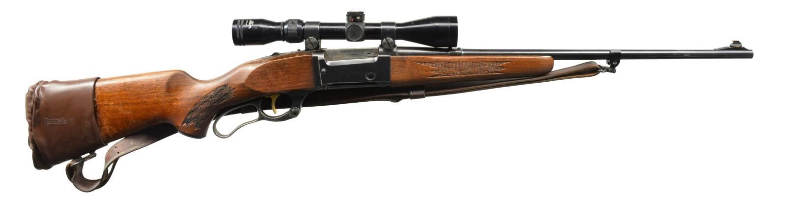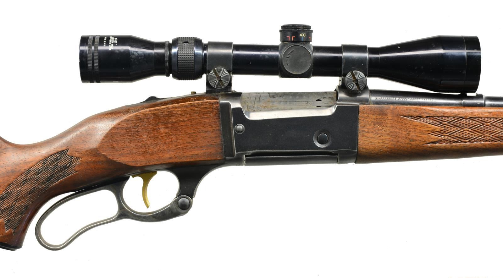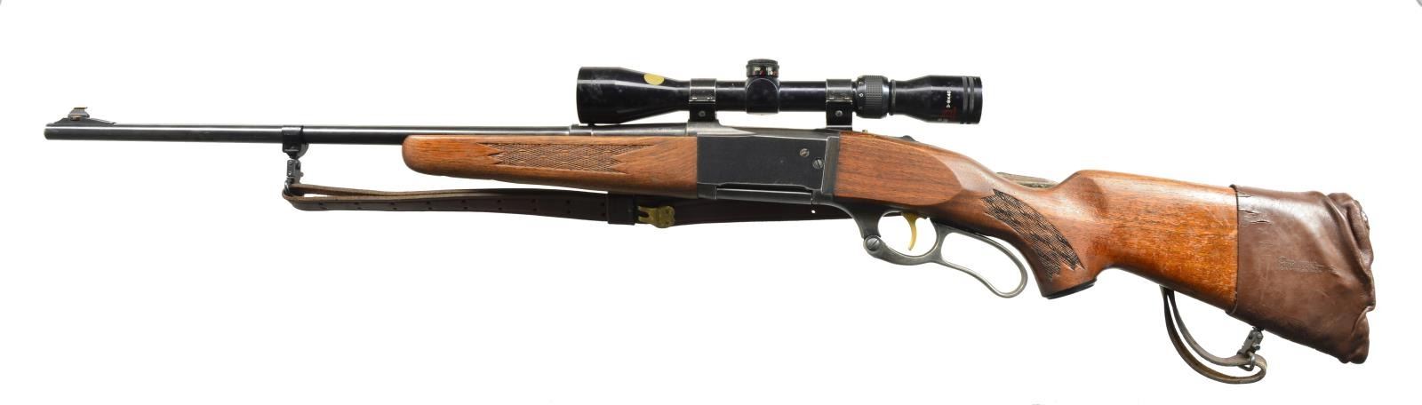 Cal. 308 Win. S# 1139442. Bbl. 22" w/ ramp mounted bead front sight & open dovetail for rear sight. Tasco 3-9x40 gloss finished scope w/ duplex reticle on Weaver mts. Case colored lever, gold finished trigger & sliding top tang safety. Forearm & capped pistol grip walnut stock w/ pressed checkering. Stock has added Pachmayr slip on pad. Military style leather sling on aftermarket QD swivels. CONDITION: over 80% blue showing carry wear. Stock has worn peeling finish showing sm. marks. Pachmayr slip on pad is crushed & hardened w/ age. Bore shows spots of pitting. Scope has good optics. (20-2795/DS). MODERN. $400-600.
