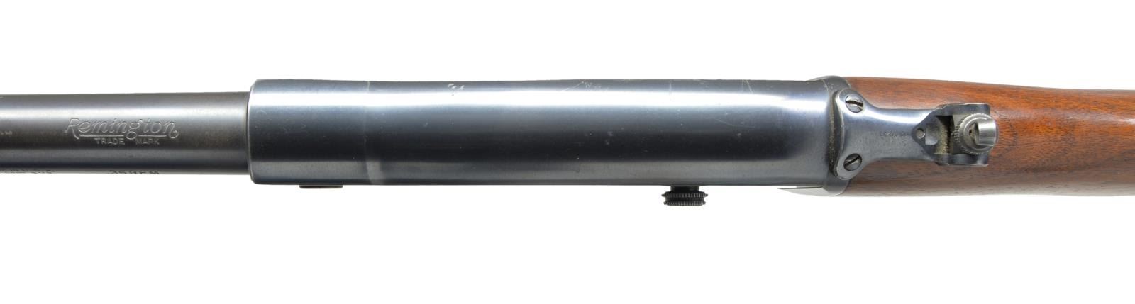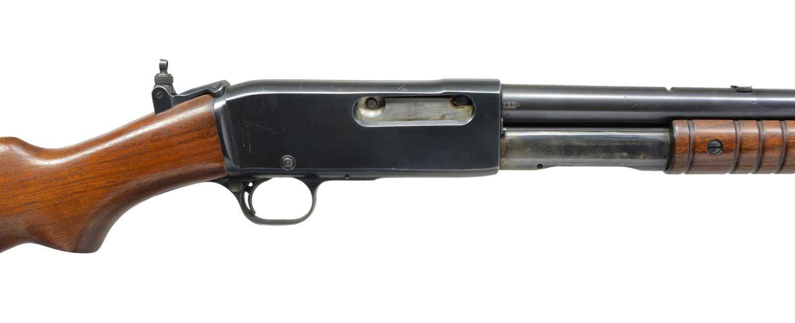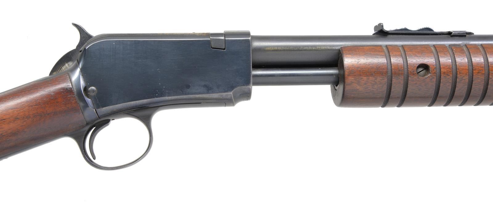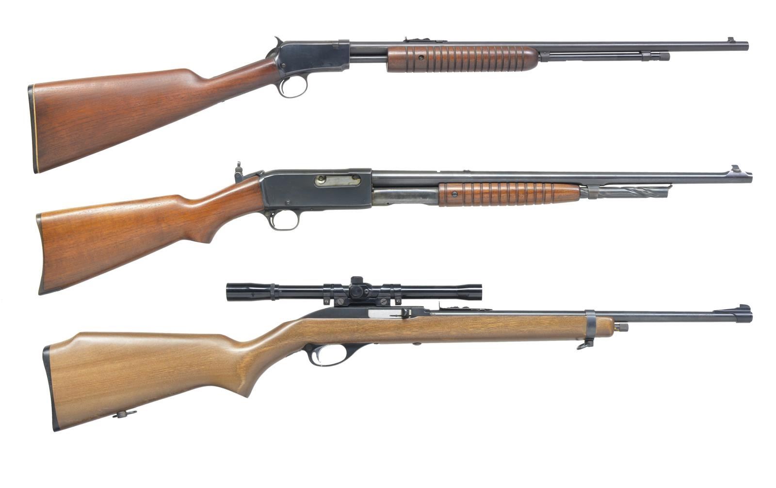 RIFLES. 1) WINCHESTER MODEL 62 PUMP. Cal. 22 S, L, LR. S# 186804. Bbl. 23" rnd. w/ original sporting sights. Tubular mag. Lg. rnd. grooved forearm & straight grip walnut stock w/ plastic buttplate & added white line spacer. CONDITION: over 90% original blue. Wood shows scattered scratches & marks. 1 Forend screw is missing. Bore is bright w/ strong rifling showing a few sm. spots. (19-5449/DS). CURIO. 2) REMINGTON MODEL 14 PUMP. Cal. 35 Rem. S# 103934. Bbl. 22" rnd. Ramp mounted bead front sight, filler in rear dovetail w/ Lyman tang sight. Tubular mag. Grooved walnut forearm & pistol grip stock w/ grooved steel buttplate. CONDITION: 80% lightly worn blue showing scratches & marks. Forearm has lightly worn finish showing marks. Stock is heavily sanded & refinished. Bore is bright w/ sharp rifling. (19-5456/DS). CURIO. 3) MARLIN GLENFIELD MODEL 75 AUTOLOADING RIFLE. Cal. 22 LR. S# 70237082. Bbl. 18" rnd. w/ band mounted blade front sight & elevator adj. sporting rear sight. Glenfield 4x gloss finished scope w/ standard crosshairs on tip off mts. Tubular mag. Band fastened carbine style hardwood stock w/ plastic buttplate & sling swivels. CONDITION: over 90% metal finish w/ bbl. showing spots of freckling. Stock has good original finish showing sm. marks. Bright bore w/ sound Micro-groove rifling. Scope has clear optics. (19-5481/DS). MODERN. $650-1,000.