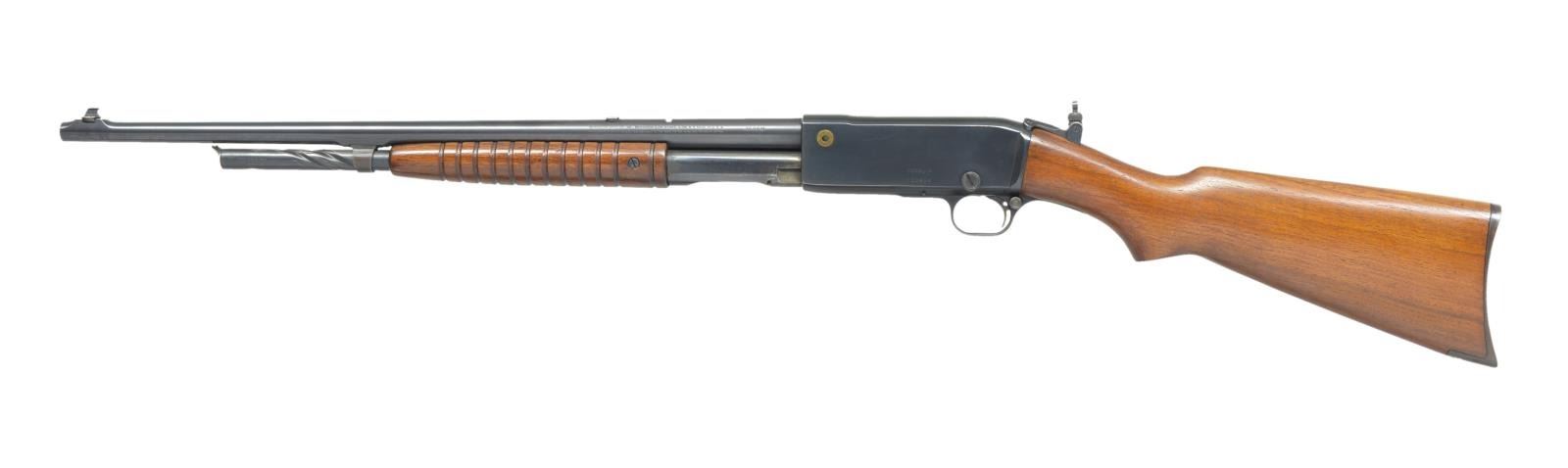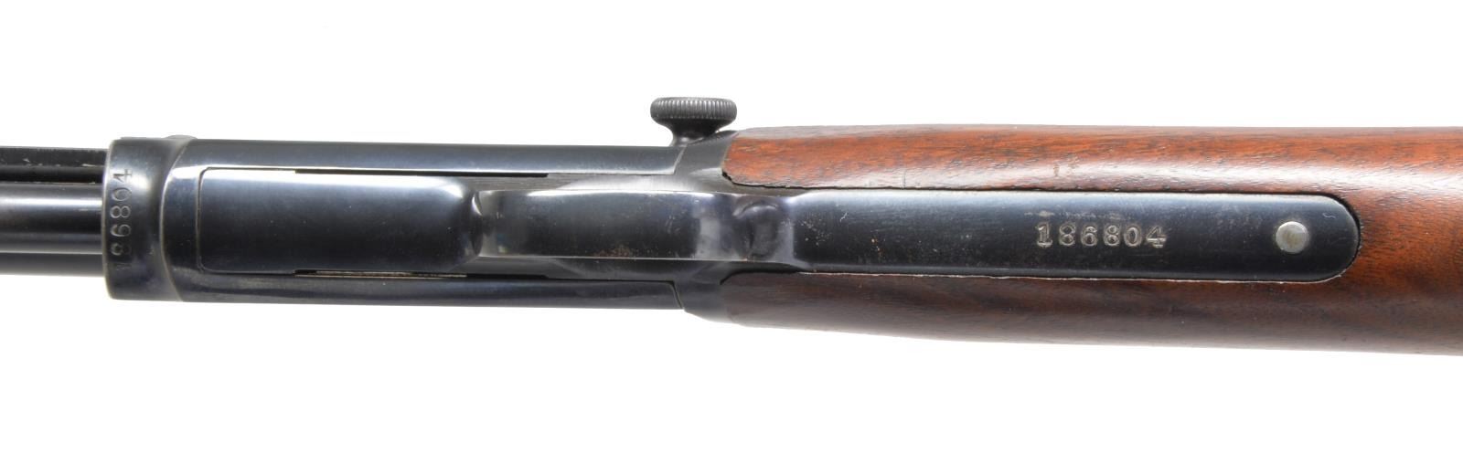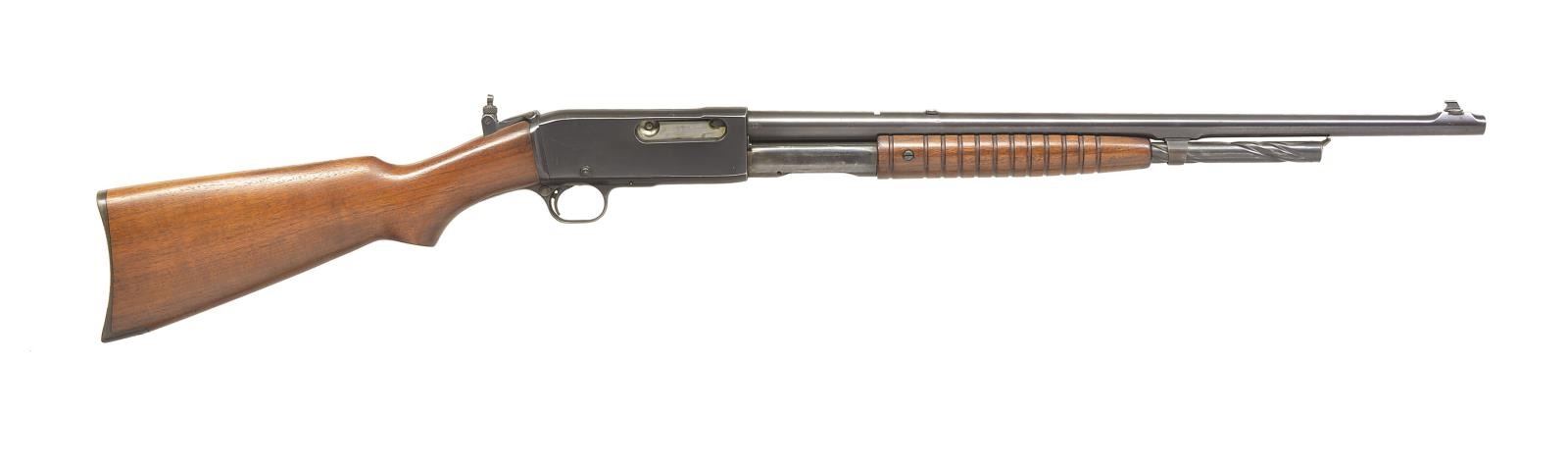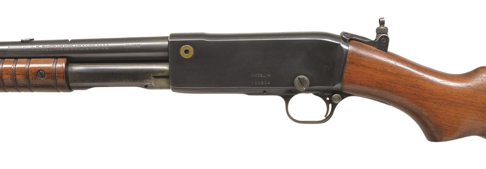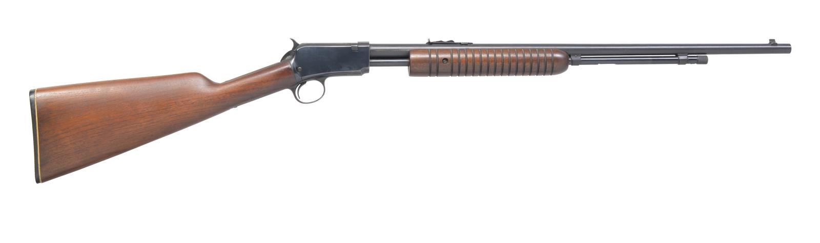 RIFLES. 1) WINCHESTER MODEL 62 PUMP. Cal. 22 S, L, LR. S# 186804. Bbl. 23" rnd. w/ original sporting sights. Tubular mag. Lg. rnd. grooved forearm & straight grip walnut stock w/ plastic buttplate & added white line spacer. CONDITION: over 90% original blue. Wood shows scattered scratches & marks. 1 Forend screw is missing. Bore is bright w/ strong rifling showing a few sm. spots. (19-5449/DS). CURIO. 2) REMINGTON MODEL 14 PUMP. Cal. 35 Rem. S# 103934. Bbl. 22" rnd. Ramp mounted bead front sight, filler in rear dovetail w/ Lyman tang sight. Tubular mag. Grooved walnut forearm & pistol grip stock w/ grooved steel buttplate. CONDITION: 80% lightly worn blue showing scratches & marks. Forearm has lightly worn finish showing marks. Stock is heavily sanded & refinished. Bore is bright w/ sharp rifling. (19-5456/DS). CURIO. 3) MARLIN GLENFIELD MODEL 75 AUTOLOADING RIFLE. Cal. 22 LR. S# 70237082. Bbl. 18" rnd. w/ band mounted blade front sight & elevator adj. sporting rear sight. Glenfield 4x gloss finished scope w/ standard crosshairs on tip off mts. Tubular mag. Band fastened carbine style hardwood stock w/ plastic buttplate & sling swivels. CONDITION: over 90% metal finish w/ bbl. showing spots of freckling. Stock has good original finish showing sm. marks. Bright bore w/ sound Micro-groove rifling. Scope has clear optics. (19-5481/DS). MODERN. $650-1,000.