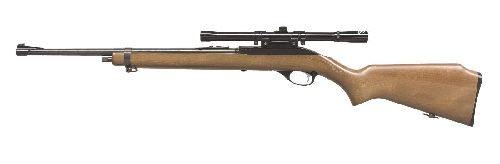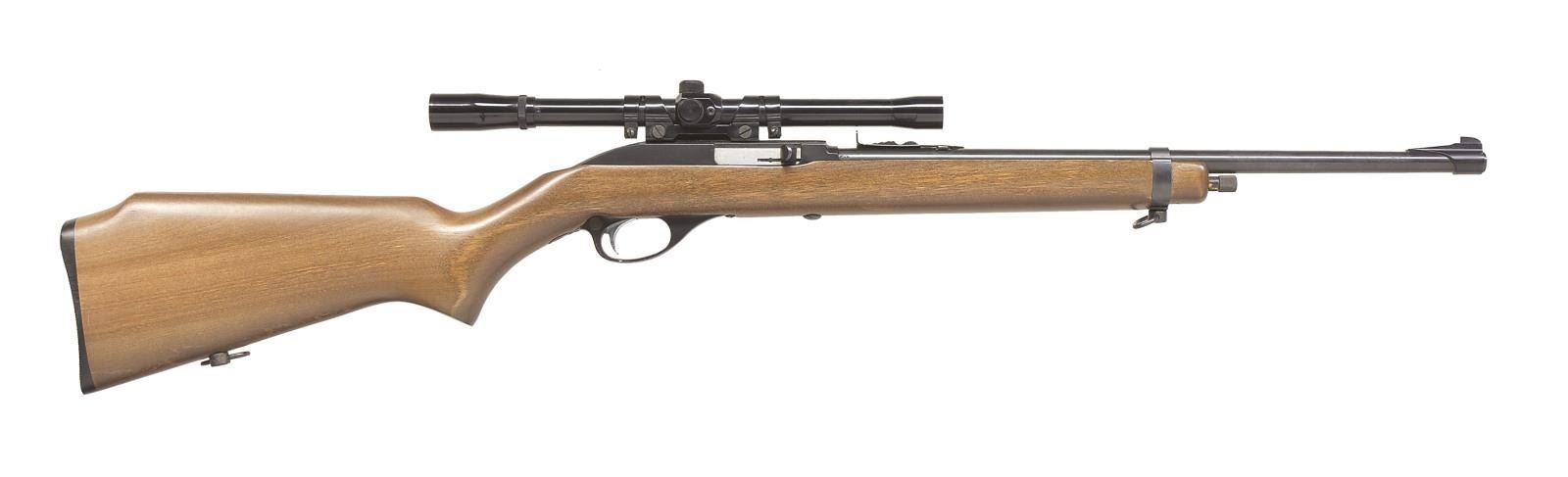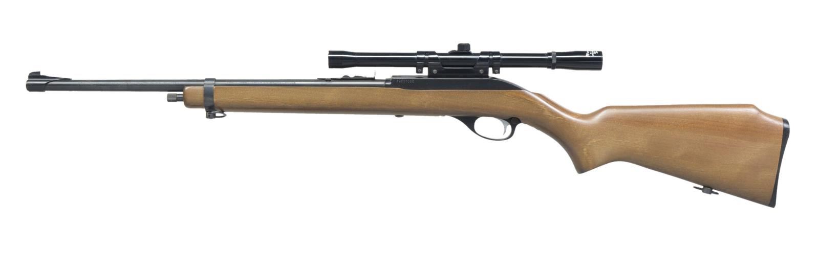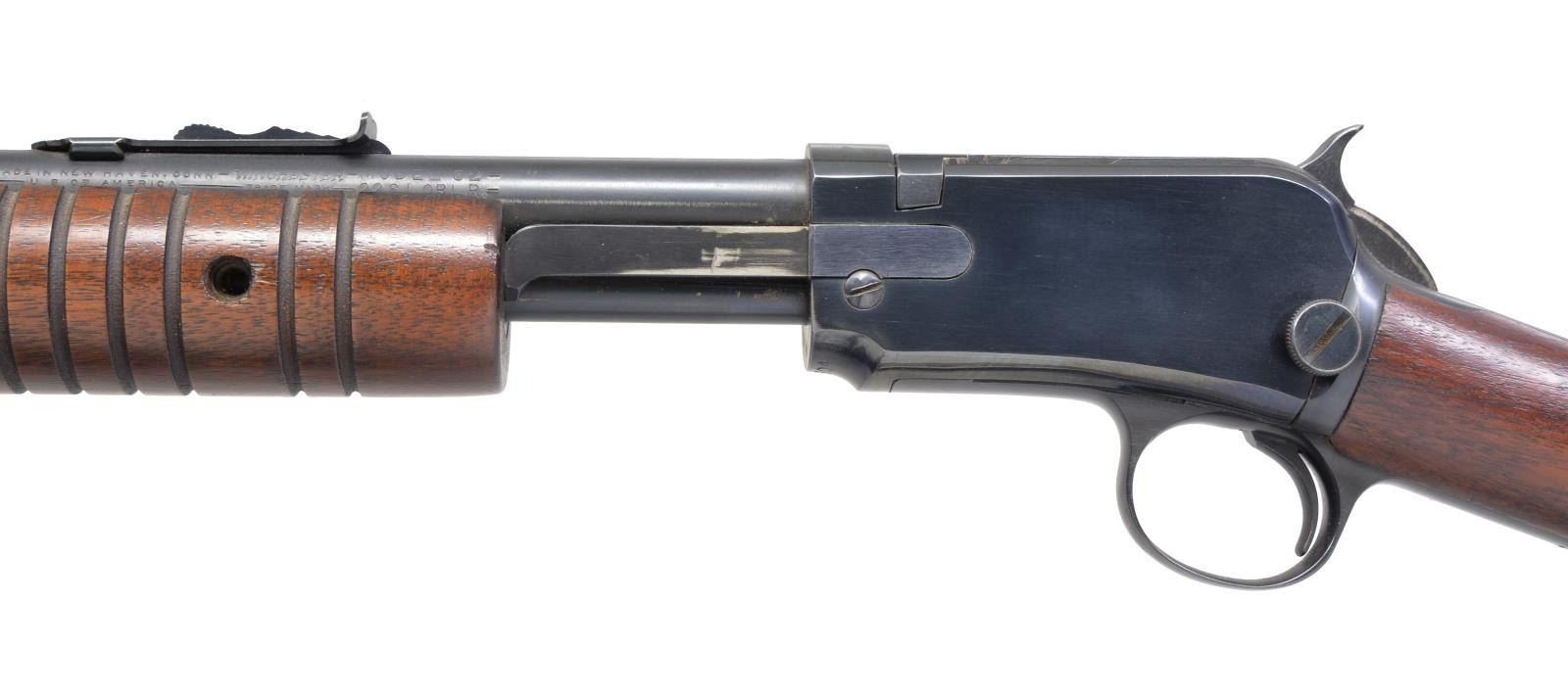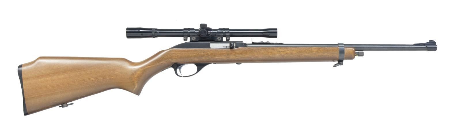 RIFLES. 1) WINCHESTER MODEL 62 PUMP. Cal. 22 S, L, LR. S# 186804. Bbl. 23" rnd. w/ original sporting sights. Tubular mag. Lg. rnd. grooved forearm & straight grip walnut stock w/ plastic buttplate & added white line spacer. CONDITION: over 90% original blue. Wood shows scattered scratches & marks. 1 Forend screw is missing. Bore is bright w/ strong rifling showing a few sm. spots. (19-5449/DS). CURIO. 2) REMINGTON MODEL 14 PUMP. Cal. 35 Rem. S# 103934. Bbl. 22" rnd. Ramp mounted bead front sight, filler in rear dovetail w/ Lyman tang sight. Tubular mag. Grooved walnut forearm & pistol grip stock w/ grooved steel buttplate. CONDITION: 80% lightly worn blue showing scratches & marks. Forearm has lightly worn finish showing marks. Stock is heavily sanded & refinished. Bore is bright w/ sharp rifling. (19-5456/DS). CURIO. 3) MARLIN GLENFIELD MODEL 75 AUTOLOADING RIFLE. Cal. 22 LR. S# 70237082. Bbl. 18" rnd. w/ band mounted blade front sight & elevator adj. sporting rear sight. Glenfield 4x gloss finished scope w/ standard crosshairs on tip off mts. Tubular mag. Band fastened carbine style hardwood stock w/ plastic buttplate & sling swivels. CONDITION: over 90% metal finish w/ bbl. showing spots of freckling. Stock has good original finish showing sm. marks. Bright bore w/ sound Micro-groove rifling. Scope has clear optics. (19-5481/DS). MODERN. $650-1,000.