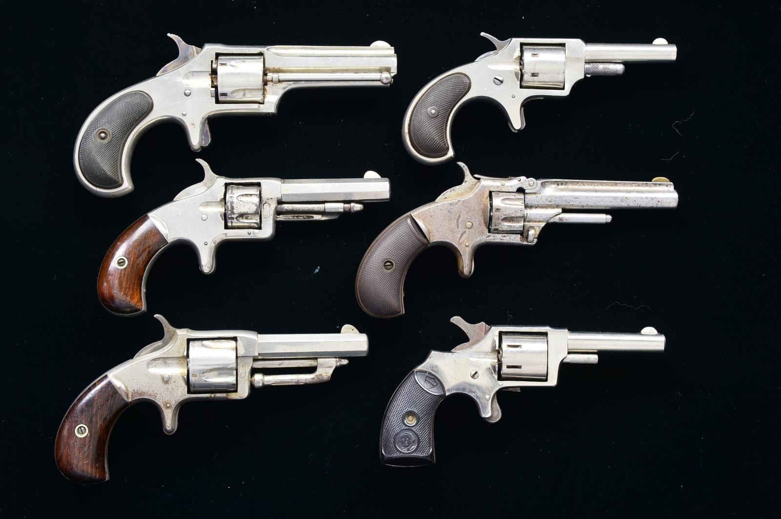 1) WESSON & HARRINGTON NO. 2. Cal. 22 RF. S# 6703. Bbl. 2 5/8" oct. w/ blade sight. 7 Shot fluted cyl. Nickel finished spur trigger action. 2 Piece bird's head rosewood grips. Mfg. 1874-1879. CONDITION: 70% nickel blending w/ areas of peeling & corrosion. Action is not cycling properly. Ejector is loose on frame. Grips show wear. Lightly pitted bore. (01-18547/DS). 2) WESSON & HARRINGTON NO. 3. Cal. 32 RF. S# 2311. Bbl. 2 5/8" oct. w/ blade sight. 5 Shot fluted cyl. Nickel finished spur trigger. Action. 2 Piece rosewood bird's head grips. Mfg. 1874-1879. CONDITION: over 80% nickel showing spots of wear & freckling. Grips show wear & handling marks. Cyl. does not rotate when action is cycled. Bore shows spots of pitting. (01-18549/DS). 3) REMINGTON-SMOOT NEW MODEL NO. 2. Cal. 30 RF. S# 486 (under grips). Bbl. 2 3/4" oct. w/ fully shrouded ejector, rib & pinned blade semicircular sight. 5 Shot fluted cyl. Nickel finished spur trigger action w/ case colored hammer & trigger. 2 Piece checkered hard rubber grips. Approx. 3,000 mfg. 1877-1885. CONDITION: 95% nickel. Grips show light wear. Action is not cycling properly. Bore retains good rifling. (01-18551/DS). 4) SMITH & WESSON NO. 1 THIRD ISSUE. Cal. 22 RF. S# 96157. Bbl. 3 1/8" rnd. w/ rib & bras semicircular sight. 7 Shot rnd. cyl. Spur trigger tip up action. 2 Piece checkered hard rubber grips. CONDITION: metal has cleaned gray appearance w/ general surface corrosion & light pitting. Grips show moderate wear. Action is not cycling properly. Bbl. is loose at hinge. Lightly pitted bore. (01-18552/DS). 5) LIBERTY. Cal. 22 RF. S# 145 (under grips). Bbl. 2 3/8" rnd., smooth bore w/ semicircular sight. 7 Shot rnd. cyl. Nickel finished spur trigger action. 2 Piece checkered hard rubber grips. CONDITION: 95% nickel showing spots of corrosion. Very good grips. Bore shows spots of pitting. (01-18725/DS). 6) REMINGTON IROQUOIS. Cal. 22 RF. NSN. Bbl. 2 1/4" rnd. w/ semicircular sight. 7 Shot rnd. cyl. Nickel finished spur trigger action. 2 Piece checkered hard rubber grips. Approx. 10,000 mfg. 1878-1888. CONDITION: over 95% nickel showing spots of freckling. Grips show light wear. Good mechanics. Bore retains strong rifling. (01-18726/DS). ALL ANTIQUE. $650-1,000.