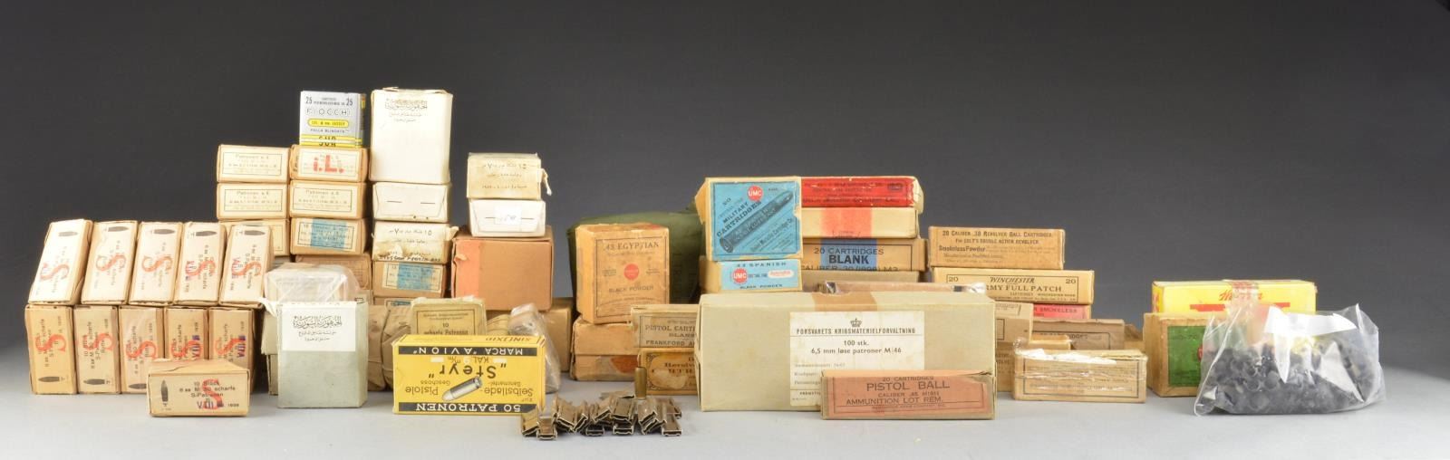 CARTRIDGES, US & FOREIGN, VINTAGE & MODERN. Cartridges are both rifle & pistol & most are in original packaging. Most are full boxes, some may be partial. Lot includes but not limited to: Sealed packet of 10 Frankfort Arsenal 10 second "fuzes" dated 1863. 45 CAL.: Sealed packet of 12 revolver ball cartridges Frankfort Arsenal 1878 / packet of 12 pistol cartridges blank Frankfort Arsenal 1882 / 2 boxes of 20, 1 full & 1 partial box, revolver ball cartridges Model of 1909 Frankfort Arsenal / box of 20 pistol ball M1911 Remington Arms Co. 38 CAL.: 2 Boxes of 20 revolver ball Frankfort Arsenal / box of 20, 17 remaining, revolver blank cartridges. 45/70: Box of 20 405 gr. bullet, head stamped "F 1 of 90" / 1 box of 20, 2-piece box, Remington UMC blanks. 50-70: Box of 20 blanks, REM UMC, tan box w/ green label. 30/40: Box of 20 Winchester 30 Army Full Patch / box of 20 blank Remington Arms Co. Cal. 30 "1898" M3. 30-06: Box of 20 Ball Frankfort Arsenal, sealed box w/ red stripe / box of 20 blank Twin Cities Ordnance Plant. 7.62MM NATO: Ball, M80 Lot WRA / box of 100 w/ cloth bandolier, bandolier is marked "NATO 7.62 MM LINKED 1 TRACER, M62 4 BALL M80". 7MM MAUSER: 2 Boxes of 20 rd. Western High Pressure Proof Loads / 1 box of 20 rd. 2-piece box Union Metallic Cartridge Co. 175 gr. metal case bullet / 1 box of 20 rd. REM UMC, 2-piece box 175 gr. metal case bullet / 2 boxes of 20 rd., 2-piece box, Remington Kleanbore 139 gr. pointed bullet. 5.56MM: 2 Boxes of 20 rd. blank M200. 22 HORNET: Box of 50 rd. Winchester Soft Point for USAF Survival Rifles. 11MM MAUSER: 10 Rds. German head stamped in Remington UMC, 2-piece box. 43 SPANISH: 3 Boxes of 20 rd., 2 are UMC & 1 is Rem. UMC. 43 EGYPTIAN: 1 Box of 20 rd. lead bullets / 1 box of 20 rd. contains 16 rd. including 2 blank & 3 shot cartridges / 1 box of 20 rd. Remington UMC 2-piece box blanks. 41 SWISS: 1 Box of 20 rd. containing 6 cartridges Remington UMC blanks, 2-piece box. 11MM AUSTRIAN MANNLICHER: 7 Clips of 5 rd. paper patched bullets. 8x50R: 2 Clips of 5 rd. ball. 8x56R: 11 Boxes of 10 rd. in clips, dated 1938, German mfg. 8x57 MAUSER: 10 Boxes of 15 rd. 8mm ball, German mfg., mixed loadings / 3 boxes of 15 rd. marked "Ejercito Ecuador" ball / box of 20 rd. Israeli ball dated 1954 / box of 50 rd. containing 28 rd. of 7.92 mm drill cartridges B.P.D 53. 8MM LEBEL: 2 Paper packets of 8 rd., dated 1939. 8MM GEUEDES: 3 Packets of 8 rd., dated 1890. 7.5 SWISS: 2 Packets of 10 rd. ball, dated 1924. 7.5 FRENCH: 7 Boxes of 15 rd. Syrian production ball. 7.62MM: Box of 10 7.62 mm grenade launcher cartridges. 7MM MAUSER: Box of 50 rd. Spanish ball w/ clips / 2 boxes 15 rd. DWM ball w/ clips, 1938. 7.62x45 CZECH: 3 Boxes of 15 rd. ball. 6.5x55: Box of 100 rd. Danish wood bullet blanks. Pistol Cartridges include: 9MM STEYR: Box of 50 rd. RWS full metal jacket. 38 SPECIAL: Box of 50 rd., partial box, Piocchi "Salve". 7.65 BROWNING: Box of 50 rd., partial box, Piocchi "Salve". 7.63 MAUSER: Box of 50 rd. in 10 rd. clips / 3 boxes of 25 rd. FMJ. 380 LUNGO: Box of 25 rd. Fiocchi lead bullets. 8MM LEBEL REVOLVER: Box of 25 rd., partial box, Fiocchi. 8MM GASSER: Box of 25 rd. Fiocchi lead bullets. 9MM LARGO: Box of 25 rd., mostly full, SBIM. Also contains small quantity of stripper clips & 5.56 disintegrating machine gun links. CONDITION: ranges from fair to good. Boxes may have torn corners, missing flaps, torn & scuffed labels. Commemorate w/ ammunition of this age. (02-13716/RW). $700-900