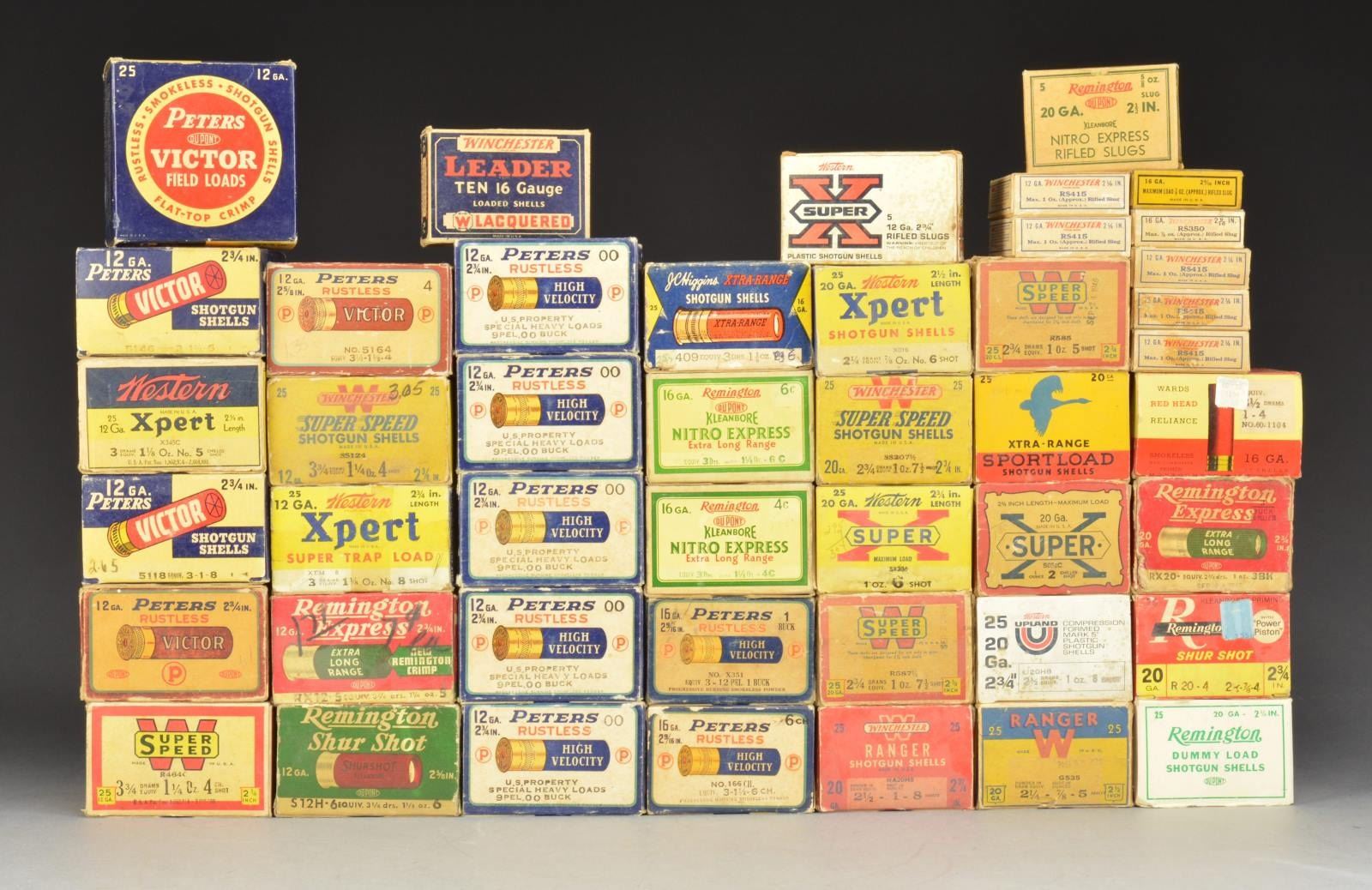 SHOTGUN AMMO & BOXES. Lot contains 1 & 2-piece boxes in a wide variety of brands & loadings, boxes will be 1-piece unless otherwise noted. Many boxes may have only partial contents, boxes full unless otherwise noted. 12 GA.: 1 Box of 25 rds. partial Remington Shur Shot no. 4 shot. In 2-piece box. / 1 Box of 25 rds. empty Remington Arrow Express no. 5 shot in 2-piece box. / 1 Box of 25 rds. partial Remington Nitro Club no. 2 shot in 2-piece box. / 1 Box of 25 rds. Remington Nitro Club no. 6 shot in 2-piece box. / 3 Boxes of 25 rds. Remington Nitro Club no. 7 1/2 shot in 2-piece box. / 1 Box of 25 rds. empty Remington Nitro Club no. 2 shot in 2-piece box. / 1 Box of 25 rds. empty Remington Nitro Club no. 8 shot in 2-piece box. / 1 Box of 25 rds. US Cartridge Co. Ajax no. 4 shot in 2-piece sealed box. / 1 Box of 25 rds. empty US Cartridge Co. Romax no. 4 shot in 2-piece box. / 1 Box of 25 rds. empty Winchester New Rival BB shot in 2-piece box. / 1 Box of 25 rds. empty Winchester Repeater no. 8 shot in 2-piece box. / 1 Box of 25 rds. empty Western Super X no. 6 shot in 2-piece box. / 1 Box of 25 rds. mostly full Western Field, 2-piece box is marked “No. AAA” & is marked out & hand relettered “BB”. / 1 Box of 25 rds. empty Sport Loads Extra Range (Sears?) no. 4 shot in 2-piece box. / 1 Box of 25 rds. empty Peters Victor no. 6 shot in 2-piece box. / 1 Box of 25 rds. containing 17 rds. Eley “Rocket” no. 7 1/2 shot in 2-piece box. / 1 Box of 25 rds. Eley 2" no. 6 shot in 2-piece box. / 1 Box of 25 rds. Dominion Imperial special long range no. 5 shot in 2-piece box. / 1 Box of 25 rds. empty Dominion Imperial special long range no. 5 shot in 2-piece box. / 1 Box of 25 rds. empty FN Legia no. 4 shot in 2-piece box. / 5 Boxes of 25 rds. Peters High Velocity marked “U.S. PROPERTY SPECIAL HEAVY LOADS 9 PEL. 00 BUCK”. / 4 Boxes of 25 rds. all empty Peters Victor. / 1 Box of 25 rds. Peters Victor 2 5/8" no. 4 shot. / 1 Box of 25 rds. Remington Shur Shot 2 3/4" no. 6 shot. / 1 Box of 25 rds. Remington Express 2 3/4" no. 5 shot. / 1 Box of 25 rds. partial Western Xpert 2 3/4" no. 8 shot. / 1 Box of 25 rds. empty Western Xpert no. 5 shot. / 1 Box of 25 rds. Winchester Super Speed 2 3/4" no. 4 shot. / 1 Box of 25 rds. partial Winchester Super Speed 2 3/4" no. 4 shot. / 5 Boxes of 5 rds. Winchester Long Range rifle slugs 2 3/4". 16 GA.: 1 Box of 25 rds. empty Remington UMC New Club 7/8 oz. ball in 2-piece box. / 1 Box of 25 rds. empty UMC New Club no. 5 shot in 2-piece box. / 1 Box of 25 rds. Remington Nitro Club no. 5 shot in 2-piece box. / 1 Box of 25 rds. empty Winchester Ranger no. 6 shot in2-piece box. / 1 Box of 25 rds. partial Western Super X no. 5 shot in 2-piece box. / 1 Box of 25 rds. Federal Monark no. 2 shot in sealed 2-piece box. / 1 Box of 25 rds. empty Western Xpert no. 6 shot in 2-piece box. / 1 Box of 25 rds. partial Peters High Velocity 2 9/16" no. 1 buck. / 1 Box of 25 rds. empty Wards Red Head no. 4 shot. / 1 Box of 25 rds. Remington Nitro Express no. 4 shot. / 1 Box of 25 rds. partial Remington Nitro Express no. 6 shot. / 1 Box of 25 rds. Peters High Velocity 2 9/16" no. 6 shot. / 1 Box of 25 rds. empty JC Higgins. / 1 Box of 10 rds. partial Winchester Leader 2 3/4" no. 2 shot in blue & white box. 20 GA.: 1 Box of 25 rds. Western Super X 2 3/4" no. 2 shot. / 2 Boxes of 25 rds. 1 partial, 1 full Western Super X 2 3/4" no. 6 shot. / 2 Boxes of 25 rds. Winchester Super Speed 2 3/4" no. 7 1/2 shot. / 1 Box of 25 rds. Winchester Super Speed 2 3/4" no. 5 shot. / 1 Box 25 rds. Winchester Ranger 2 3/4" no. 8 shot. / 1 Box of 25 rds. Winchester Ranger 2 1/2" no. 5 shot. / 1 Box of 25 rds. Western Upland plastic 2 3/4" no. 8 shot. / 1 Box of 25 rds. Sears Xtra-Range 2 3/4" no. 6 shot. / 1 Box of 25 rds. Remington Express 2 3/4" no. 3 buck. / 1 Box of 25 rds. Remington Shur Shot plastic 2 3/4" no. 4 shot. / 1 Box of 25 rds. Remington Dummy Load shot shells 2 3/4" in sealed box. / 1 Box of 5 rds. Remington 2 1/2" slug. 24 GA.: 1 Box of 25 rds. partial Dominion no. 7 shot in 2-piece box. / 1 Box of 25 rds. partial MGM no. 6 shot in 2-piece box. 410 GA.: 1 Box of 25 rds. partial Grade A no. 6 shot. / 1 Box of 25 rds. empty Peters rifle slug 2 1/2". / 1 Box of 25 rds. Peters High Velocity 3" no. 5 shot. / 1 Box of 25 rds. partial Peters High Velocity 3" no. 4 shot. / 1 Box of 5 rds. Sears Sportload 2 1/2" rifle slugs. / 1 Box of 5 rds. partial Remington rifle slug 2 1/2". CONDITION: ranges from fair to good. Boxes may have wear, scuffing & staining w/ torn corners but are in generally legible condition. (02-14039-1/RW). $600-900.