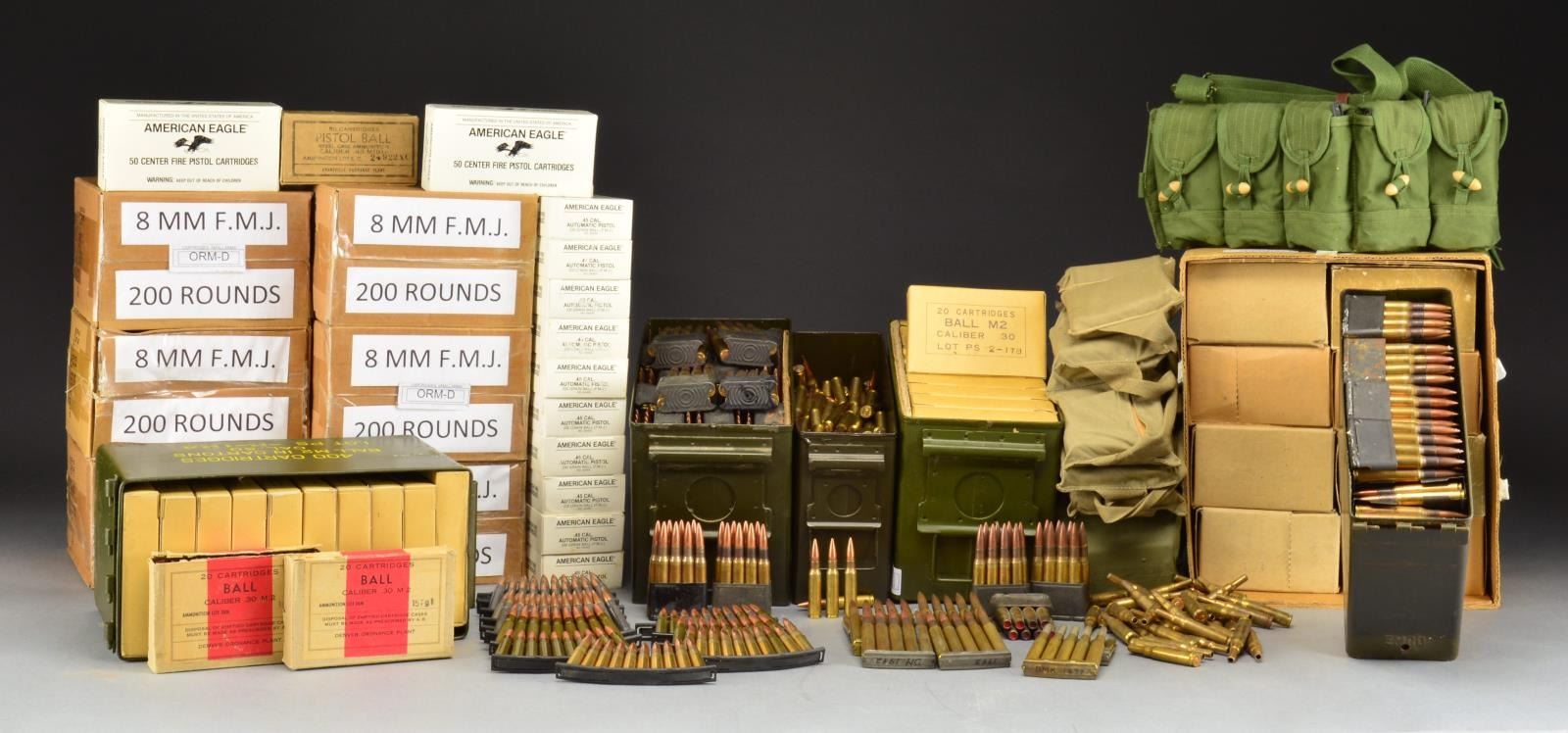 & VIETNAM VINTAGE RIFLE & PISTOL AMMO. Includes assorted belts, clips & bandoliers. Lot contains hollow point ammunition. Lot also contains approx. 24 assorted ammunition cans in sizes 30 Cal., 50 Cal. & 20MM. 30-06: Approx. 1300 rds. of 1950’s vintage military ball ammo on M1 Garand clips. All appears to be US mfg. / 40 Cartons of 20 rds. Korean M2 Ball. / Approx. 170 rds. of US WW2 vintage M2 Ball on 5 rd. stripper clips w/ bandoliers. / 2 Cartons of 20 rd. Ball M2 Denver Ordnance Plant w/ red stripe. / Approx. 100 rds. of mixed cartridges which includes ball, dummy & guard. 8MM MAUSER: 5 Full boxes of 200 rds. & 1 partial box ball loaded by Greek Powder & Cartridge Co. in Athens, Greece. Headstamped “EK”. 6.5X55: 1 Box of approx. 50 rds. / Approx. 50 rds. of Danish Ball headstamped “HA / VI46 / 48”. 7.62 NATO: 1-30 Cal. Ammo can. Approx. 3/4 full of RA 69 Ball. / 2 Cartons of 20 rds. of L2 A2 Ball. / 8 Cartons of 100 rds. headstamped “LC 75” on M60 links, every 5th rd. is tracer. 7.62 NATO BLANKS: Approx. 600+ rds. of US 1970’s dated, many on metal link belts. 30 M1 CARBINE: 300+ rds. in 3 bandoliers w/ clips & 1970’s vintage date. 45 ACP: 1 Box of 50 rds. of Steel Case EC 43 Ball. / 12 Boxes of 50 rds. Federal American Eagle full metal jacket 230 grain ball. 7.62X39: 1 Green Chinese bandolier w/ 10 20 rd. pouches of steel case hollow point ammunition on 10 rd. stripper clips plus approx. 120 rds. of mixed ball & hollow point, mostly steel cases. 12 GA.: 7 Rds. of Winchester No. 12 00-Buck in brass cases. CONDITION: ranges from fair to very good, some ammunition may have light verdigris & staining. Clips may have light oxidation. (02-14124-2/RW). $600-900.