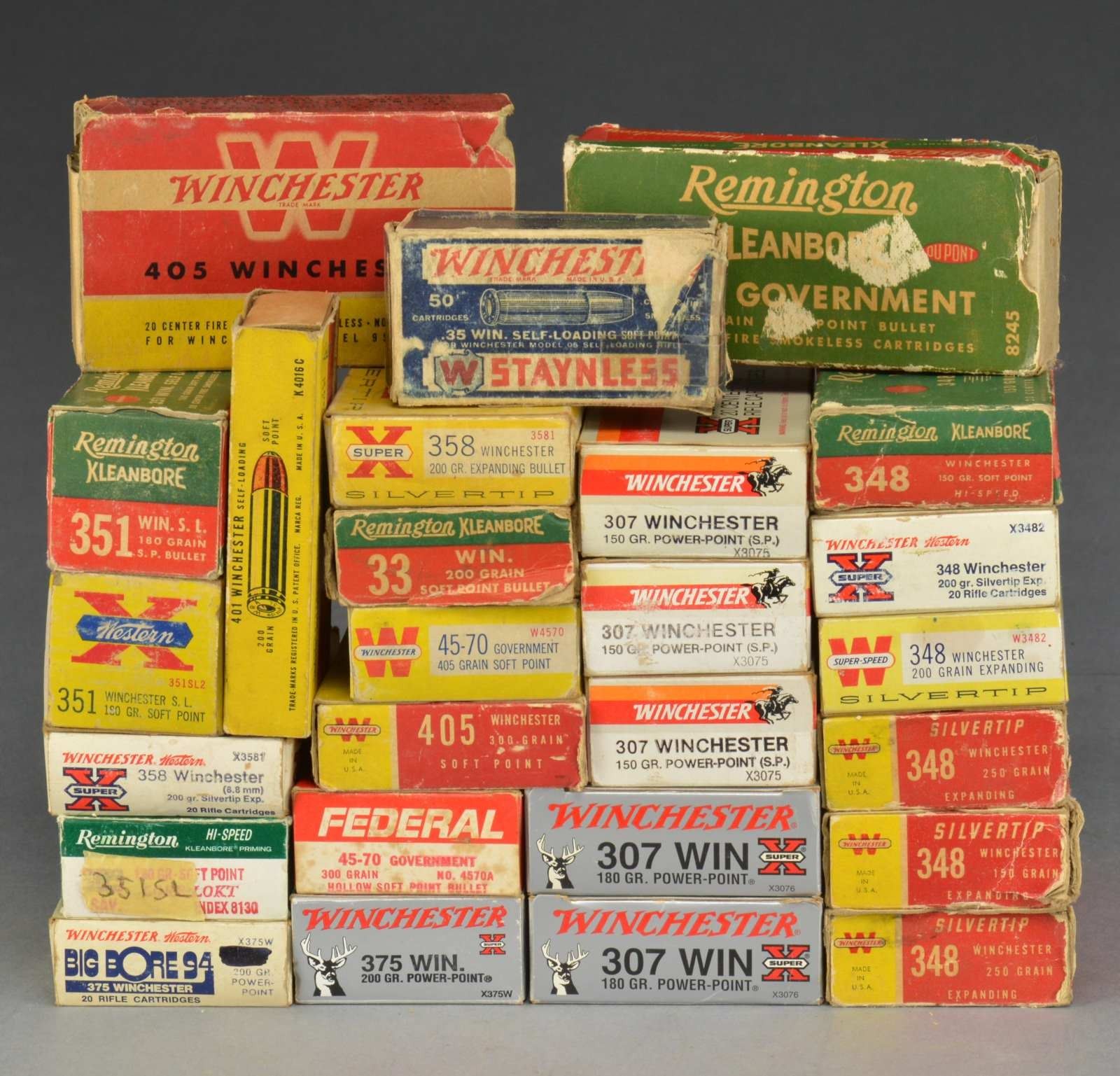 2 Win. silver 307 Win. 180 Power-Point / 3 Win. white 307 Win. 150 gr. Power-point / Rem. red-green 33 Win. 200 gr. SP / Rem. red-green 348 Win. 150gr. SP / Win. white 348 Win. 200 gr. Silvertip / Win. yellow 348 Win. 200 gr. Silvertip / Win. Red-yellow 348 Win. 250 gr. Silvertip / Win. red-yellow 150 gr. Silvertip / Super X yellow 358 Win. 200 gr. Silvertip. / Win. white 358 Win. 200 gr. Silvertip / Rem. red-green 351 Win. 180 gr. SP / 3/4 Western X yellow 351 Win. 180 gr. SP / 20 Misc. 351 Win. / Win. blue 35 Win. SP / Win. red-yellow 401 Win. 200 gr. SP / Rem. (missing 3) dogbone 40-82 / 40-72 Win. commercial reloads from 444 Brass w/ lead bullets / 2 Win. red-yellow 405 Win. 300 gr. SP / Win. yellow 45-70 405 gr. SP / Rem. red-green 45-70 405 SP / Federal 300 gr. 45-70 HP. CONDITION: appears serviceable. (02-14546-9/NW). $600-800.
