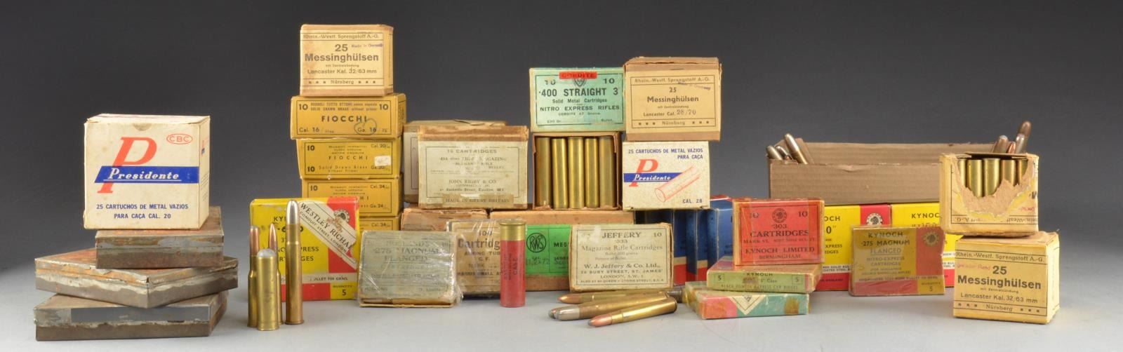 SPORTING CARTRIDGES. LOT CONTAINS HOLLOW POINT BULLETS. RIFLE. 1 Partial box of Kynoch 600 NE 900 gr. solid; 1 unfired & 3 fired. / 4 5 Rd. Boxes of 500 NE 3 1/4" case black powder express 440 gr. solid. / 2 5 rd. Boxes of 500 NE 3" case black powder express 340 gr. lead copper nose. / 1 10 Box of Ely 450/400 NE soft nose. / 1 Box f Rigby's 450 Big Game Rifle. / 2 Full 20 rd. & 1 Partial 16 rd. boxes of Kynoch 470 NE tropical tin packs w/ illegible labels. / 1 Tin containing 4-5 rd. boxes of Kynoch 450 NE 3 1/4" case 480 gr. solids. / 2 10 rd. Boxes of 416 Rigby fired cases. / 1 10rd. Box of Purdey .400 Straight 3" 230 gr. hollow points. / 1 Partial 8 rd. box of 333 Jeffrey 300 gr. solid. / 1 Partial 2 rd. box of 425 Westley Richards solid bullets. / 1 10 rd. Box of Holland & Holland 375 Bore Cordite 270 gr. soft nose. / 1 5 rd. Box of Kynoch 275 Mag. Flanged 160 gr. soft nose. / 1 19 rd. Box of Holland's 275 Mag. Flanged 180 gr. soft nose. / 1 10 rd. Box of Kynoch 303 Mark IV. / 1 100 rd. Box of Aiming Tube C.F. Mark II Morris Small Arms 1907. / 1 Partial 40 rd. box of RWS 11.2x72 empty brass Berdan primed cases. / 1 Lg. box of loose assorted loaded cartridges predominantly British cartridges. Cal. include 470 Nitro, 470 No. 2, 450 No. 1, 404 Jeffrey, 360 Nitro & 416 Rigby. SHOTGUN BRASS SHELLS. 1 Partial box of S. Paulo 28 Ga. Berdan primed. / 1 Partial box of S. Paulo 20 Ga. Berdan primed. / 4 25 rd. Boxes of Messinghulsen 32 Ga./63mm. Berdan primed. / 3 25 rd. Boxes of Messinghulsen 32 Ga./63mm. / 6 10 rd. Boxes of Fiocchi Berdan primed. 2 Boxed of 16 Ga., 2 1/2", 1 Box of 20 Ga., 65mm, & 3 boxes of 24 Ga., 65mm. CONDITION: ammo & components may have oxidation & minor corrosion, but most appear in serviceable condition. Boxes may have wear, staining, tears & illegible labels. (02-14185-1/RW). $700-900.
