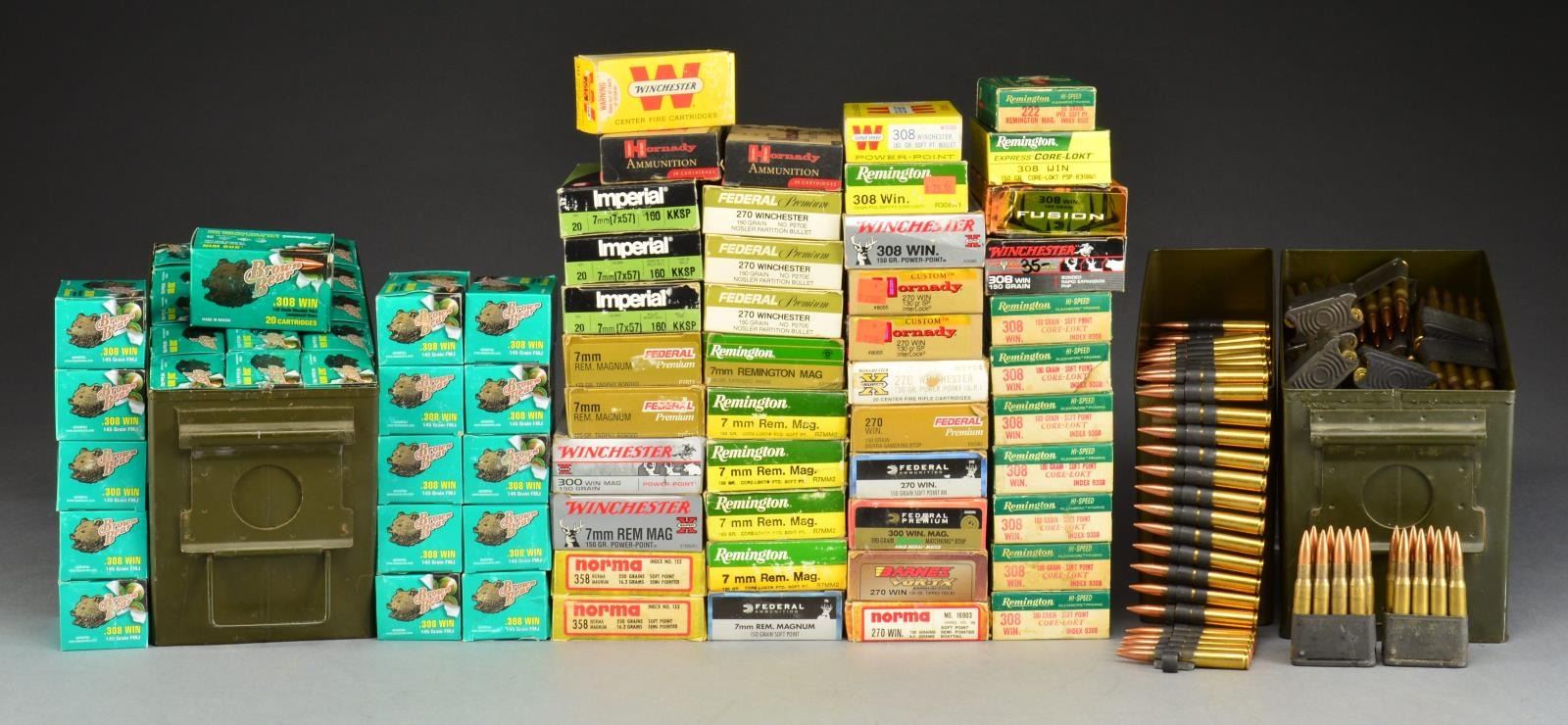 RIFLE AMMO. LOT COTAINS HOLLOW POINTS. CONDITION: while boxes may show wear & staining, ammo is in serviceable condition unless noted. 600 RDS. 30-06 IN. (375+ Rds.) headstamped "FNB 30 80" in 8 rd. Garand clips. / (225+ Rds.) Linked ammo headstamped "88". / 60 BOXES (1200 RDS. TOTAL) OF 308 WIN. Predominantly (45) 20 rd. boxes of Brown Bear 145 gr. FMJ. Ammo is brown paper wrapped inside box. / Includes: (7) 20 rd. boxes of Rem. 180 gr. soft point. / (8) 20 rd. Boxes of various makers & grains. 9 BOXES (180 RDS.) 7MM REM. MAG. Predominantly Rem & Federal 150 to 157 gr. 1 Box Rem. 165 gr. has ammo shows corroding on cases. Includes: 1 box Rem. showing significant box damage & 1 Win. box w/ mixed cartridges. 10 BOXES (200 RDS. TOTAL) of 270 WIN. Various makers of 130 & 150 gr. bullets. 1 Box of Federal Premium 130 gr. ammo shows heavy patina & beginning corroding. 1 Box of mixed ammunition in Win. box. 9 BOXES OF MISC. CALS. (1) 20 rd. Box Federal Premium 300 Win. Mag. 190 gr. Matchking BT HOLLOW POINT. / (1) 20 rd. Box Win. 150 gr. power-point, ammo shows corroding. / (2) Boxes 39 rds. of Norma 358 Norma Mag. 250 gr. soft point. / (3) 20 rd. Boxes of Imperial 7x57 160 gr. KKSP. / (1) 20 rd. Box of Rem. 222 Rem. Mag. 55 gr. PTD soft point. / (1) 50 rd. Box of Win. 30 Carbine 110 gr. hollow soft point. / Lot includes 3 - 30 cal., 3 - 50 cal. & 1 - 40mm ammo cans. (02-14640-1/MD). $700-1,000.