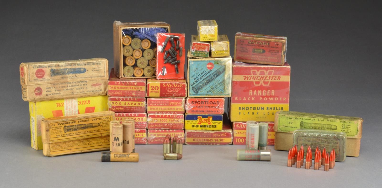 Predominantly Savage red & yellow boxes w/ shrink wrapped boxes. CONDITION: Savage boxes show light wear, tearing & staining. Two piece boxes show moderate wear & staining w/ portions of labels missing. 9 EMPTY BOXES OR WITH FIRED BRASS. 1 Savage 30-30 Win. & Savage box 170 gr. / 1 Savage 30-06 box 180 gr. / 1 Sportload red & black 30-30 Win. box 170 gr. SP. / 1 Win. 12 Ga., 2 3/4" blanks box Ranger black powder. / 1 UMC 32 S&W 2 piece box 88 gr. / 1 Western 30-30 Win. Super X 150 gr. Lubaloy. / 1 UMC 43 Spanish 2 piece box w/ 24 fired brass cases. Lid has 1 edge flap missing. / 1 Win. 32 Win. Spl. soft point 2 piece box w/ 11 fired brass cases. / 1 UMC .38-56-255 2 piece box w/ 13 fired or unprimed brass cases. 13 BOXES OF AMMO (full unless noted. 1 Partial 15 rds. Win. 16 Ga, 2 1/2" No. 6 in unmarked 2 piece box. / 1 - 50 Rd. box of Savage 32 Automatic metal case. / 1 - 50 Rd. box of Savage 32-20 Win. 100 gr. / 1 - 50 Rd. box of Savage 25-20 Win. 86 gr, soft nose. / 2 - 20 Rd. boxes of Savage 30-30 Win. & Savage 170 gr. soft point. / 2 - 20 Rd. boxes of Savage 250-3000 100 gr.: 1 soft point & 1 expansion controlled. / 1 - 20 Rd. Savage 303 Savage 180 gr. expansion controlled. 1 Torn end flap. / 1 Partial box 15 rds. of Savage 250-3000 Savage 87 gr. soft point. / 1 - 20 Rd. Savage 300 Savage 180 gr. expansion controlled. / 1 - 20 Rd. 2 piece box of Rem-UMC 38-56 Win. & Marlin soft point. / 1 - 20 Rd. box of Win. 300 Win. Mag. For proof loads w/ fired casings reprimed. (02-14675-3/MD). $300-500.