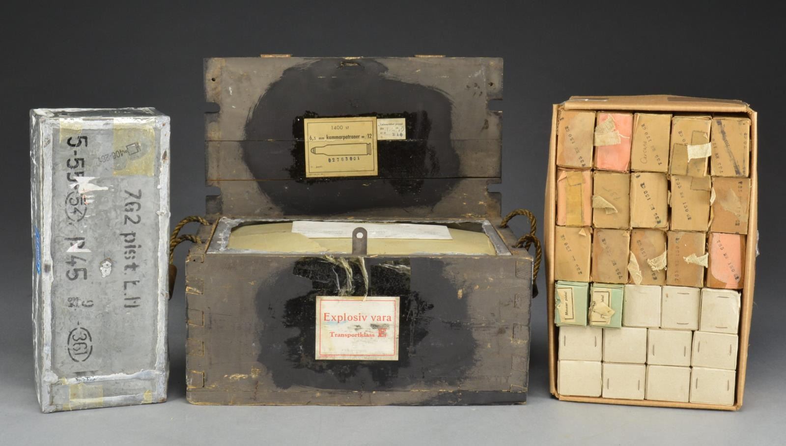 Sealed metal can marked 5-55-54 in oval, 9/54, P 45, 361 in oval & 7.l2 pist. L. II; Cal 7.62X25 Approx. 900-1,400 rds. / 11 Boxes 7.62X54R (20 Rds.); steel casings. / 4+ S&B 7.63 Mauser (25 rd. boxes). / 7.35MM Carcano: 3 boxes military FMJ / 3 w/ bullets replaced by 170 gr. SP / 8 boxes w/ bullets replaced by 150 gr. SP. / Case 1400 rds. of gallery style practice ammo. 6.5X55mm; label marked 6.5mm Kammarpatroner – 12. CONDITION: all good or better serviceable ammo. (02-14546-3/NW). $500-750.