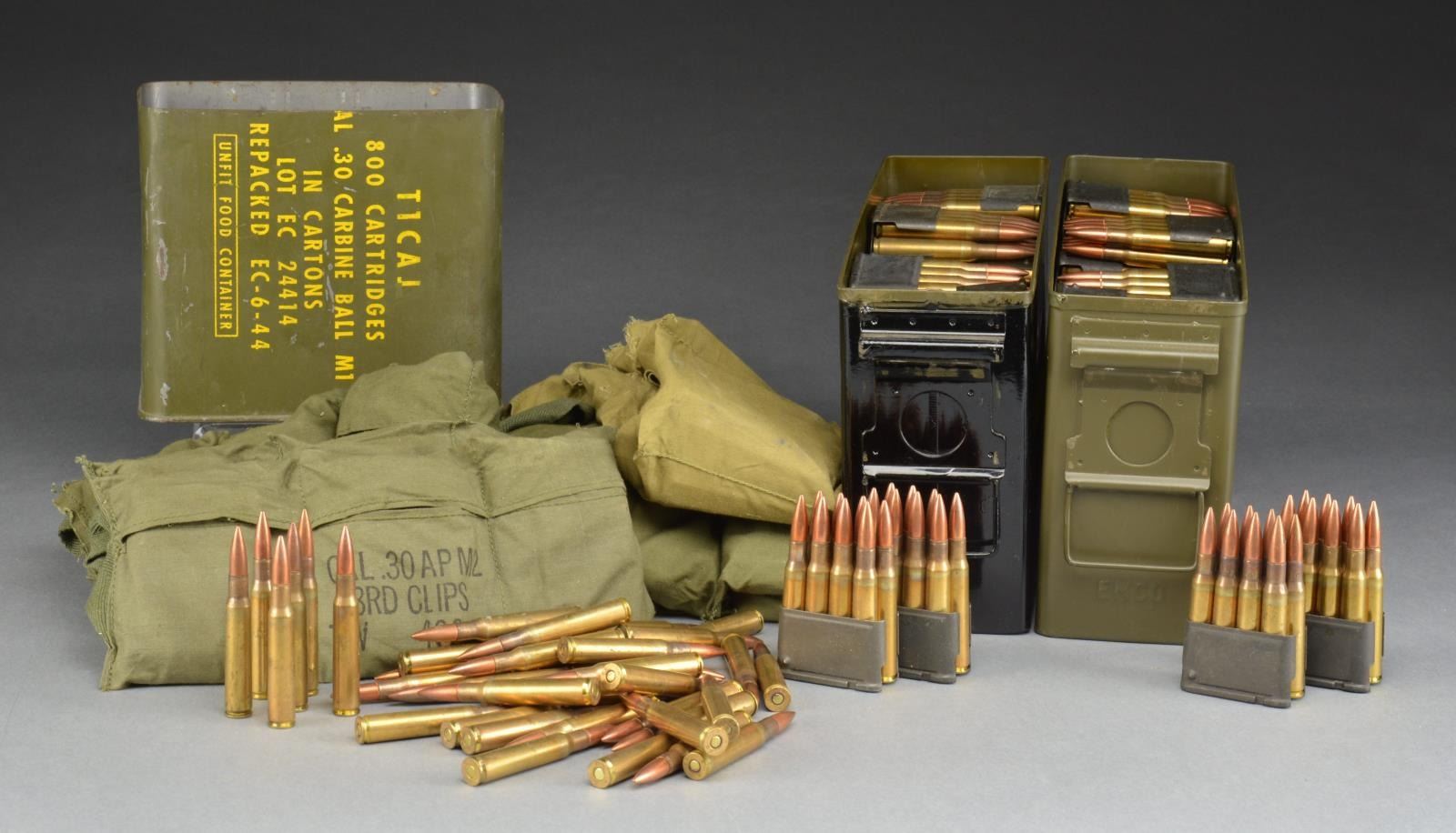 2 Ammo cans & 192 rds. in 8 rd. clips / 5 bandoliers having 6 - 8 rd. clips each / 50+ rds. loose including 2 - 8 rd. clips. CONDITION: good serviceable ammo. (02-14143-1/NW). $400-600.