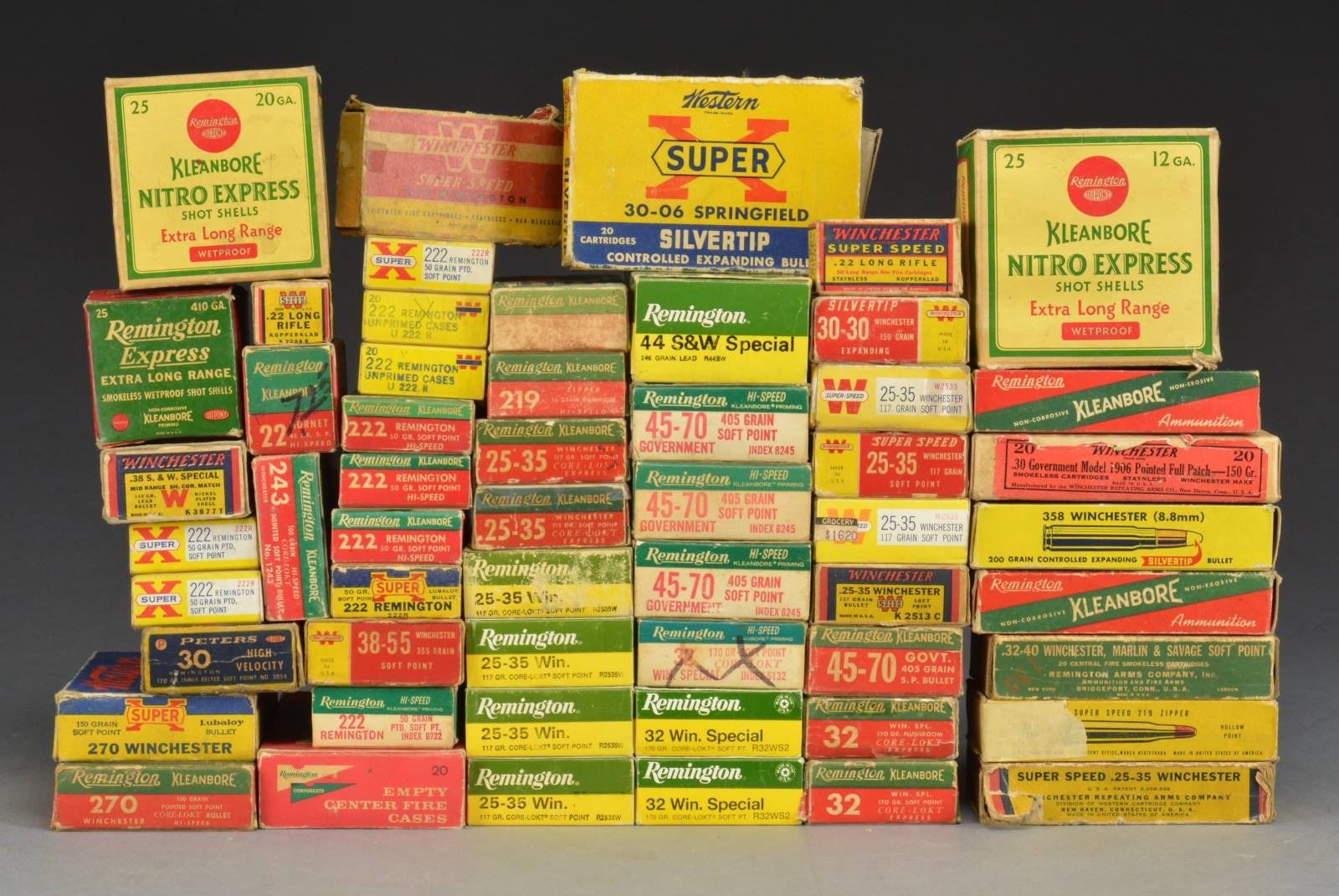 CAL. 219 ZIPPER: (all 56 gr. HP) 2 Rem red-green / Win. red-yellow / CAL. 25-35 WIN.: (all 117 gr. SP) 4 Rem. green-yellow / 2 Rem red-green / 2 Win. yellow / 2 Win. blue-yellow / Win. red-yellow. 30-30 WIN.: Win. red-yellow 150 gr. silvertip / 1/2 Rem. red-green 170 gr. SP. 32 SPL.: 2 Rem. green-yellow 170 gr. SP / 1/2 Rem. green-white 170 gr. SP. Approx. 30 vintage boxes of pistol / rifle brass; various calibers; mostly part boxes. CONDITION: serviceable ammo. (02-14546-11/NW). $400-600.