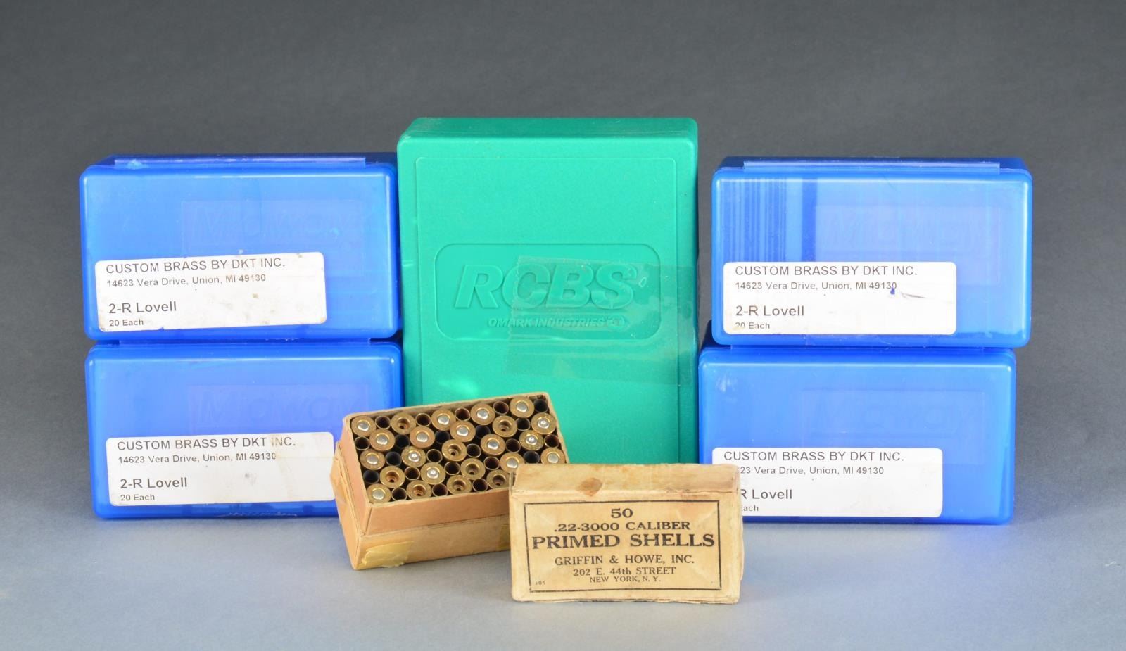 4 Boxes (50 rds.) 2–R Lovell Custom brass by DKT Inc. Box (50 rds.) of Griffin & Howe 22-3000 brass (some primed). RCBS Die set. CONDITION: all very good to near excellent. PROVENANCE: From the Frederic W. Thrane Collection. (02-14151-2/NW). $250-400.