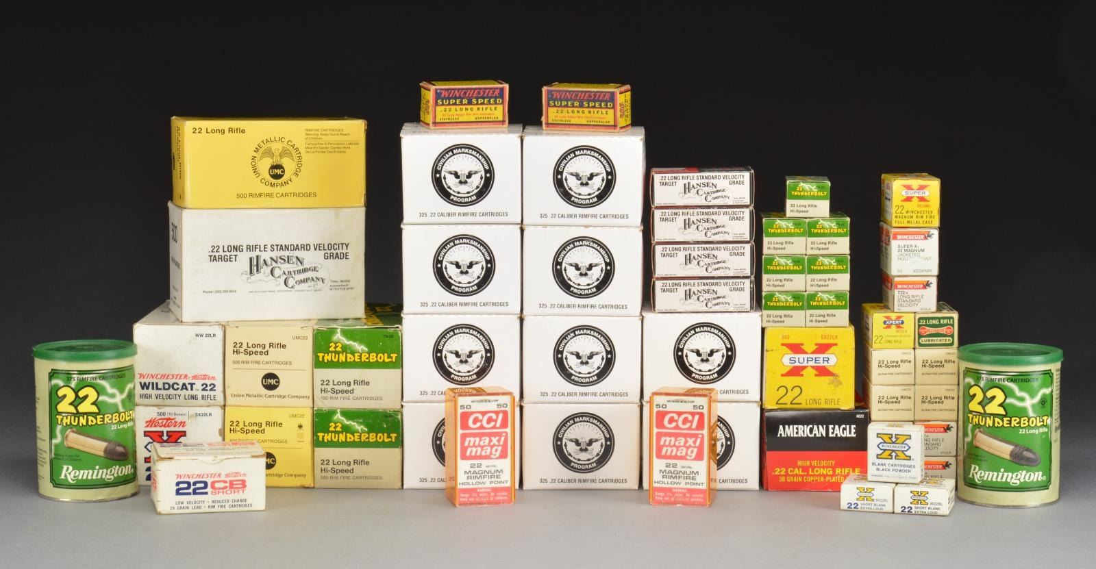 This lot includes hollow point ammunition. Condition ranges from good to very good. Boxes may have been opened, maybe slight scuffing or sm. tears. 22 LONG RIFLE: 10 boxes of 325 Civilian Marksmanship program High Velocity 40 grain solid. / 3 Bricks of 500 Union Metallic Cartridge Co. / 1 Brick 400 American Eagle Federal 38 grain hollow point. / 1 Brick of 500 Hansen Cartridge Co. standard velocity target grade. / 1 Brick of 500 Western Super X 40 grain lubaloy in red & yellow brick. / 1 Brick of 500 Western Super X 40 grain lubaloy in white brick. / 1 Brick of 500 Winchester Wildcat 40 grain bullet. / 2 Bricks of 500 Remington Thunderbolt Hi-Speed. / 2 Cans of 375 Remington Thunderbolt in sealed metal & cardboard cans. / 7 Boxes of 50 Remington Thunderbolt. / 5 Boxes of 50 Winchester T22 Standard Velocity. / 4 Boxes of 50 Union Metallic Cartridge Co. / 4 Boxes of 50 Hansen Cartridge Co. target grade. / 2 Boxes of 50 Winchester Super Speed Kopper Klad in blue & yellow boxes. / 1 Box of 50 Western XPert. / 1 Box of 50 Remington Kleanbore in green box. 22 CB SHORT: 1 box of 250 Winchester Low Velocity reduced charge. 22 BLANK: 3 boxes of 50 Winchester black powder blank. 22 MAG.: 2 boxes of 50 CCI MaxiMag hollow point. / 1 Box of 50 Winchester Super X jacketed hollow point. / 1 Box of 50 Western Super X 40 grain full metal case. (02-13775-12/RW). $200-400.