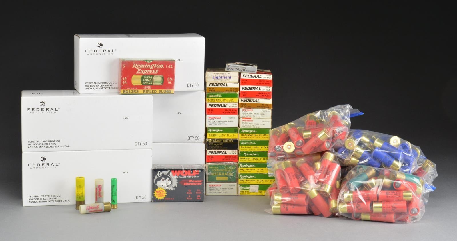 12 GA.: 5 Sleeves of 10 - 5 rd. boxes of Federal 1 oz. slugs. / 4 Boxes of 5 rds. Federal 1 oz. slugs. / 2 Boxes of 5 rds. Winchester slugs. / 1 Box of Remington 2 3/4" 00 Buck. / 2 Boxes of Remington 3" 00 Buck. / 3 Boxes of 5 rds. Remington 3 1/2" 00 Buck. / 1 Box of 5 rds. Remington 1" slugs. / 1 Box of 5 rds. Winchester 1oz. slugs. / 1 Box of 5 rds. Remington 1oz. slugs. / 1 Box of 5 rds. RWS 2 1/2" slugs. / 1 Box of 5 rds. Wolf 2 3/4" 00 Buck. / 1 Box of 5 rds. 410 2 1/2” 000 Buck. / Approx. 25 rds. of Hornady 00 Buck loose in plastic bag. / Approx. 25 rds. of Hornady BB loose in plastic bag. / 8 Rds. of Hornady 2 3/4" 00 Buck loose in plastic bag. / Approx. 20 rds. of Hornady 1oz. slugs loose in plastic bag. / Approx. 30 rds. of mostly Hornady slugs loose in plastic bag. / Approx. 20 rds. of 2 3/4" Hornady slugs loose in plastic bag. / Approx. 25 rds. of 3" Hornady BBs loose in plastic bag. / Approx. 20 rds. of Hornady 00 Buck 2 3/4" loose in plastic bag. 20 GA.: 2 Boxes of 5 rds. Winchester 3 3/4oz. slugs. / 1 Box of 5 rds. Federal 2 3/4". / 1 Box of 5 rds. Remington. / 1 Box of 5 rds. Lightfield slugs. (02-14563/BT). $125-175.