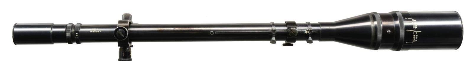 S# 13080. Mfg. 1953-1985 in 8, 10 or 12 power. 1" Tube w/ 2.17" objective & 1.16" eyepiece. Black anodized aluminum target mts. w/ stops; no recoil spring. Steel screw in lens caps. Cross wire reticle. CONDITION: rear mt. w/ faded finish on left side plus slight thinning of high points on left side of front. All other aspects of scope including optics are near excellent. (02-13914/NW). $500-750.