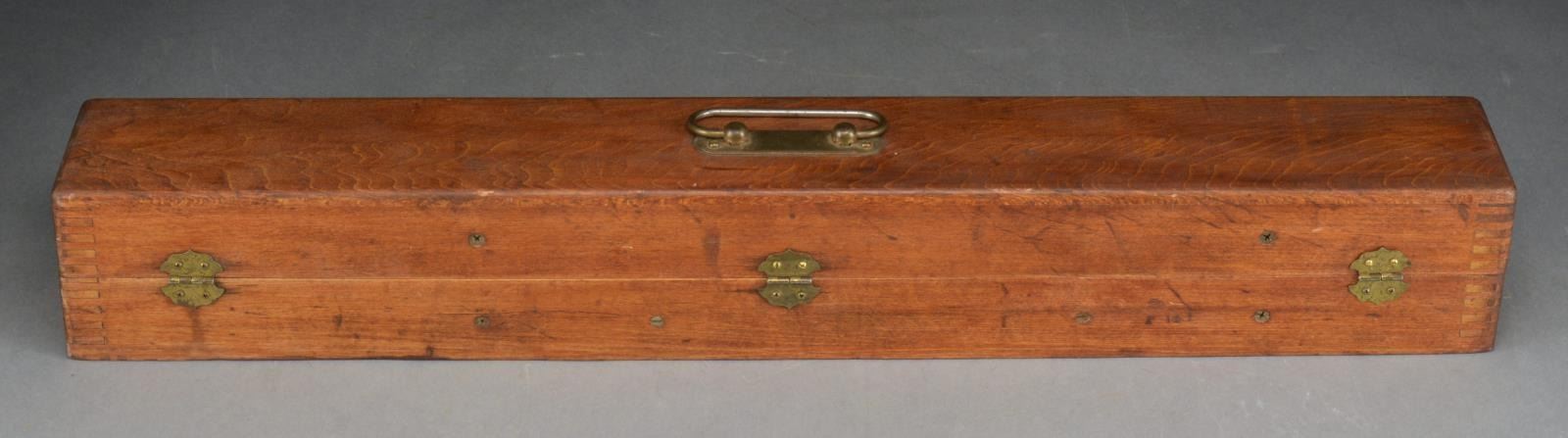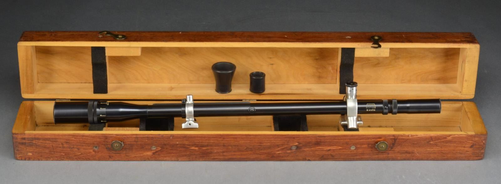 S# 58926. Mfg. 1937-1985 having most characters of 1" target scope to including unique 21 1/2" length & 3/4" tube. Eyepiece listed at .875" but measures .855". AO listed at 1.563", yet measures 1.309". Aluminum finished target mts. w/ stop; no spring assembly. Offered 6,8 or 10 power. Blued steel screw in lens caps. Cross wire reticle. Vintage case w/ hook clasp. Typical funnel shaped eyepiece plus short restrictive eyepiece appearing too tight for scope. Generally good case w/ wear & patina. Faint rub marks on scope tube & occasional faint spot of pinprick oxidation. Scope has general very good to excellent appearance w/ near excellent optics. (02-13895/NW). $300-450.