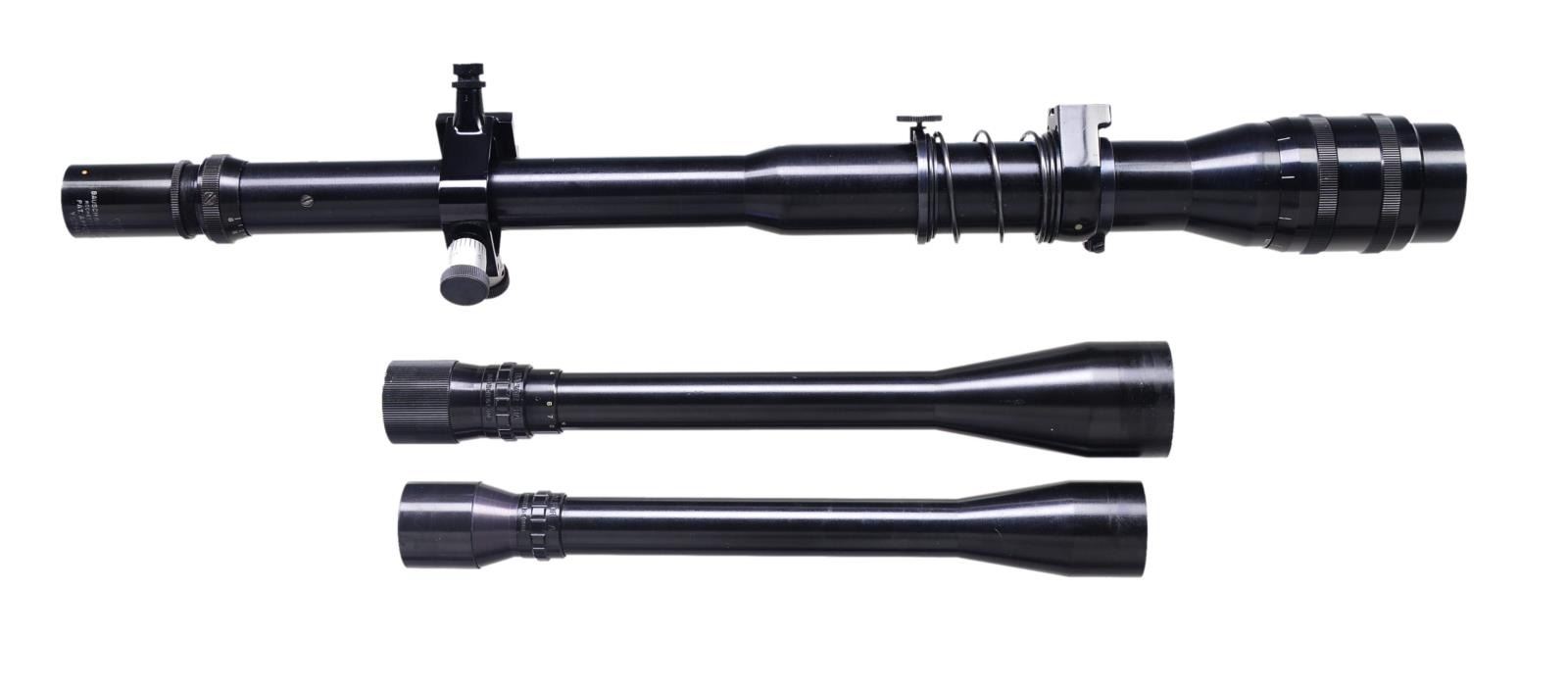 1) BALVAR 6-24 POWER TARGET. S# YG3567. Considered by many to be the ultimate target / varmint scope during it's production period that ended 1973. Kuharsky rear mt. of Lyman/Unertl style rather than B&L dbl. ring. Quality optical design w/ inner portion of tube coated in flat black finish to enhance use. Includes recoil assembly, rear lens cap plus non factory plastic cup acting as front. Standard reticle consisting of thin tapered triangles mounted in first focal plane. When power is increased, reticle appears bigger but still subtends same amount of target. Still highly sought by Varmint shooters. CONDITION: very good to near excellent exterior w/ optics being crystal clear even at 24 power, yet 1 very sm. spot visible just above horizontal line & about 1/8 distance away from vertical line along w/ some peppery spots at outer edges of each quadrant. Specs do not appear at 12 power or less. Still very useable w/out noticeable distraction. 2) BALVAR 8A. Designed for use w/ B&L or Kuharsky adj. bases. Center pointed triangle reticle w/ appearance of not being perfectly centered at highest power due to first focal plane reticle. CONDITION: clear optics w/out specs. Very good to near excellent exterior finish w/ see through flip up lens caps. 3) BALFOUR A. Fixed 4 power w/ desirable post crosshair reticle. Butler Creek flip up lens caps. CONDITION: all aspects of scope near excellent w/ no sign of specs showing when viewing. (02-13920(3)/NW). $350-500.