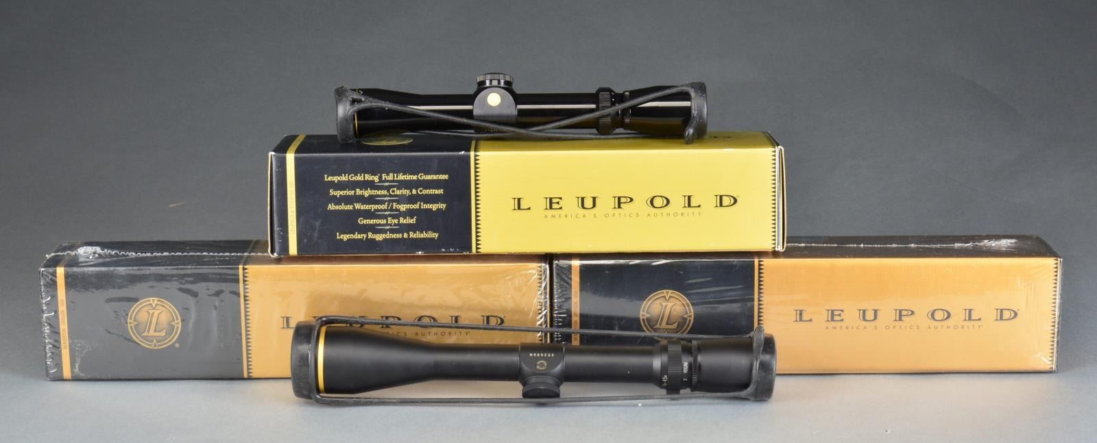 1) VX-3 new in sealed box 1.5-5X20 gloss finished w/ duplex reticle & 1" tube. 2) VXI new in sealed box 4-12X40 matte finished w/ duplex reticle & 1" tube. 3) VX1 as new in box 2-7X28 RF (rimfire) gloss finished w/ fine duplex reticle & 1" tube. 4) VX3 near excellent (no box) 4.5-14X40 matte finished w/ duplex reticle & 1” tube. PROVENANCE: From the Frederic W. Thrane Collection. (02-14150-1/NW). $600-850.