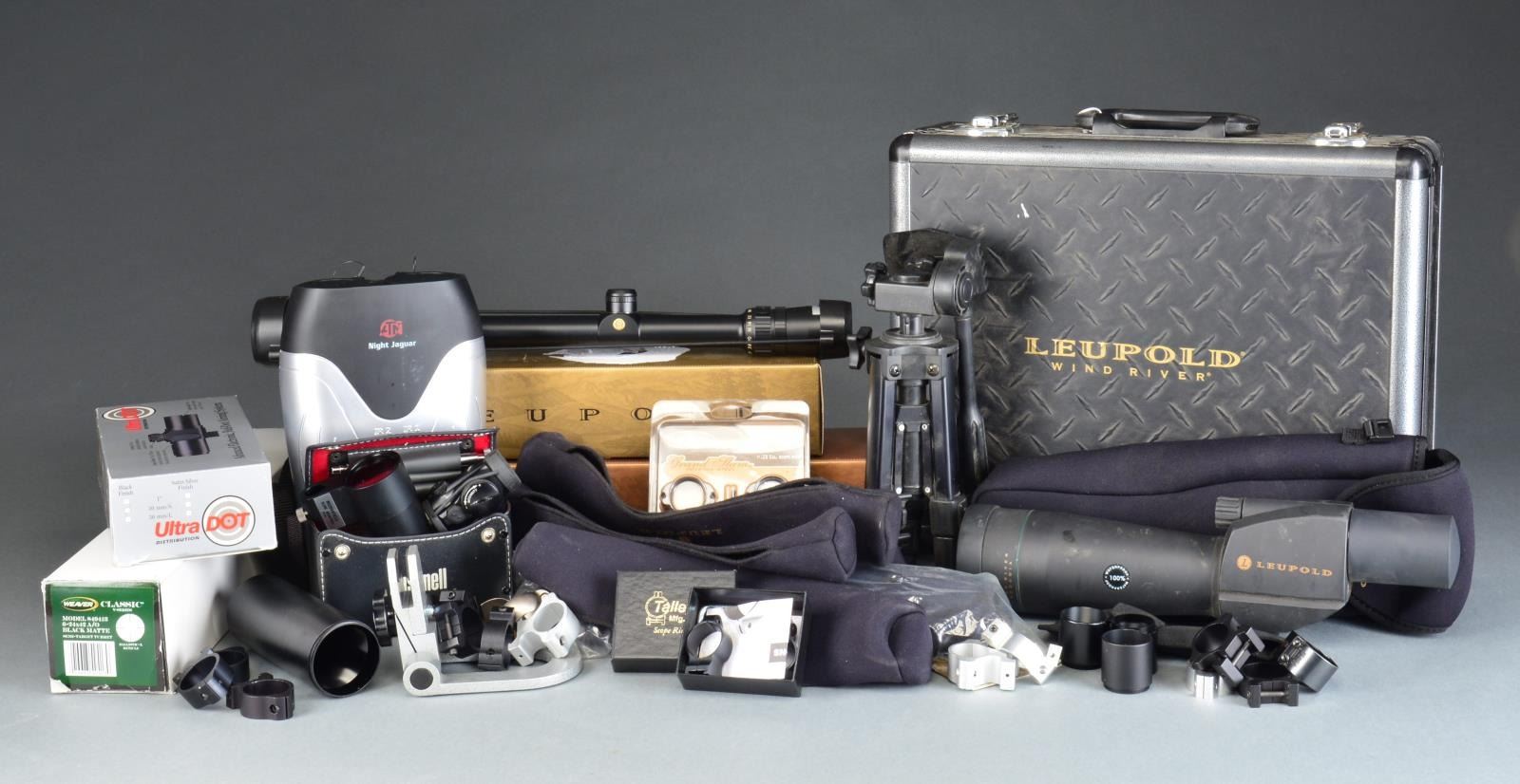 1) Leupold Wind River 15X-45X spotting scope w/ case, tripod & carry strap. 2) ATN Night Jaguar night vision binoculars w/ integral infrared illumination plus case & paperwork. 3) Weaver black matte finished 6-24X42 AO w/ 1" tube & ballistic reticle. 4) Bushnell Elite 8-32X40 AO matte finished scope w/ 1” tube & duplex reticle. 5) Ultra-dot black 30mm red dot sight; new in box. 6) Bushnell bore sighter set w/ 2 expandable arbors. 7) Laser bore sighter w/ nylon pouch. 8) Aimpoint Micro H-1 red dot sight. 9) Numerous scope rings; various brands including 2 Talley. 10) Numerous target turret caps; unknown application. 11) 20+ Lens hoods; mostly black in original wrappers (varying lengths). CONDITION: all items very good to near excellent. PROVENANCE: From the Frederic W. Thrane Collection. (02-14150-2/NW). $500-750.