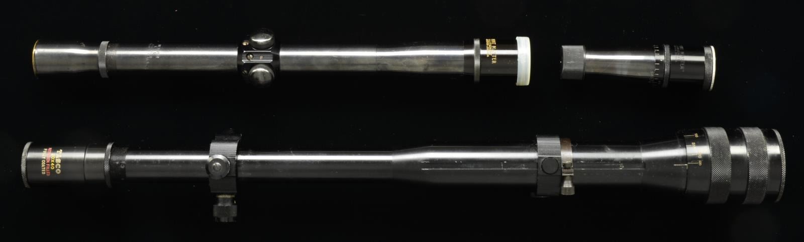 1) TASCO 20X40 TARGET SCOPE. Lyman/Unertl style scope of aluminum construction mfg. in Japan. Mfg. 1970's & somewhat scoffed at by purists due to aluminum construction & Japanese origin. Shooters soon learned the merits of its light weight, Nitrogen filling to prevent fogging & excellent optics. No recoil spring assembly. Crosswire reticle. Occasional light marks on exterior along w/ rub marks caused by mt. Overall very good appearance w/ near excellent optics. 2) WEAVER / LITSCHERT VARMINT SCOPE. Base K2.5 Weaver w/ installation of Litschert Varmint Master head marked w/ "8" & "K.25". Booster has AO w/ graduation lines coming at 8 o'clock position rather than 12 o'clock. Cross wire reticle & 8X function due to booster. Good plus appearance of basic scope & steel portion of booster having light marks w/ tube of basic scope appearing refinished. Black alloy front section of booster near excellent. Very good optics. 3) LITSCHERT VARMINT MASTER BOOSTER. Appearing for K2.5 Weaver or similar scope. Steel bell w/ black alloy front having natural aluminum screw in lens cap w/ spots of staining. Lens at front only; in need of cleaning. (02-13906/NW). $300-450.