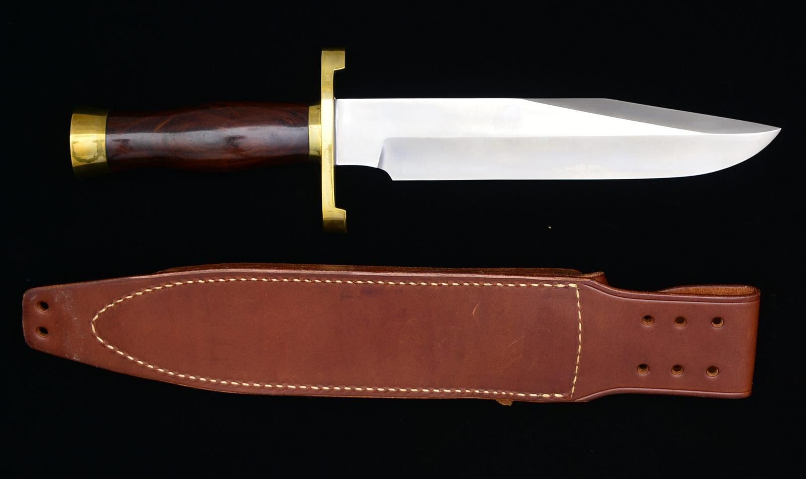HILT & SHEATH. 9" Blade, 14 1/8" overall. Blade is marked “RANDALL MADE/ ORLANDO FL.” & “S”. Wood handle w/ brass butt & inlaid oval brass plate on left side. Plate is unmarked. UNATTACHED ACCESSORIES: brown leather sheath w/ sharpening stone. Sheath is marked “RANDALL MADE KNIVES / ORLANDO FLA.”. Snaps are marked “RANDALL MADE”. Belt loop is punched w/ 6 holes & tip is punched w/ 2 holes. CONDITION: blade has very good appearance. Brass parts have slight discoloration & scattered handling marks. Wood grip is near excellent. Scabbard is near excellent, including tight stitching. PROVENANCE: Collection of Alan Bradley Shepherd. (02-14653/RW). $700-1,000.