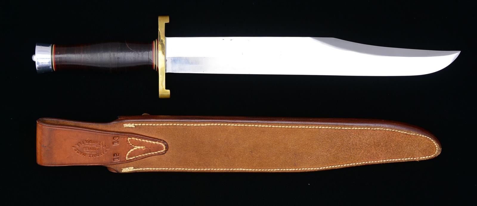BAG. 13" Blade, 18 1/2" overall. Blade marked “RANDALL MADE / ORLANDO FLA.”. Dbl. lugged brass hilt. Leather handle. Silver colored buttcap. UNATTACHED ACCESSORIES: brown leather sheath w/ sharpening stone. Sheath is marked on back of belt loop “RANDALL MADE KNIVES / ORLANDO FLA.”, “12”, & “13”. Plain snaps. Knife also has black padded zipper case in very good condition marked “RANDALL MADE KNIVES / ORLANDO FL.”. CONDITION: blade has scattered spots of discoloration on both sides w/ scattered sm. scratches. Hilt has areas of discoloration on both sides & light wear. Leather handle has light overall wear. Buttcap has light wear & handling marks. Scabbard has light wear & staining. Stitching is tight. PROVENANCE: Collection of Alan Bradley Shepherd. (02-14655/RW). $600-900.
