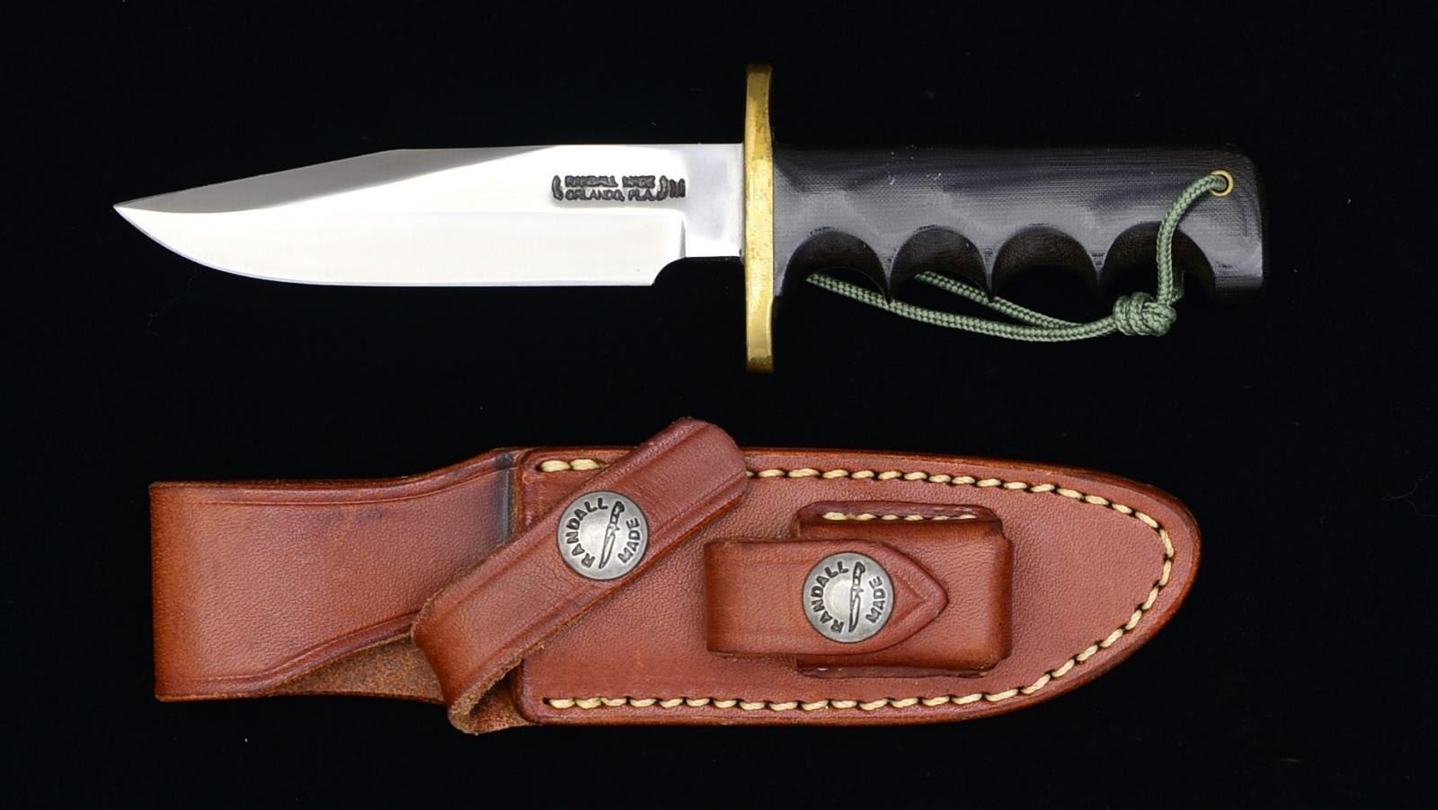 SHEATH. 3 5/8" Blade, 6 2/4" overall. Brass dbl. hilt. Grooved micarta handle. Blade marked “RANDALL MADE / ORLANDA FLA.” & “M”. Blade is additionally marked “1362”. UNATTACHED ACCESSORIES: brown leather sheath w/ sharpening stone. Sheath is marked on back “RANDALL MADE KNIVES / ORLANDO FLA.” & logo for “The Randall Knife Society”. “RANDALL MADE” snaps. CONDITION: knife is in very good condition. Hilt has staining & light wear. Sheath is in very good condition w/ tight stitching. PROVENANCE: Collection of Alan Bradley Shepherd. (02-14665/RW). $350-550.