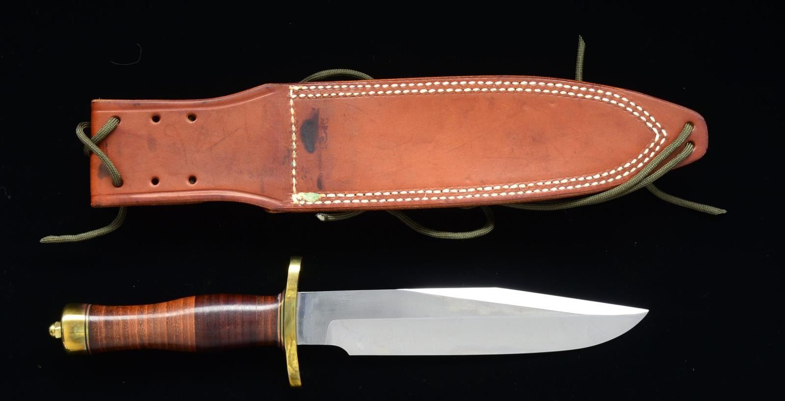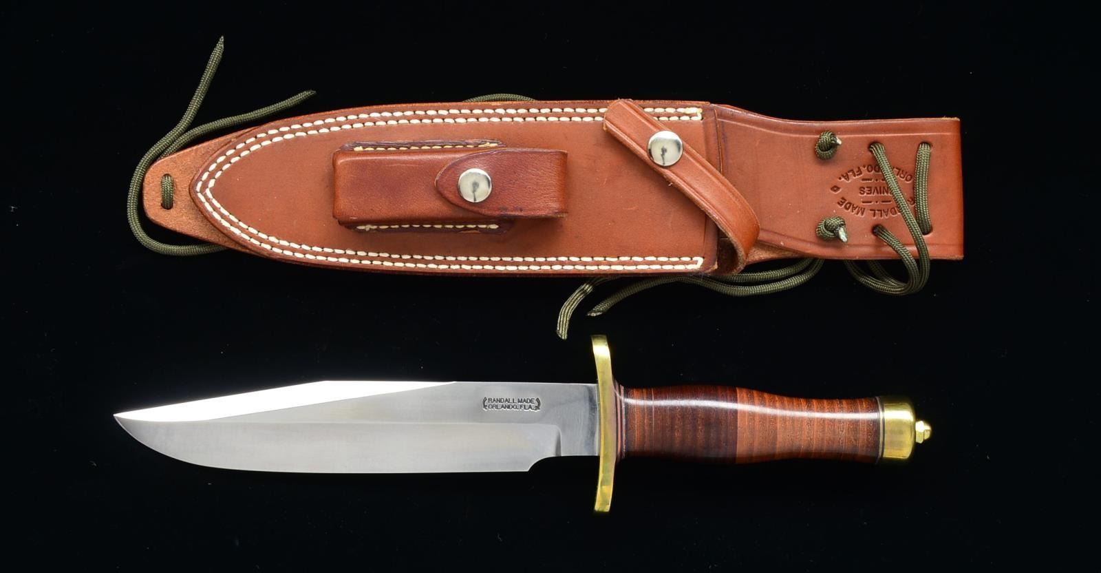 Blade length: 7 1/2” all purpose style. Overall length: 12 9/16”. Forward swept brass dbl. hilt. Commando style leather washer handle. Brass pommel. Left side of blade marked “RANDALL MADE KNIVES ORLANDO, FLA”. Brown leather scabbard w/ sharpening stone & plain snaps. Marked on front side of belt loop “RANDALL MADE KNIVES ORLANDO FLA”. CONDITION: near excellent blade. Hilt has lightly stained appearance. Very good handle & brass pommel. Very good scabbard w/ sm. stain on back. (02-13555-2/RW). $500-800.