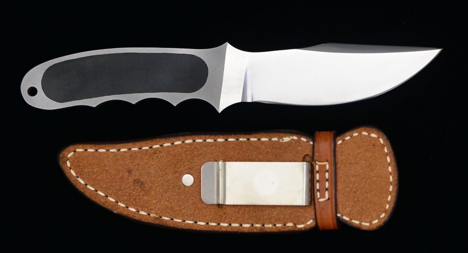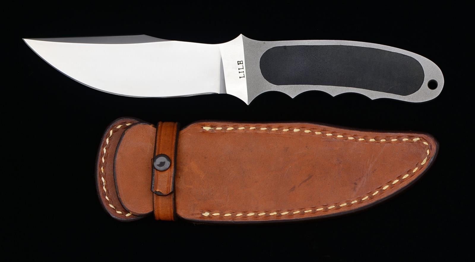 Blade: 4 1/4". Overall: 8 3/4". Blade is marked “LILE”. Handle has dull finish w/ finger grooves, lanyard hole & composite panel. Brown leather boot sheath w/ metal clip. CONDITION: blade has over good overall condition w/ several scattered handling marks. Sheath has very light wear. & sm. stains. Stitching is tight. (02-14638-1/RW). $300-500.