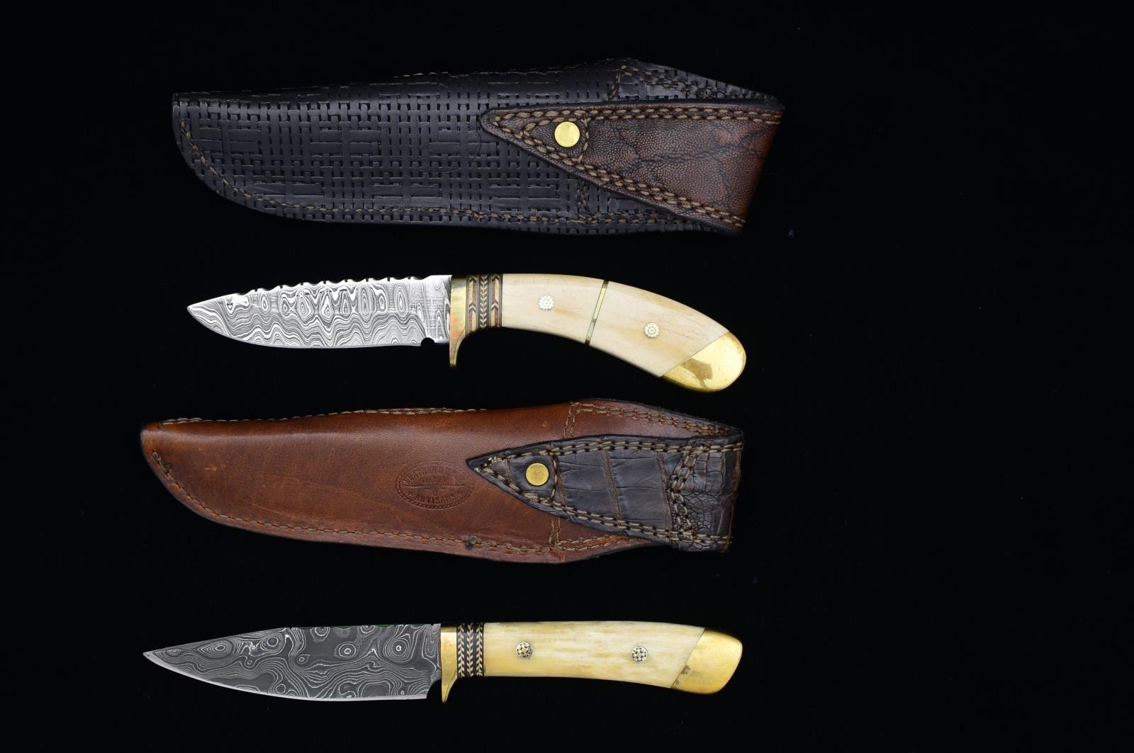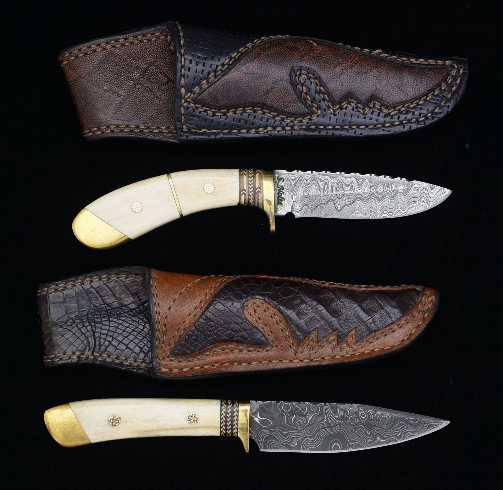 1) Blade 4 3/4". Overall: 9 1/2". Full tang knife w/ attractive Damascus patterns. Crosshatched spine. Brass hilt & pommel. Bone handles held by 2 rivets. Blade is marked “S. NOLTE”. Alligator sheath marked on back “LEATHER MORE MAKER ARTISANS”. CONDITION: blade & handle are very good. Brass hilt & pommel have light wear & discoloration. Sheath in very good condition w/ tight stitching. 2) Blade: 4 1/4". Overall: 9". Full tang Damascus blade knife. Curved bone handle w/ brass hilt & pommel. Bone handle is made in 4 parts w/ brass divider. Tooled leather sheath marked on back w/ illegible logo. CONDITION: blade in very nice condition. Bone handle is very good. Brass parts have slight discoloration. Sheath very good condition & tight stitching w/ notable 1/4" scar on front. (02-14638-11/RW). $700-1,000.