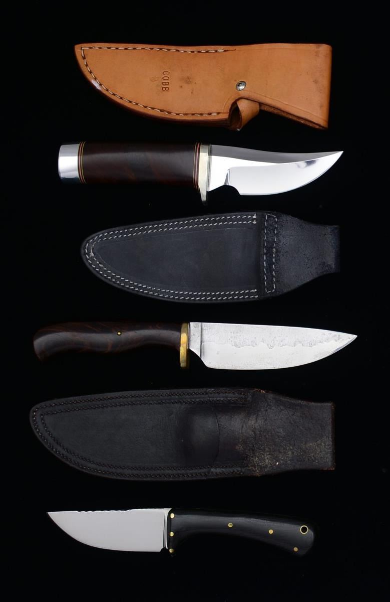 1) LOWELL COBB SKINNER. Blade: 4 1/4". Overall: 8 7/8". Hilt w/ finger guard. Wooden handle & silver colored pommel. Tooled leather sheath marked on back "COBB" & marked on front "SOUTHERN CLASSIC GUN & KNIFE SHOW". CONDITION: knife in very good condition w/ light high point wear. Sheath is near excellent w/ tight stitching. 2) SKINNING TYPE KNIFE MARKED "RG". Blade: 3 1/4". Overall: 8 1/8". Full tang w/ brass rivets & brass lined lanyard hole. Spine has thumb grooves. Unmarked dark brown leather sheath. CONDITION: knife in very good to overall condition w/ scattered tiny handling marks & light staining in pommel area. Sheath has light wear, staining & flexing. 3) KNIFE MARKED "RG". Blade: 3 1/4". Overall: 10 1/8". Blade has somewhat roughened Damascus like appearance. Brass hilt & contoured dark wooden handle held w/ single brass pin. Tooled black leather sheath w/ tiny “RG” logo. CONDITION: knife has very light wear & handling marks. Hilt has light staining discoloration. Sheath has light wear & handling marks, but stitching is tight. (02-14638-12/RW). $300-500.