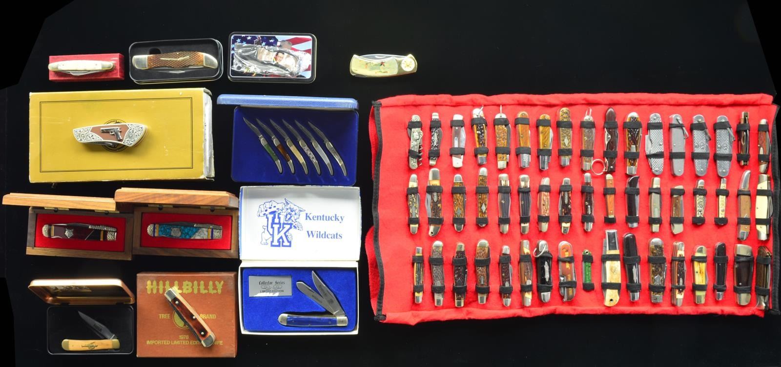 2 Wooden boxed folding knives by Brian Yellowhorse. Single 3 3/8” blade knives w/ folding guards. 1 Has wolf theme & 1 has bear theme. / 1 Boker The Hillbilly 2 blade folder w/ nickel silver fittings in display box. / 1 Old Ram German Kentucky Wildcats Commemorative. 2 Blade folder w/ blue handle in box. / 1 Franklin Mint single blade folder commemorating Colt 1911 Automatic. Blade: 3 1/8”. Metal handle & miniature Colt 1911 on grip panel. Knife w/ padded pouch & factory pouch. / 1 John Wayne commemorative locking folder in metal case. / 1 National Rifle Association commemorative folding in metal case. / 1 The Rifleman Series Rough Rider lg. 2 blade folder in metal case w/ sleeve. / 1 Historic Military Aircraft veteran’s commemorative, The Mustang. Metal grips w/ panels commemorating the P51 Mustang Fighter. / 1 End of an Era commemorating Paul "Bear" Bryant w/ box. / Sunday Go to Meeting 6 Knife set. Knifes is fitted display case. Blades 1 3/4" marked “Princess”. / Collector’s vinyl display roll w/ red interior containing 30 assorted pocket knives. Makers include Remington, Western, Imperial, Camillus. CONDITION: ranges from good to nearly new in box. Boxes may have wear, scratches, staining & flaking finish. Tool roll in very good condition. (02-14639-5/RW). $400-600.