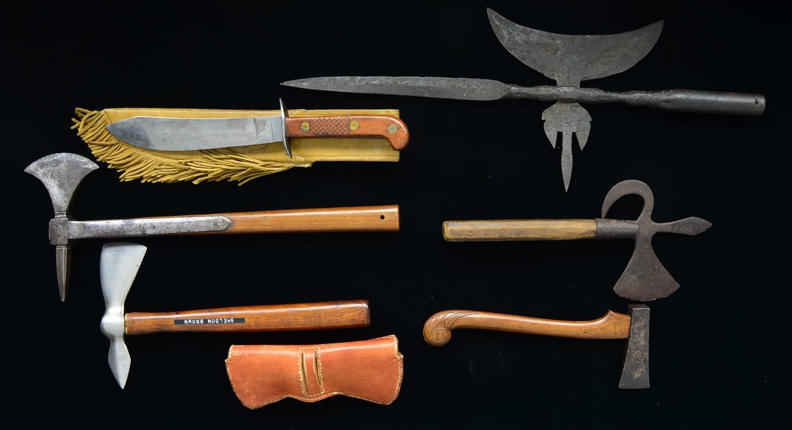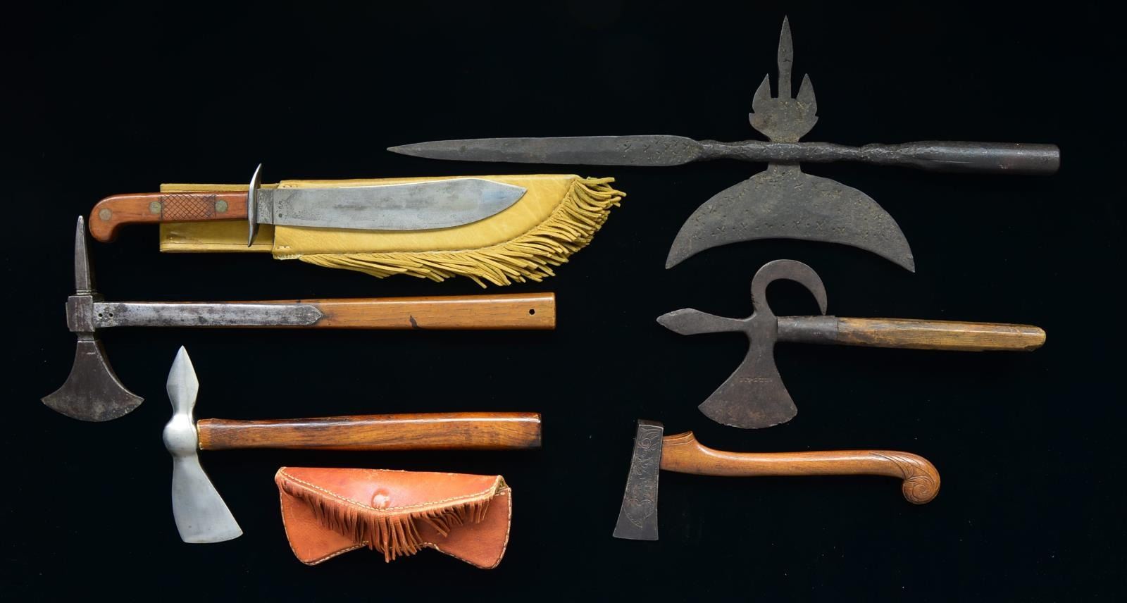 A mixture of early & late weapons of interesting style & form. 1) BOARDING AX. Overall length: 17 1/2". Head width: 7". Iron head has a 3" blade combined w/ a 2 3/4" pike. The ears extend nearly 8" down the haft. Because of weight & overall reinforced construction, we believe this is an early boarding ax. At the top of 1 ear are 2 holes that likely originally attached an iron belt hook. The wooden haft, though early, is possibly not original to the head. CONDITION: head has a dark gray, mottled patina. Wood has a smooth, lightly worn finish. 2) SMALL AX. Overall length: 10 3/8". Head width: 4". Iron head is decorated on both sides w/ a heart & foliate motifs. The top is decorated w/ what appears to be an arrow fletch. Stylized curved wooden haft has a scroll motif at the butt. CONDITION: head has a dark, somewhat mottled patina. Haft has a smooth lightly worn finish. 3) HALBERD HEAD. Overall length: 12 1/2". Width: 5 5/8". Iron head has a 3" blade combined w/ a 3" flat spike at the top & a heavily curved hook opposite the blade. Blade is stamped “J.PETT” w/ an illegible mark after the final “T”. Halberd appears to have a solid tang w/ a 2" iron collar supplying extra support. A partial wooden haft approx. 7" long is attached. CONDITION: head has an overall dark oxidized patina w/ numerous nicks to the blade edge. Wooden haft shows great age. 4) HALBERD HEAD. Overall length: 22". Width: 8 1/2". A lg. hand forged, crude iron head w/ numerous stamped dot & cross decorations throughout. Hollow shaft to facilitate insertion of a pole w/ securing pole near the base. Quarter moon shaped blade w/ 3 pointed thorn. CONDITION: dark overall patina. 5) BELT AX. A modern reenactor type belt ax measuring 12 1/2" overall w/ a 7" head. Complete w/ fringed leather sheath. CONDITION: blade has a bright finish. Haft shows light wear. Sheath shows moderate wear. 6) BELT KNIFE. A late 19th century belt knife measuring 14" overall w/ an 8 3/4" modified unmarked bowie blade. Iron crossguard. 2 Piece wood grips w/ crosshatching. Modern cream colored leather sheath w/ fringe. CONDITION: blade has a medium gray lightly mottled patina. Grips shows light wear. Scabbard shows light wear. PROVENANCE: From the Collection of John "Tim" Breth Jr. (02-13833/BF). $500-1,000