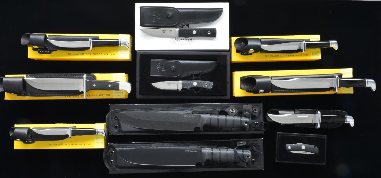 Several knives, the majority of which are packaged for retail sale. In this lot there are 3 examples mfg. by FÄLLENKNIVEN of Sweden in boxes w/ original sheaths which includes: The TK4C folding knife w/ 3" blade, the TK2 fixed blade survival knife w/ 8.75" overall length & thermorun handle, as well as the TK6 fixed blade hunting knife w/ 7.25" overall length & thermorun handle. / 2 OKC survival knives which measure 14.5" overall length & have a kraton handle, including the Gen II SP-50 & Gen II SP-51. Both knives are in original box w/ lanyards along w/ nylon sheath. / 5 Buck Knives in factory packaging w/ sheaths & 1 w/ no box. All knives, unless otherwise noted, have phenolic handles. The knife w/o a box is a model 119 “Special” fixed blade measuring 10.5" overall. 1 102 “Woodsman” fixed blade measuring 8" overall. 1 118 “Personal” fixed blade measuring at 8.75" overall, the blade has been engraved “D2”. 1 120 “General” knife measuring 12.5" overall. 1 105 “Pathfinder” measuring 9.25" overall. / 1 124 “Frontiersman” knife measuring at 12" overall w/ black micarta scales & aluminum pommel, as well as guard. UNATTACHED ACCESSORIES: 5 1/2"x4 1/2" Buck acrylic Buck Knife display. (02-13945-3/JZ). $450-900.