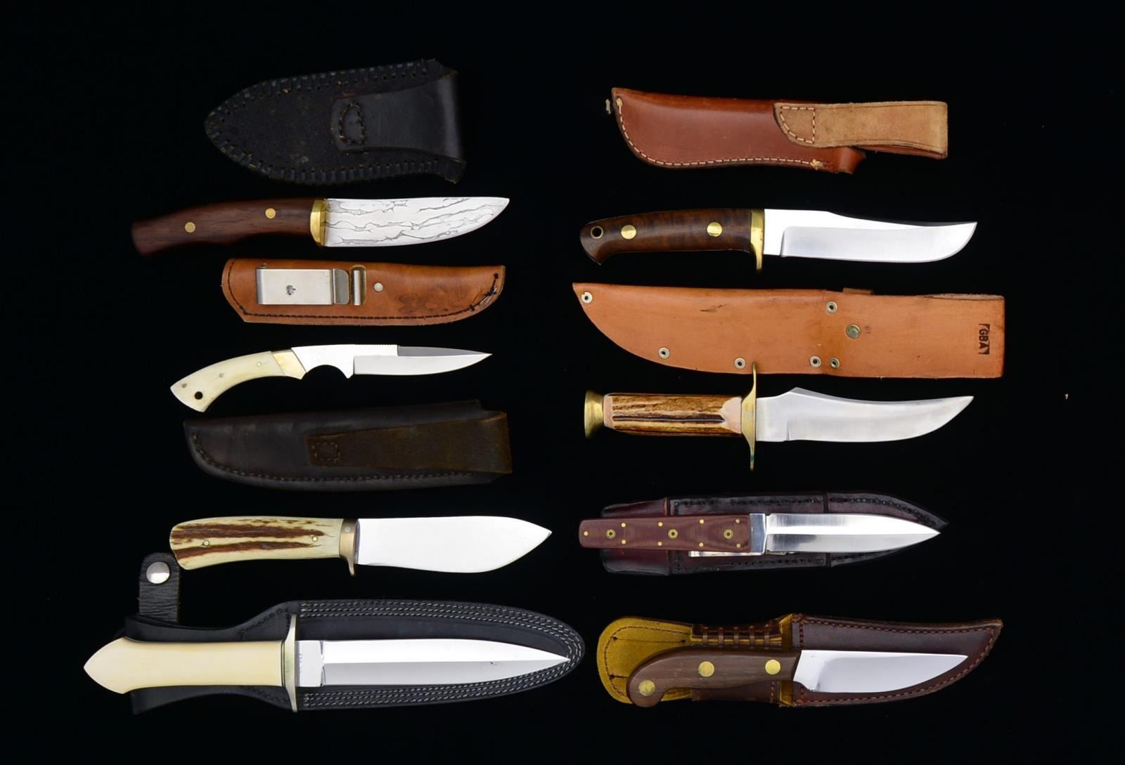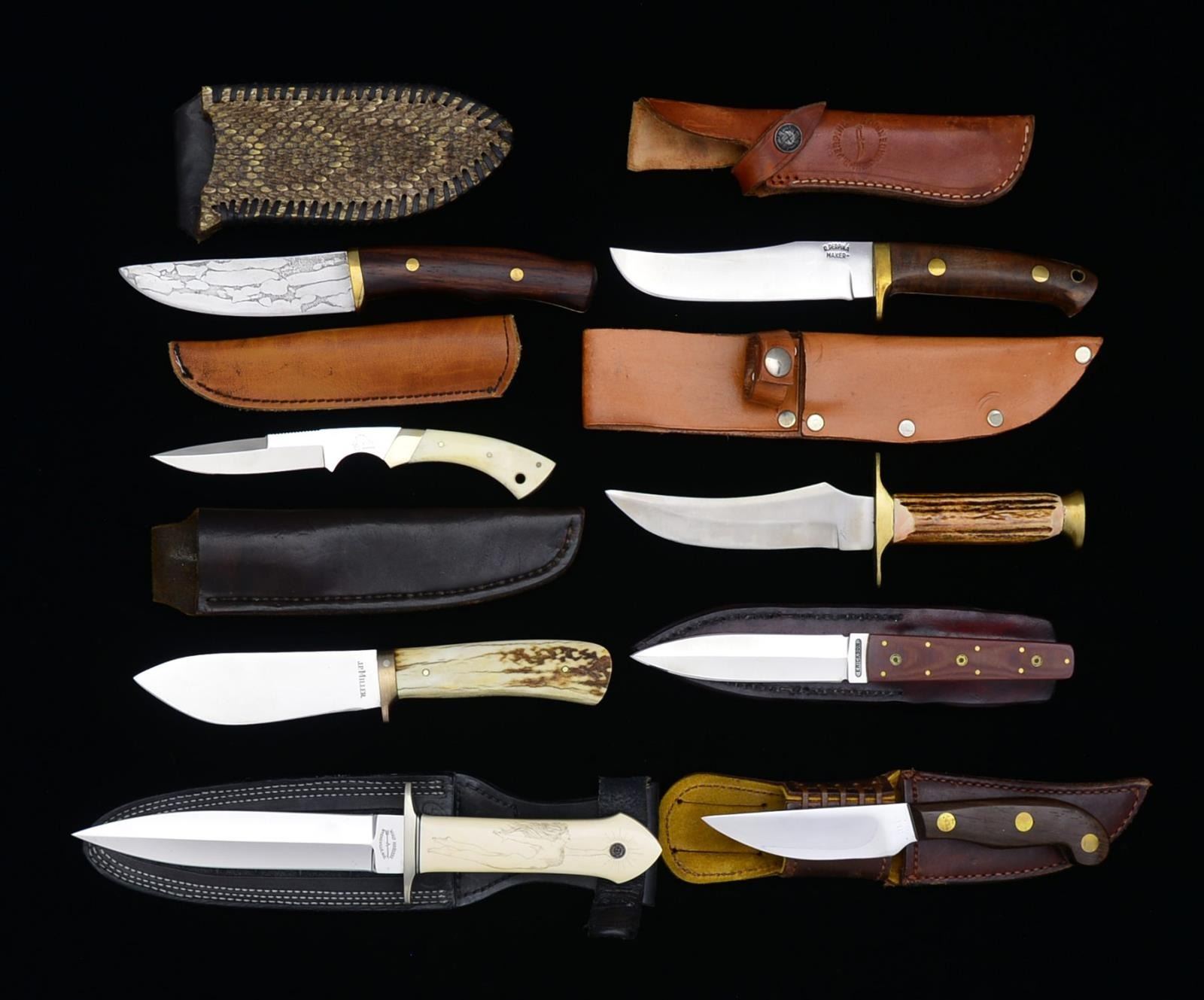 1) R. PERPINA. Blade: 5 1/4". Overall: 10". Brass single hilt. Wood handle w/ 2 brass rivets & lanyard hole. Brown leather sheath marked “R. PERPINA HAND MADE KNIVES”. 2) JP MILLER SIOUX SKINNER. Blade: 5". Overall: 9 1/2". Single hilt. Stag handles. Unmarked brown leather sheath. 3) LEE JR. SKINNER. Blade: 4 1/4". Overall: 8 1/2". Wood handle w/ 3 brass rivets. Unmarked brown leather sheath. 4) WALT HARLESS. Blade: 6 3/4" dbl. edge. Overall: 11 3/4". Has dbl. hilt. White imitation ivory handle w/ 25th anniversary inlay w/ scrimshaw has female motif. Tooled black leather sheath. 5) JUDY SAMSON CUSTOM WEEHAWK BOOT KNIFE. Blade: 5". Overall: 9 1/4”. Imitation ivory scales. Unmarked brown leather sheath w/ belt clip. 6) GARY ALLEN SKINNER BLADE. Blade: 5 1/2". Overall: 9 3/4". Dbl. brass hilt. Stag handle & brass pommel. Dated 1997.Riveted brown leather sheath marked “GBA”. 7) UNMARKED DAMASCUS SINGLE EDGE KNIFE. Blade: 4 3/4". Overall: 9 1/2". Contoured wooden handle attached by 2 rivets. Tooled leather sheath w/ lace type stitching. 8) ERICKSON DOUBLE EDGE BOOT KNIFE. Blade: 4 3/4". Overall: 8 7/8”. Composite grips overall full tang. Brown leather sheath w/ metal belt clip. CONDITION: all knives & sheaths are very good condition unless otherwise noted. (02-14638-10/RW). $500-700.
