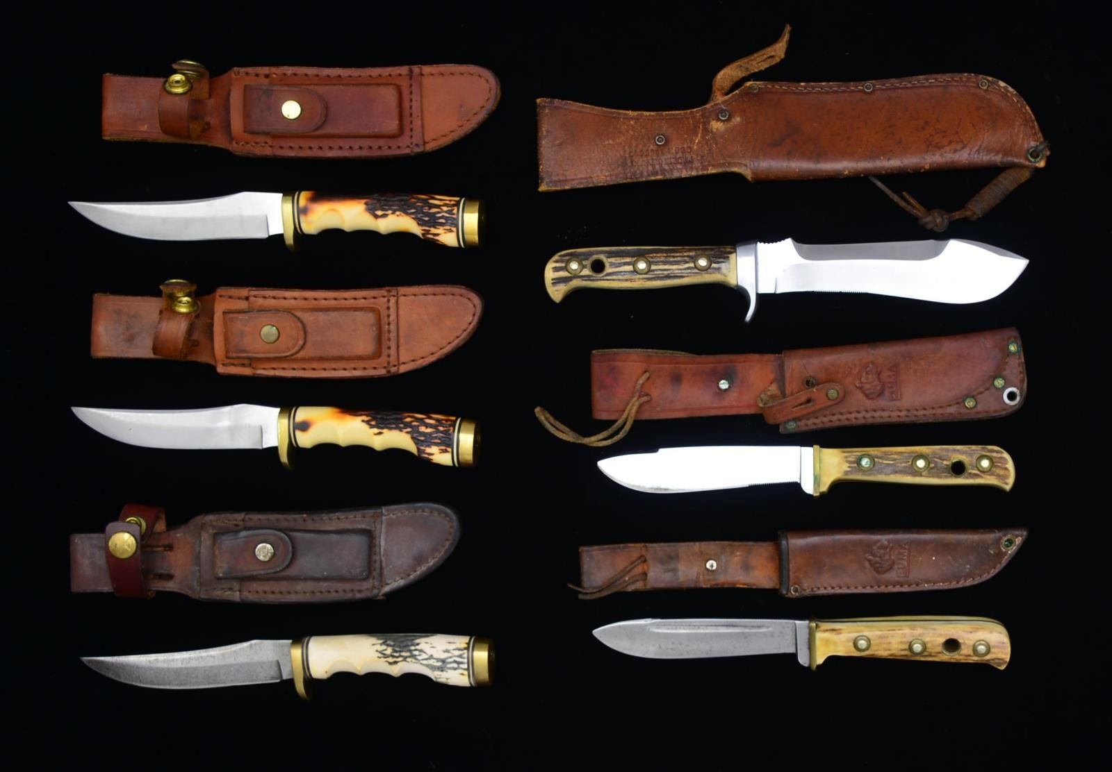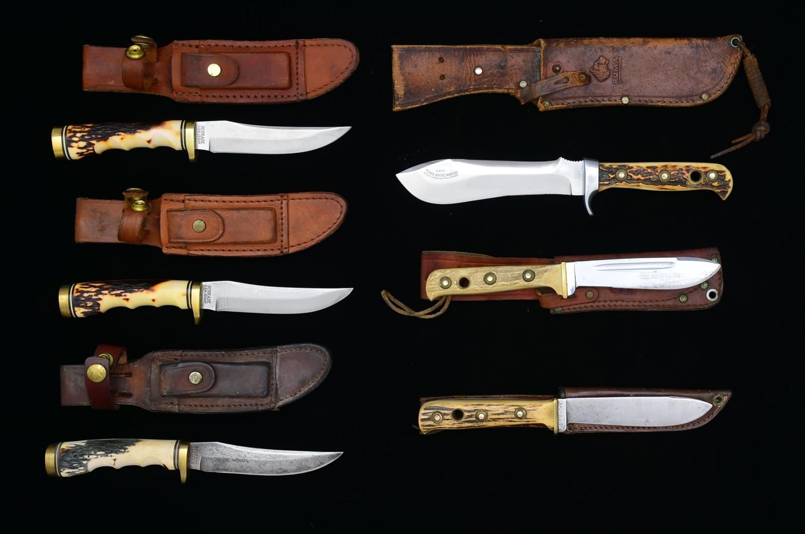 1) PUMA WHITE HUNTER. Blade: 6”. Overall: 10 3/4". Blade is marked “PUMA WHITE HUNTER GENUINE PUMASTER STEEL GERMANY”. Hilt w/ finger guard. Stag bird’s head grips w/ 3 rivets & brass lined lanyard hole. Brown leather sheath w/ raised Puma logo & rawhide thong. CONDITION: knife has light overall wear. Stag grip has missing chip at lanyard hole on left side. Sheath has wear, scuffing & flexing, but stitching appears tight. 2) PUMA HUNTER’S FRIEND. Blade: 4 3/4”. Overall: 9 1/4". Single fullered blade w/ grooved spine. Blade marked on right side “HANDMADE PUMA HUNTERS-FRIEND GENUINE PUMASTER STEEL GERMANY’. Brass hilt & bird’s head stag grip. Brass lined lanyard hole. Brown leather sheath w/ Puma logo marked “MADE IN GERMANY”. CONDITION: knife has moderate wear overall. Blade has been sharpened w/ scratches & staining. Sheath has wear, scuffing & staining. Stud for retaining strap is not present. 3) PUMA. Blade: 4 7/8”. Overall: 9 1/4". Unmarked single fullered blade in general style of Hunter’s Friend. Brass hilt. Bird’s head stag handle w/ brass lined lanyard hole. Leather sheath w/ Puma logo marked “MADE IN GERMANY” w/ thong type knife retention. CONDITION: knife is well worn w/ blade has cleaned appearance w/ scattered fine pitting throughout. Handle has very light wear. Notable discoloration at end of pommel. Scabbard has wear, flexing & staining. Retaining thong has been shortened. 4) SCHRADE 153UH GOLDEN SPIKE. Blade: 4 3/4". Overall: 9 1/4”. Blade is marked “SCHRADE USA 153UH”. Brass hilt w/ finger guard. Grooved stag handle & brass pommel. Brown leather sheath w/ sharpening stone. CONDITION: knife has been lightly sharpened w/light wear & discoloration. Brass has light wear. Stag handle very good appearance. Worn leather sheath w/ staining. Stitching is tight. 5) SCHRADE 153UH GOLDEN SPIKE. Blade: 5". Overall: 9 3/8”. Blade is marked “SCHRADE USA 153UH”. Brass hilt w/ finger guard. Grooved stag handle & brass pommel. Brown leather sheath w/ sharpening stone. CONDITION: blade has been sharpened w/ light wear & fine scratches. Brass has light wear. Stag handle has scattered light scratches & notable spot of staining on right side. Worn leather sheath w/ staining. Stitching is tight. 6) SCHRADE 153UH GOLDEN SPIKE. Blade: 5". Overall: 9 3/8”. Blade is marked “SCHRADE USA 153UH”. Brass hilt w/ finger guard. Grooved stag handle & brass pommel. Dark brown leather sheath. CONDITION: blade has been cleaned & lightly sharpened w/ light pitting throughout. Brass parts show moderate wear. Stag handle has sun bleached appearance w/ light wear & staining. Scabbard has moderate wear, staining & scratches. Sharpening stone not present. Replacement retaining strap is detached. (02-14638-5/RW). $300-500.