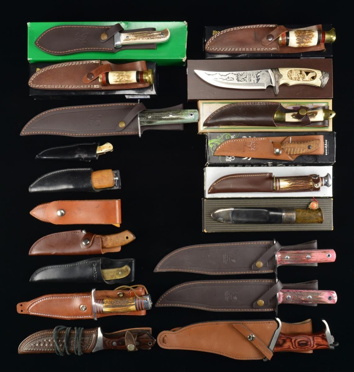 Includes: 1 Harley Davidson Electroglide 40th Anniversary w/ gold colored engraving. Blade: 8" in velvet lined wooden glass fronted display case. / 1 Modified Bowie knife w/ blade 7 3/4". Brass hilt & stag handle. Blade marked “RC”. Knife in wooden glass fronted display case. Knife inletted into foam & velvet lining w/ hobbyist workmanship. / 5 Hen & Rooster lg. hunting knives w/ sheaths. 3 Have factory boxes. Made w/ German stainless steel in Spain. 4 Are Bowie, 1 resembles Puma White Hunter. Blade lengths run from 6" to 9 3/4". / Ducks Unlimited 2 Piece cutlery set. / 1 Peer Gynt Knife marked “DAVID – ANDERSON NORWAY” w/ factory box. / 3 Unmarked knives in display boxes: 2 eagle & 1 wolf. Approx. 6 1/2" blades. / 1 Finnish MARTTIINI Eagle knife. Rosewood handle & stainless blade. Blade: 4 3/4" w/ wooden handle w/out hilt. Has Leather sheath & slide top box w/ factory instruction book. / 1 Voss Cutlery German skinner type w/ embossed logo on blade. Single helt w/ finger guard. Stag handle. Brass bird’s head pommel. Brown leather sheath. In original box. / 1 Boker Original Bowie blade: 5". Stag handle . Brown leather sheath & factory box. / 1 Whitetail Cutlery Blade 5" blade damascus w/ stag handle. Factory box containing knife & brown leather sheath. / 1 BenchMade Bone Collector. Blade: 4". Wood grips. Factory box containing knife & brown leather sheath. / 1 Voss Cutlery. Blade: 5 1/2". Stag handle. Factory containing knife & brown leather sheath. / 1 Hibben III. Blade: 8" slotted Bowie blade. Steel dbl. hilt. Finger guard butt. Laminated wood handle. Brown leather sheath marked “HIBBEN III”. / 1 Black Jack Model 1-7. Blade: 5 1/2" bowie type. Dbl. hilt w/ stag handle. Brown leather sheath. / 1 Boker Magnum. Blade: 4". Wood grips. Brown leather sheath. / 1 Trac Kinves caping knife. Gold micarta handle. Brown leather sheath. / 1 Helle Besseggen drop point. Blade 3". Birch handle. Black leather sheath. / 1 Boker Hunter Argentina. Blade 6 1/4". Contoured wood handle. Embossed brown leather sheath. CONDITION: ranges from good to near new in box. Knives may have been lightly sharpened. Boxes may have wear & scuffing. (02-14638-8/RW). $600-800.