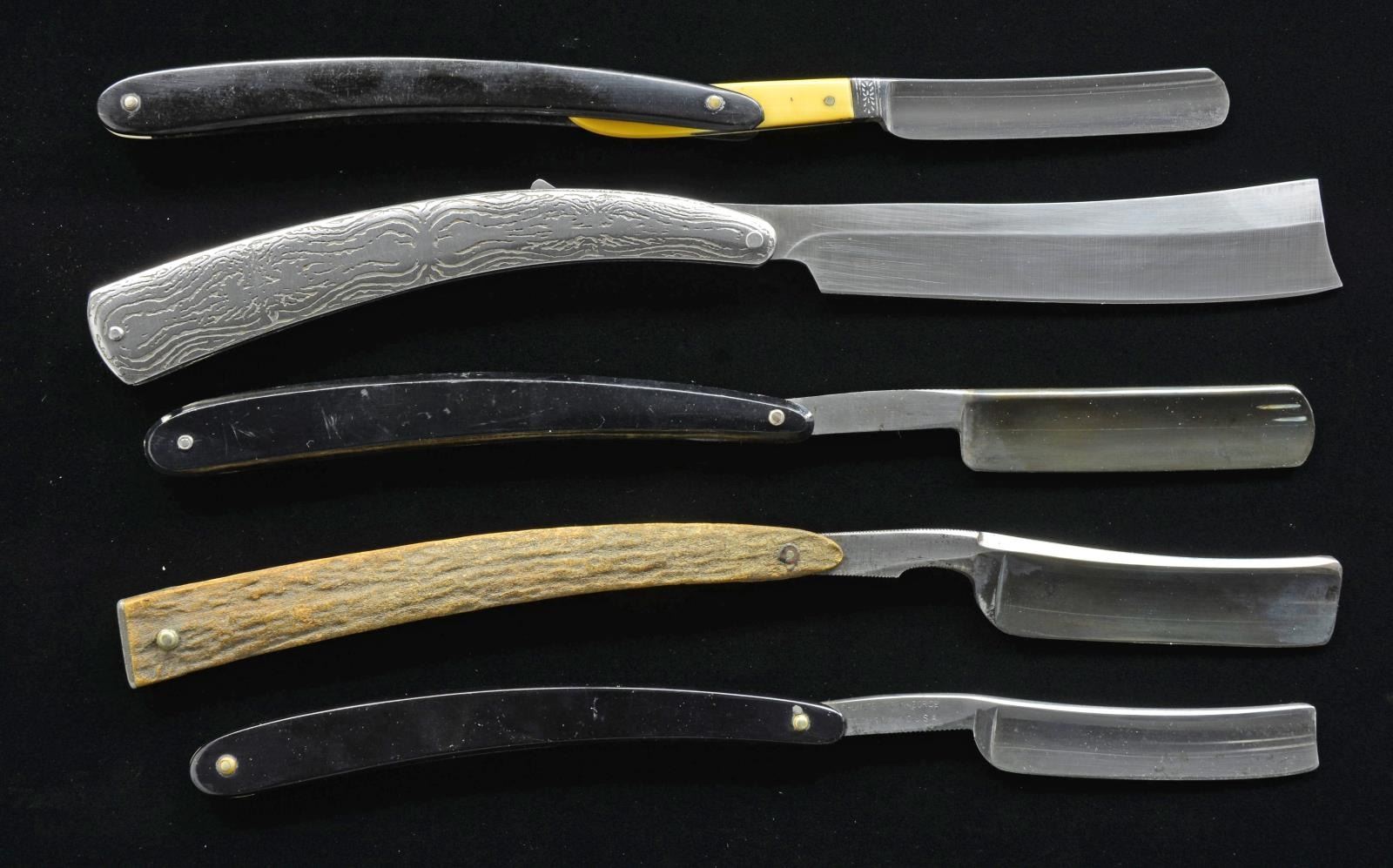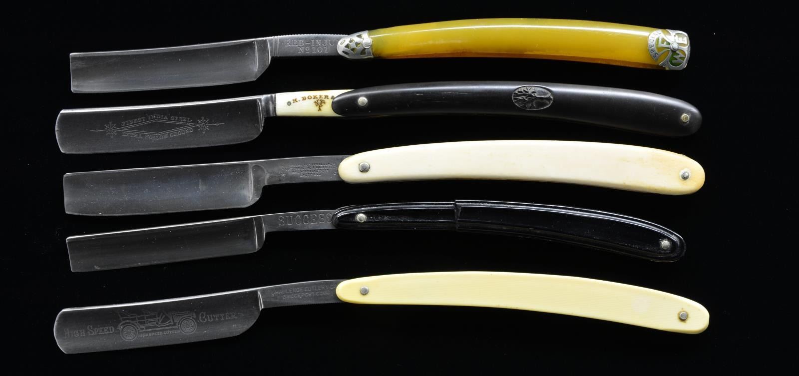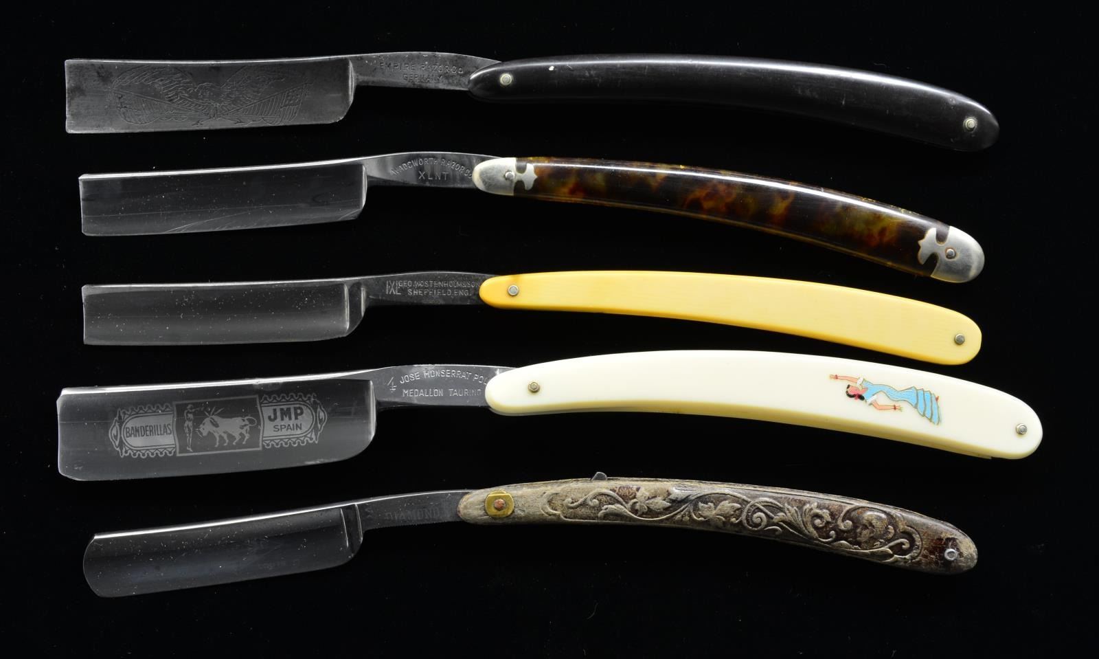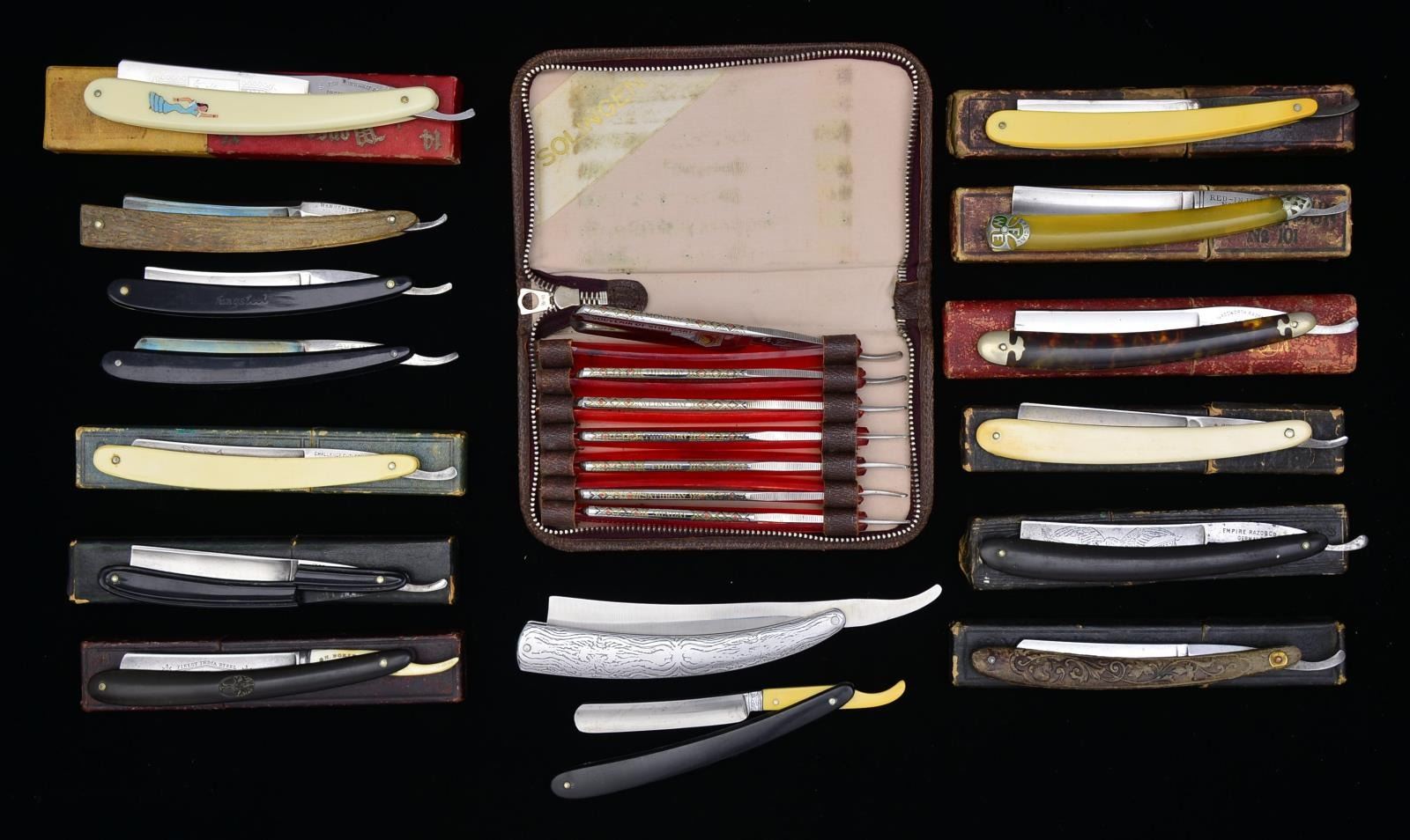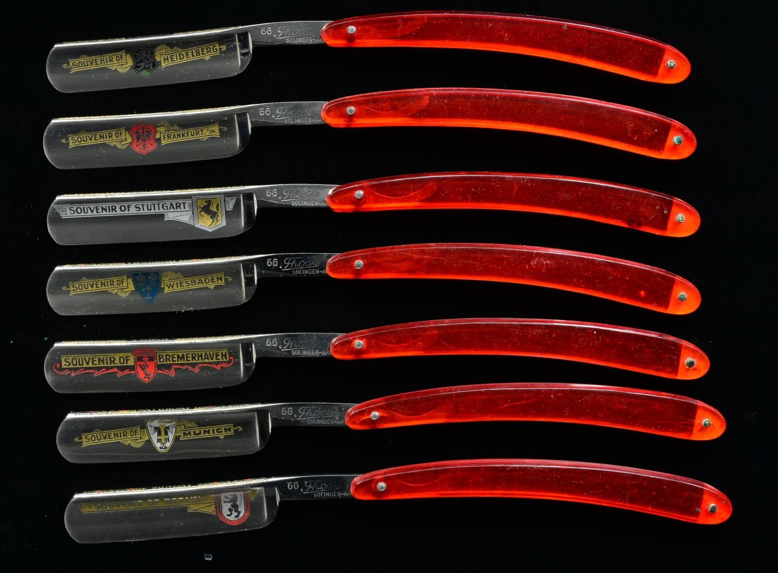Includes set of 7 razors from pre WWII Germany. Each marked for different city. Marked w/ "R & RF THOMAS SOLIGEN - WALD" & days of the week. Clear red colored handle. All contained in brown zippered leather case. / 10 Razors in 2 piece sliding cases. Most made in Germany. Cases are in well worn condition w/ scuffing, flexing & sm. tears. / 5 Razors w/out cases. Including 2 unmarked, 1 appears to be Asian origin. handles may have chipping or cracks. CONDITION: all in good to very good serviceable condition unless otherwise noted. (02-14639-2/RW). $200-450.