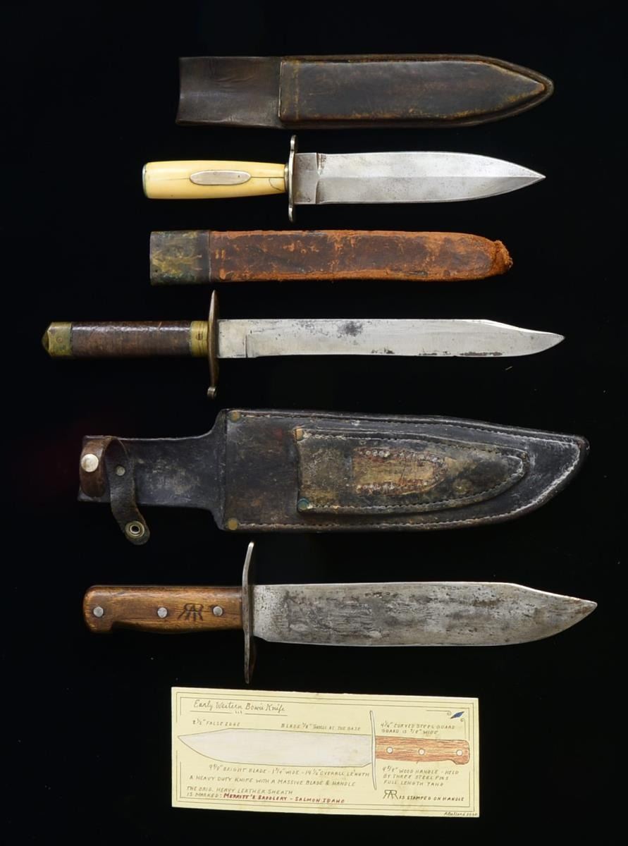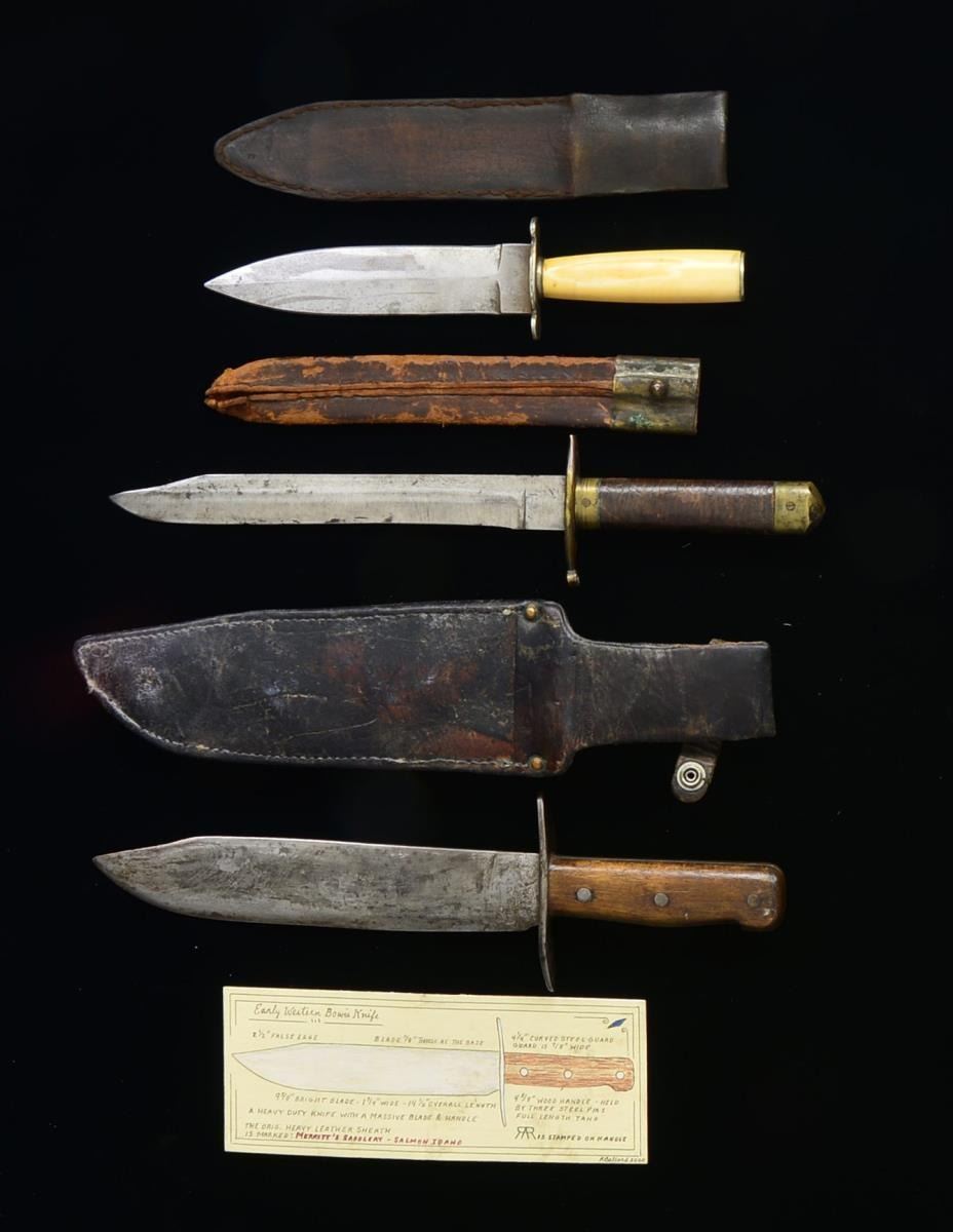 1) EARLY WESTERN BOWIE KNIFE. Overall length: 14 1/2". Blade length: 9 5/8”. Plain unmarked, bowie style blade w/ iron crossguard. 2 Piece wood grips w/ 3 iron rivets on each side. 1 Grip has a burned in mark resembling a brand. Heavy black leather sheath is marked on the reverse, “MERRITTS SADDLERY SALMON IDAHO”. Scabbard has a smaller sheath sewn to the front that does not have a knife. CONDITION: blade has a medium gray, lightly mottled patina. Grip & scabbard show moderate wear. 2) AMERICAN BELT KNIFE. Overall length: 11 3/8”. Blade length: 7”. Blade has a pronounced central medial ridge w/ a lobed German silver crossguard. 1 Piece certifiably antique ivory grip w/ a German silver escutcheon & pommel cap. Brown leather sheath w/ tin liner. CONDITION: blade has a light gray cleaned finish. Grip has a long crack on the face & a shorter crack extending up from the guard about 1/2". Sheath shows reasonably light overall wear. 3) AMERICAN BELT KNIFE. Overall length: 14 3/4”. Blade length: 9 1/2". The long slender blade has a 2 1/2" clip point & a pronounced ricasso. Brass guard w/ rings at the ends & engraving on the top & underside. Brass ferrule & pommel held in place by brass screws. Stacked leather washer grip. Brass mounted leather sheath w/ frog stud on the throat. CONDITION: blade has a light gray finish w/ evidence of sharpening. One of the rings at the ends of the guard is missing. Sheath shows heavy wear & is likely missing a brass tip. PROVENANCE: Collection of Roger Ballard. (02-14709-11/BF). $800-1,200.