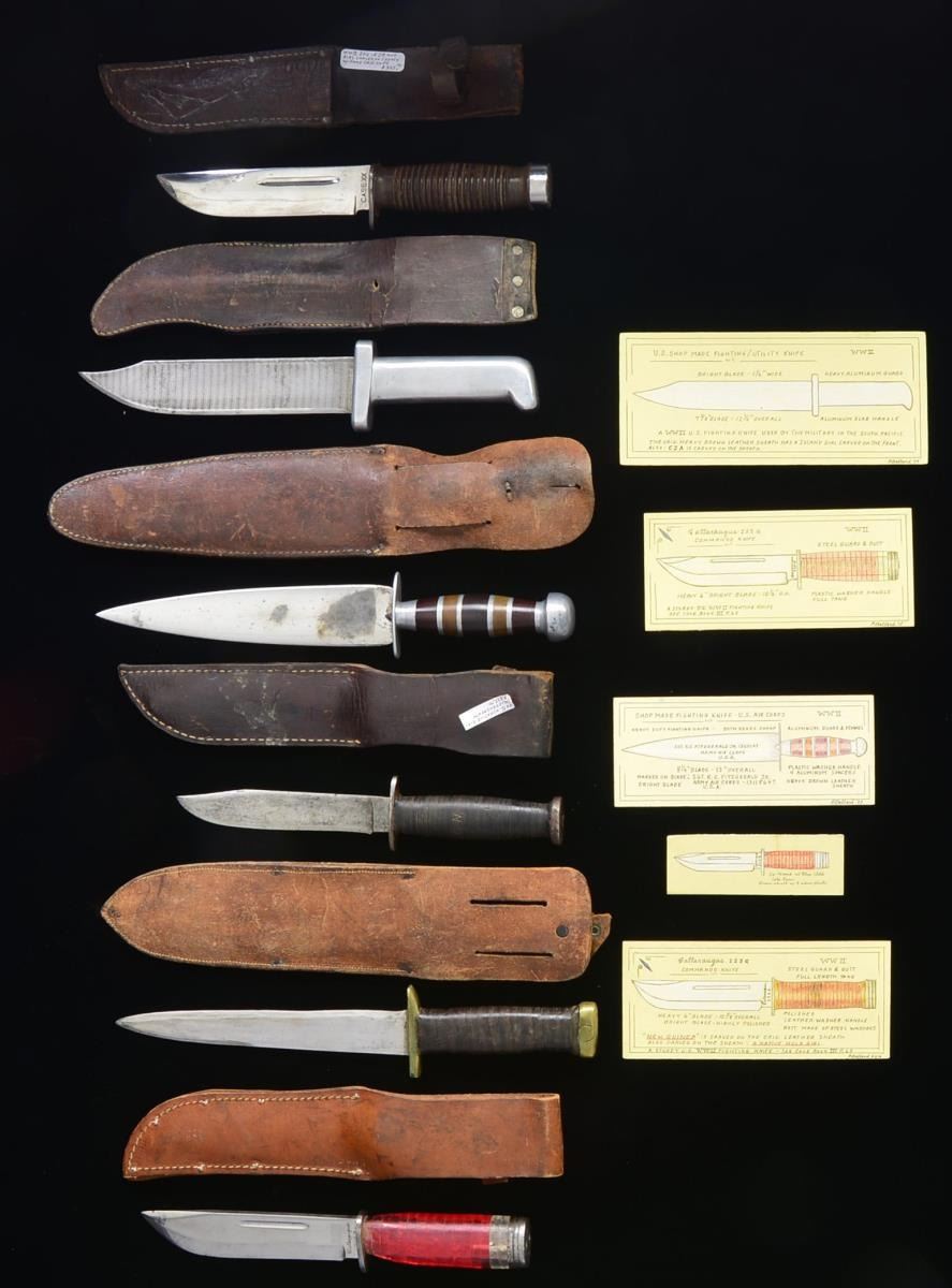 1) Overall length: 13”. Dbl. edged blade engraved horizontally w/ an etching pen, “SGT. R.E. FITZGERALD JR. 13118647 ARMY AIR CORPS U.S.A.”. Aluminum crossguard & pommel. Grip is fabricated from brown & black thick rings w/ aluminum spacers. Heavy brown leather sheath w/ a reclining buxom, nude woman resting on clouds adorning the front. CONDITION: knife & sheath show light wear overall. 2) Overall length: 10 7/8”. A Case Commando knife w/ a bright blade marked, “CASE XX” on 1 side & “ 337-6”0 ” on the other. Steel crossguard & pommel. Ribbed wooden grip. Dark brown leather sheath. Front of sheath is tooled w/ the initials, “E J R” & a nude female gazing skyward. CONDITION: knife shows light wear. Sheath shows moderate wear. 3) Overall length: 10 3/8”. A fighting knife w/ a plain unmarked blade. Steel crossguard & pommel. Stacked leather washer grip. Grip has cut initials “C.N. NS C.N.”. Dark brown leather sheath w/ a standing nude female on the front & the initials, “C.N.” on the back. CONDITION: knife & sheath show moderate wear. 4) Overall length: 13”. Plain unmarked blade. Brass crossguard & pommel. Stacked leather washer grip. Brown leather sheath w/ walking nude female in front of a sunrise on the front. CONDITION: knife & sheath show light to moderate wear. 5) Overall length: 12 1/2". Plain unmarked bowie style blade. 1 Piece cast aluminum grip. Dark brown leather sheath w/ tooled front featuring a frontal view of a nude standing female w/ the initials, “CJA” below. CONDITION: knife shows light wear. Sheath shows light to moderate wear. 6) Overall length: 10 1/2". Blade is marked, “CATTARAUGUS 225Q”. Steel crossguard & pommel. Grip is made from stacked red & clear rings. Brown leather sheath. CONDITION: knife & sheath show light wear overall. PROVENANCE: Collection of Roger Ballard. (02-14709-14/BF). $700-1,100.