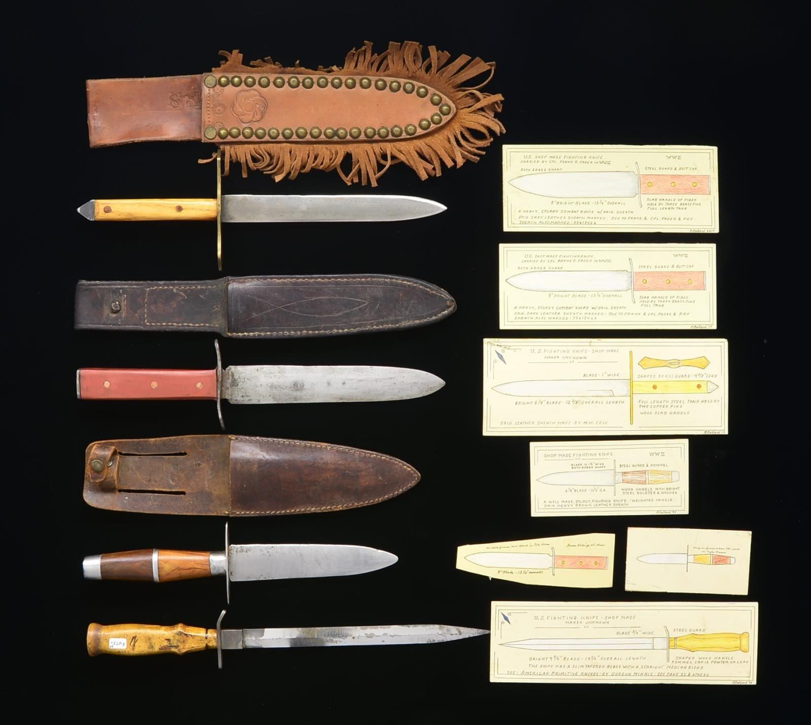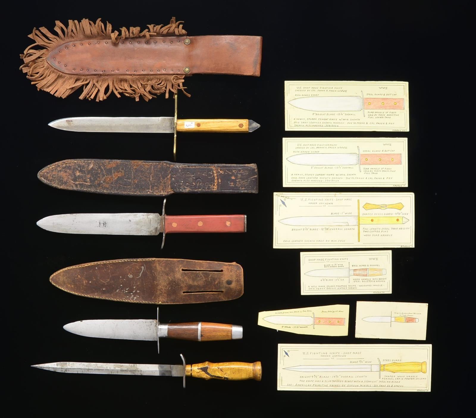 1) Overall length: 15 3/4". Unmarked stiletto type blade w/ raised medial ridge. Steel crossguard w/ a single down turned end. Solid light colored wooden grip. No sheath. CONDITION: knife shows light to moderate wear overall. 2) Overall length: 13 1/2". Plain unmarked blade. Lg. brass crossguard. 2 Piece wooden grip attached w/ 2 copper rivets on each side. Skull crusher pommel. Brown leather sheath having fringed edges & tooled & tack decoration. CONDITION: knife & sheath show light wear overall. 3) Overall length: 13 1/8”. Plain dbl. edged blade. Iron crossguard & pommel cap. 2 Piece red composition grips held on by 3 copper rivets on each side. Dark brown leather sheath w/ tooled decoration on the front. The back is marked, “F.R.F.” & “Joe to Frank 35613026 Cpl. Fader.”. CONDITION: knife & sheath show light to moderate wear overall. 4) Overall length: 11 1/2". Plain unmarked dbl. edged blade. Steel crossguard, pommel, ferrule & spacer. 2 Piece cylindrical wood grip apparently of lignum vitae. Brown leather sheath. CONDITION: knife & sheath show light to moderate wear overall. PROVENANCE: Collection of Roger Ballard. (02-14709-26/BF). $700-1,000.
