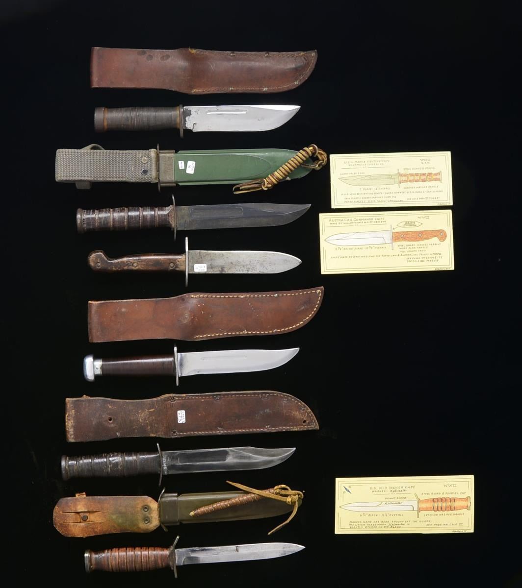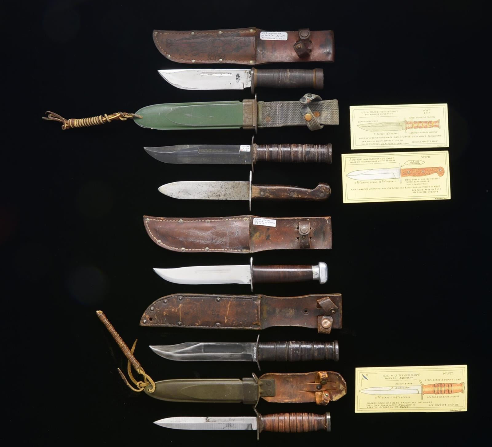 1) COMMANDO KNIFE. Overall length: 10 5/8”. Bright blade marked at the ricasso, “CATTARAUGUS 225Q”. Steel crossguard & pommel. Stacked leather washer grip. Leather sheath w/ bare breasted hula girl holding flowers adorning the front w/ the words, “NEW GUINEA” at her feet. CONDITION: blade is bright but shows evidence of sharpening. Oxidation on guard & pommel. Grip shows moderate wear. Sheath shows light wear w/ easily discernable decoration. 2) FIGHTING KNIFE. Overall length: 11”. Bright unmarked blade. Bright steel crossguard. Aluminum pommel. Stacked leather washer grip. Leather sheath. Front of scabbard adorned w/ a nude female gazing skyward w/ her hands in the air. CONDITION: knife & sheath show very light wear. 3) USMC M2 FIGHTING KNIFE. Overall length: 12”. Parkerized blade is marked at the ricasso, “USMC” on 1 side & “KA-BAR” on the other. Steel crossguard & pommel. Stacked leather washer grip. Leather sheath stamped, “RL” on the front. CONDITION: blade & scabbard show light to moderate wear. 4) US M3 TRENCH KNIFE. Overall length: 11 1/2". Bright blade marked horizontally near the spine, “Kutmaster MADE IN U.S.A.”. Steel crossguard & pommel. Stacked leather washer grip. Sheath appears to be an unmarked USN MK2 style having a leather belt loop & hanger w/ composite base. CONDITION: knife & sheath show light wear overall. 5) USN MK2 KNIFE. Overall length: 12”. Parkerized unmarked blade. Steel crossguard marked on the underside, “U.S.N MARK 2 CAMILLUS, N.Y.”. Steel pommel. Stacked leather washer grip. USN MK2 scabbard. CONDITION: knife shows light wear overall. 6) AUSTRALIAN COMMANDO KNIFE. Overall length: 11”. Unmarked blade. Steel crossguard marked on the underside, “U.S. 1944 WHITTINGSLOWE”. 2 Piece wood grip w/ 3 steel rivets on each side. No sheath. CONDITION: knife shows significant wear overall. Blade has a gray finish w/ some mottling. Grip has scattered scuffs & scrapes. PROVENANCE: Collection of Roger Ballard. (02-14709-27/BF). $800-1,100.