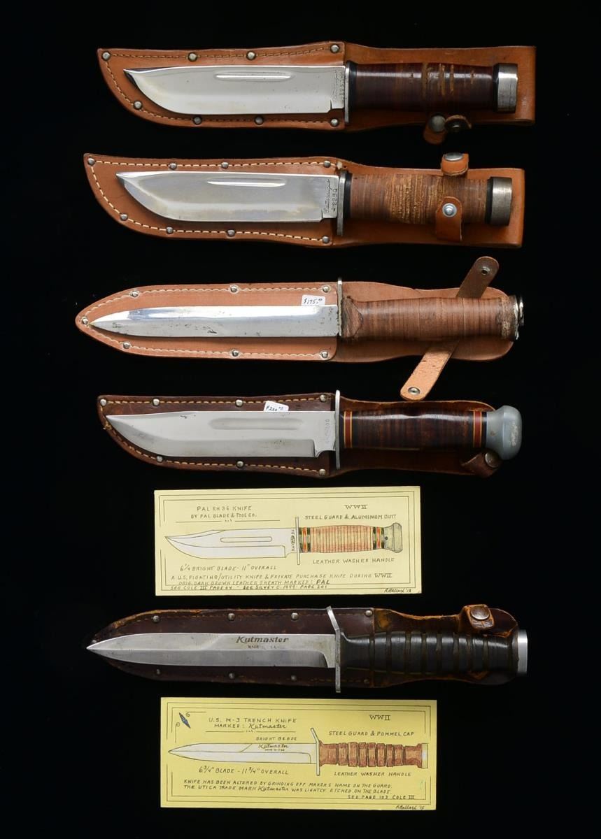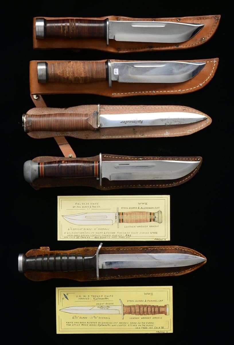 1) TRENCH KNIFE. Overall length: 12” to top of ring. Bright blade marked horizontally on the side, “KUTMASTER MADE IN USA”. Bright steel crossguard & pommel w/ lanyard ring. Stacked leather washer grip. Leather sheath. This knife is thought to have been made by Utica in the 1960s & was called their “H1200”. The knife was made from left over WWII M1 bayonet parts assembled to leather handles. CONDITION: knife shows light wear overall. Sheath is as issued. 2) M3 TRENCH KNIFE. Overall length: 11 5/8”. Bright blade marked horizontally on the side, “KUTMASTER MADE IN USA”. Bright steel crossguard & pommel. Stacked leather washer grip. Leather sheath. CONDITION: knife shows very light wear. Sheath shows moderate wear. 3) PAL RH36 KNIFE. Overall length: 11”. Bright blade marked at the ricasso, “RH-36PAL MADE IN U.S.A.”. Steel crossguard w/ gray metal pommel. Stacked leather washer grip. Leather sheath marked, “PAL The Hallmark of Fine Cutlery”. CONDITION: knife shows very light wear. Sheath shows light wear. 4) COMMANDO KNIFE. Overall length: 10 5/8”. A fine example of the Cattaraugus Commando knife w/ a bright blade marked at the ricasso, “CATTARAUGUS 225Q”. Bright steel crossguard & pommel. Stacked leather washer grip. Leather sheath. CONDITION: knife shows very light wear w/ the exception of some abrasions to the grip which may have been put in purposely to retard slipping. Sheath shows light wear. 5) COMMANDO KNIFE. Overall length: 10 5/8”. A fine example of the Cattaraugus Commando knife w/ a bright blade marked at the ricasso, “CATTARAUGUS 225Q”. Bright steel crossguard & pommel. Stacked leather washer grip. Leather sheath. CONDITION: knife shows very light wear. Sheath also shows very light wear. PROVENANCE: Collection of Roger Ballard. (02-14709-29/BF). $700-1,000.