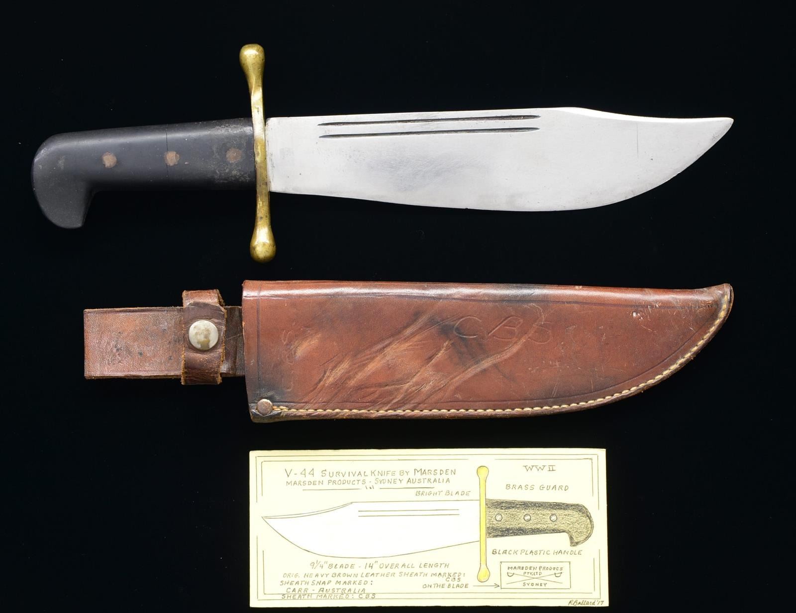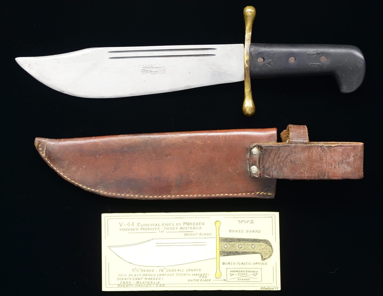 Overall length: 13 7/8”. Blade length: 9 1/8”. A beautiful example of the V-44 survival knife by an exceptionally rare maker. The bowie style blade has 2 narrow fullers at the top of each side. Blade is marked, “MARSDEN PRODUCTS PTY LTD (crossed sabers) SYDNEY”. Brass crossguard. Black plastic grip w/ 3 rivets on each side. Brown leather sheath w/ hand applied initials “C.B.S” at the throat. CONDITION: blade appears to have some original factory polish but shows sharpening at the edge. Grips show light to moderate wear. Sheath shows light wear. PROVENANCE: Collection of Roger Ballard. (02-14709-3/BF). $800-1,200.