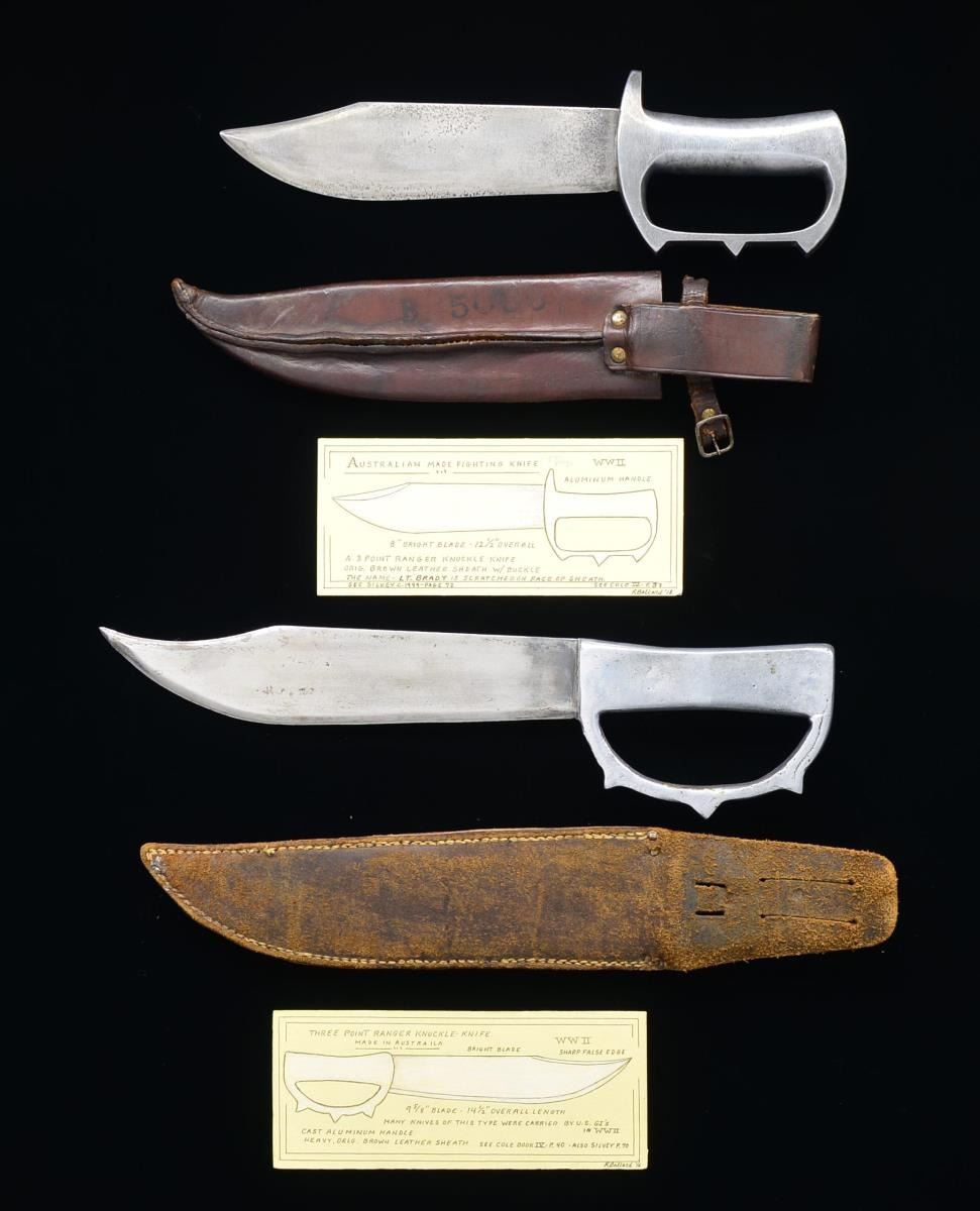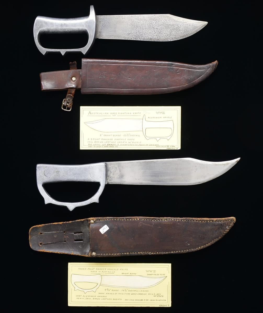 1) 3 POINT RANGER KNUCKLE KNIFE. Overall length: 14 1/2". Blade length: 9 1/2". A scarce example of a WWII knuckle knife associated w/ Ranger units. Flat unmarked blade. Cast aluminum grip w/ 3 triangular raised “points” around the handguard. Brown leather sheath. These knives are known to have been made in Australia & used widely by American GIs. CONDITION: blade has a light gray finish w/ some evidence of sharpening. Hilt show slight overall wear. Sheath shows light to moderate wear. 2) FIGHTING KNIFE. Overall length: 12 1/2”. Blade length: 8”. A scarce example of a WWII knuckle knife often used by Ranger units. Flat unmarked blade. Cast aluminum grip w/ 3 triangular raised “points” around the handguard. Brown leather sheath. The sheath has the name, “LT. BRADY” scratched onto the front. These knives are known to have been made in Australia & used widely by American GIs. CONDITION: blade has a medium gray finish w/ areas of cleaned, light pitting. Hilt show slight overall wear. Sheath generally shows light wear however the securing strap is broken. PROVENANCE: Collection of Roger Ballard. (02-14709-4/BF). $900-1,300.